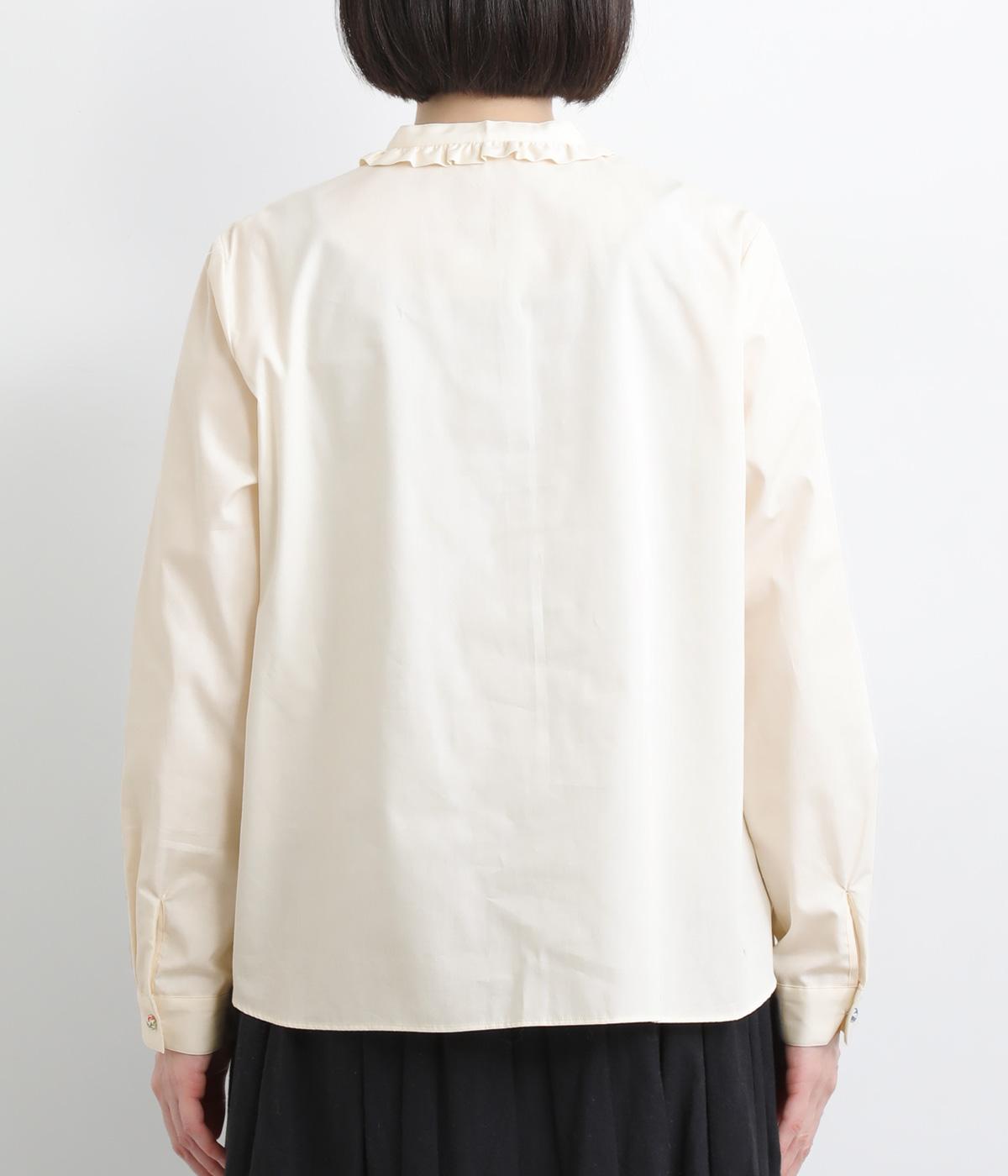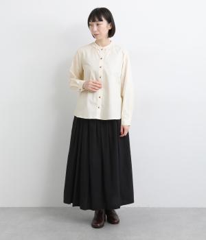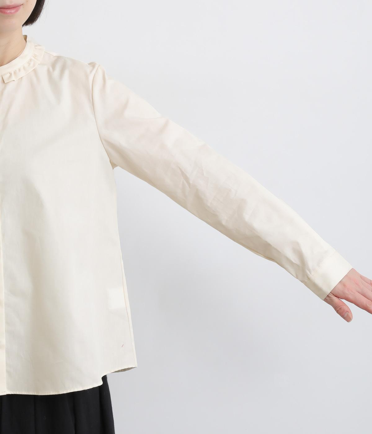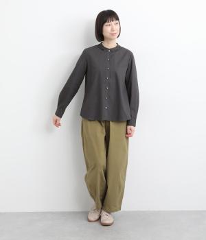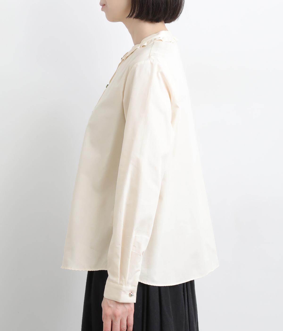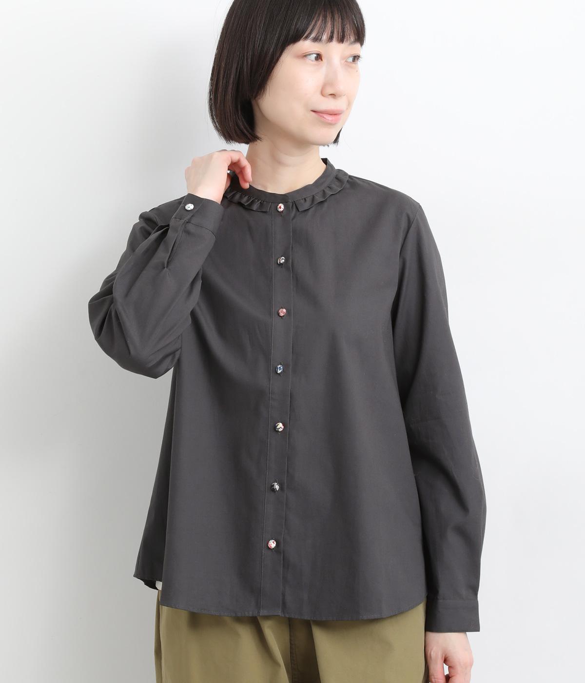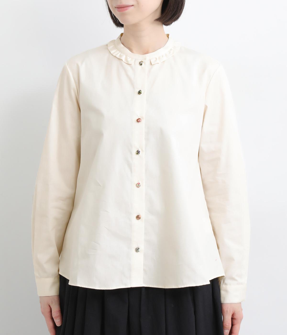 女性らしいノーカラーに細幅のフリルを添え、ほどよい甘さと上品さのある印象に仕上げました。リバティプリントのくるみボタンがアクセントとなり、シンプルなデザインに可憐な彩りをプラス。タックを寄せた袖口が自然なボリュームを生み、ゆったりとした着心地ながら美しいシルエットを叶えます。