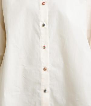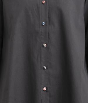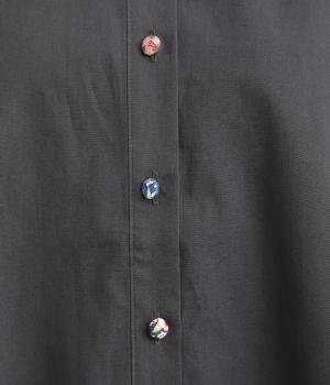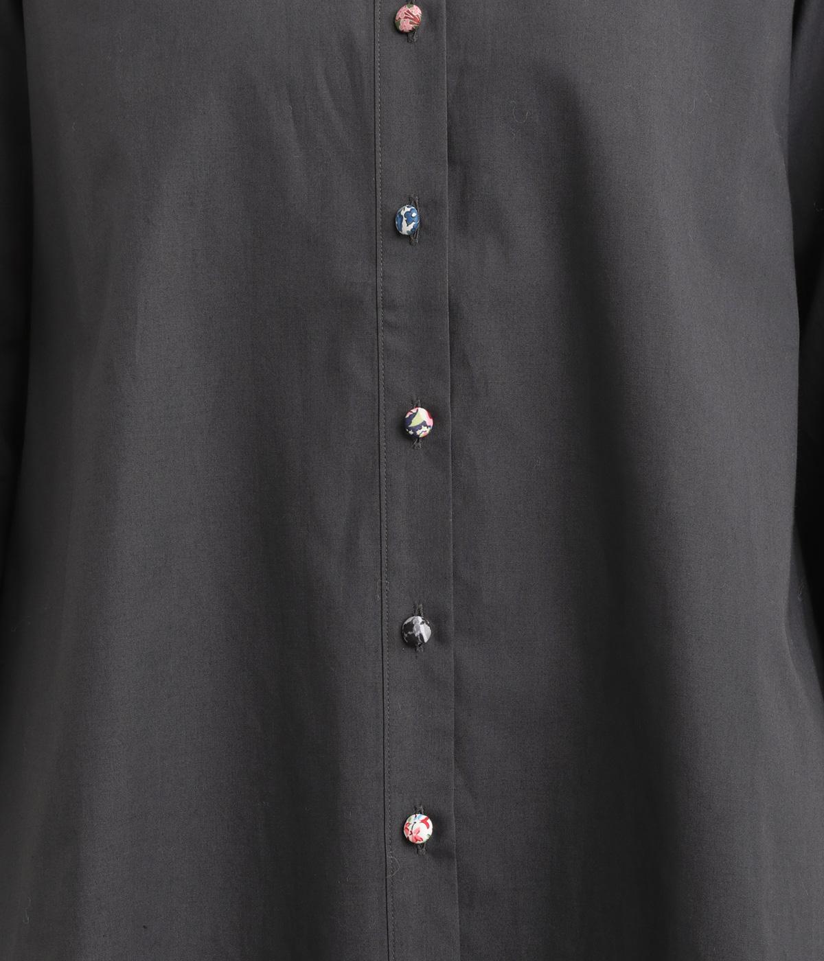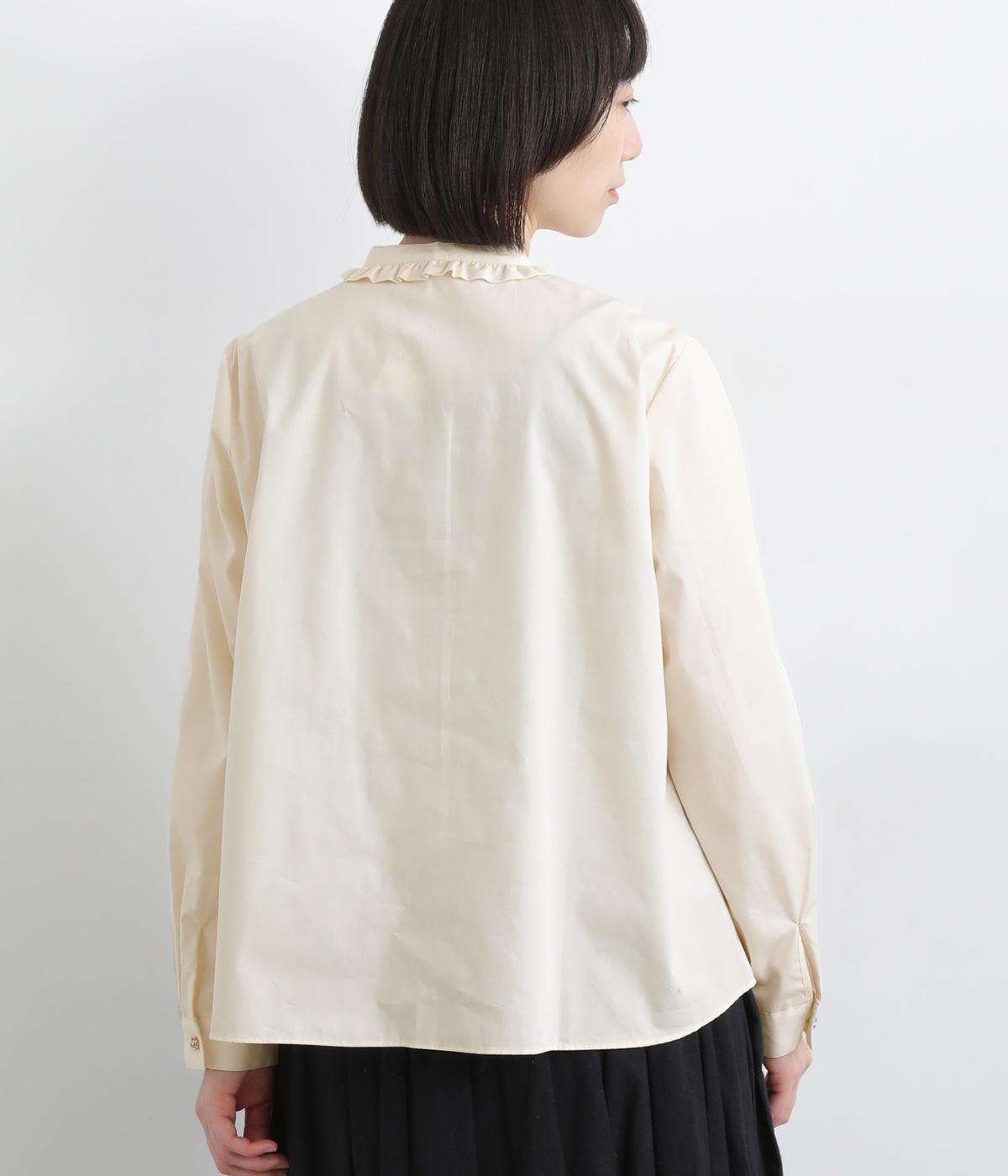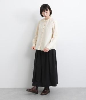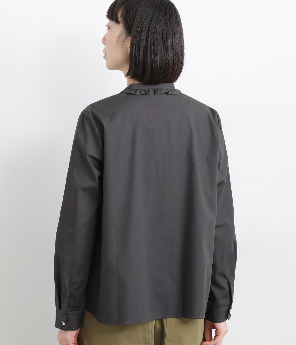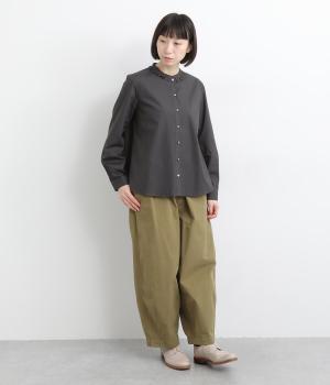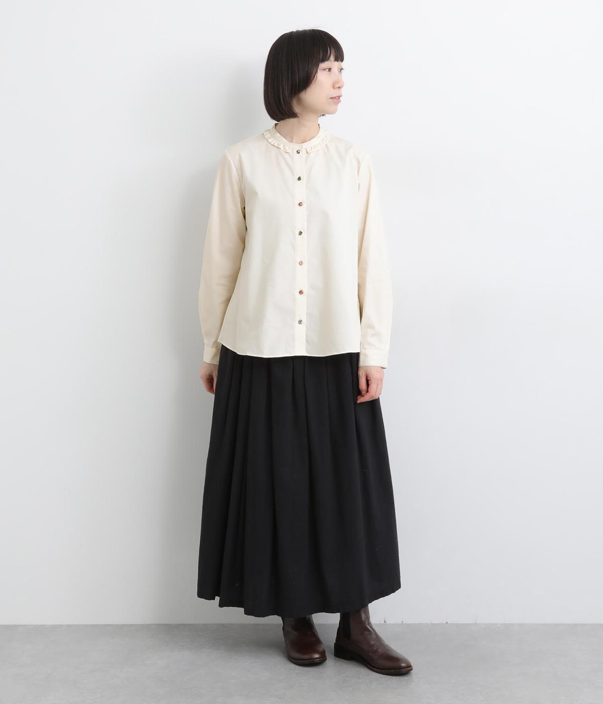 女性らしいノーカラーに細幅のフリルを添え、ほどよい甘さと上品さのある印象に仕上げました。リバティプリントのくるみボタンがアクセントとなり、シンプルなデザインに可憐な彩りをプラス。タックを寄せた袖口が自然なボリュームを生み、ゆったりとした着心地ながら美しいシルエットを叶えます。