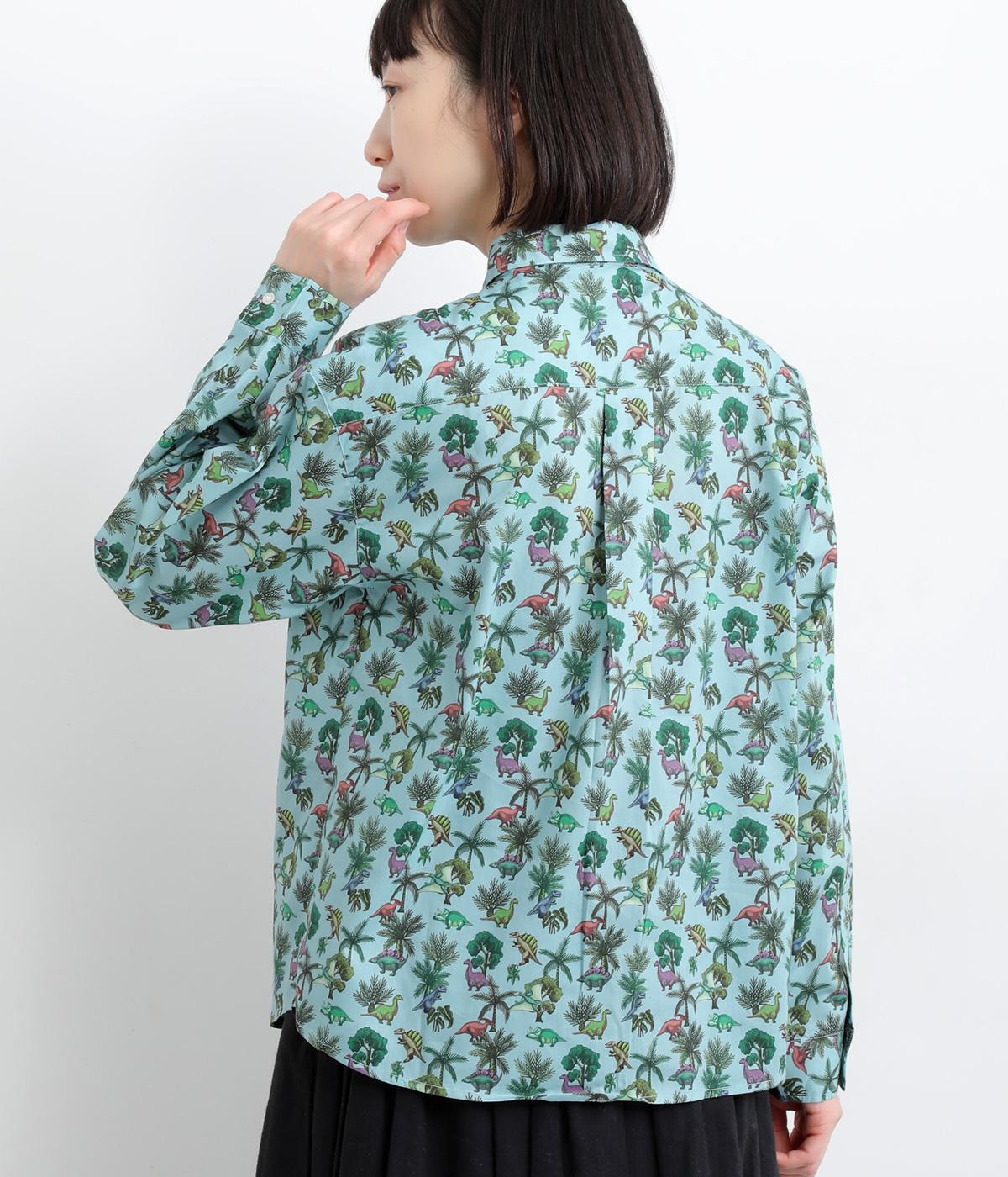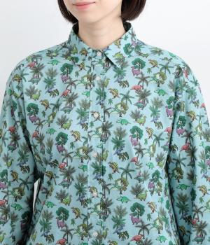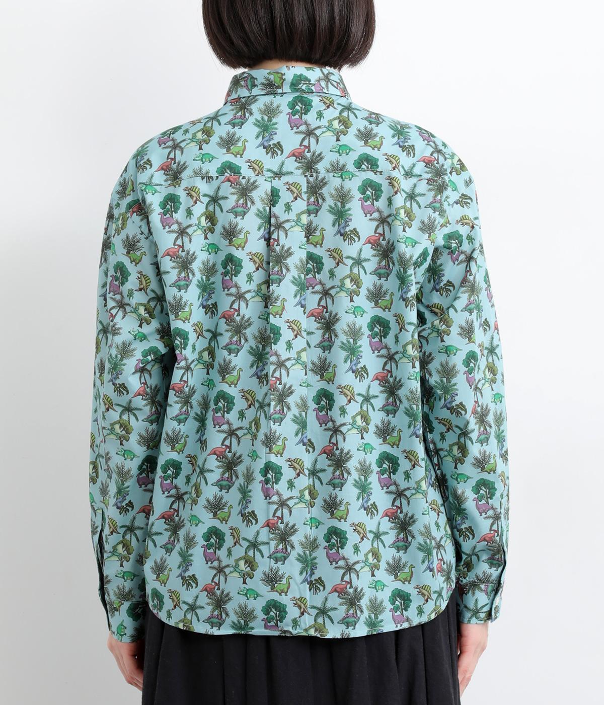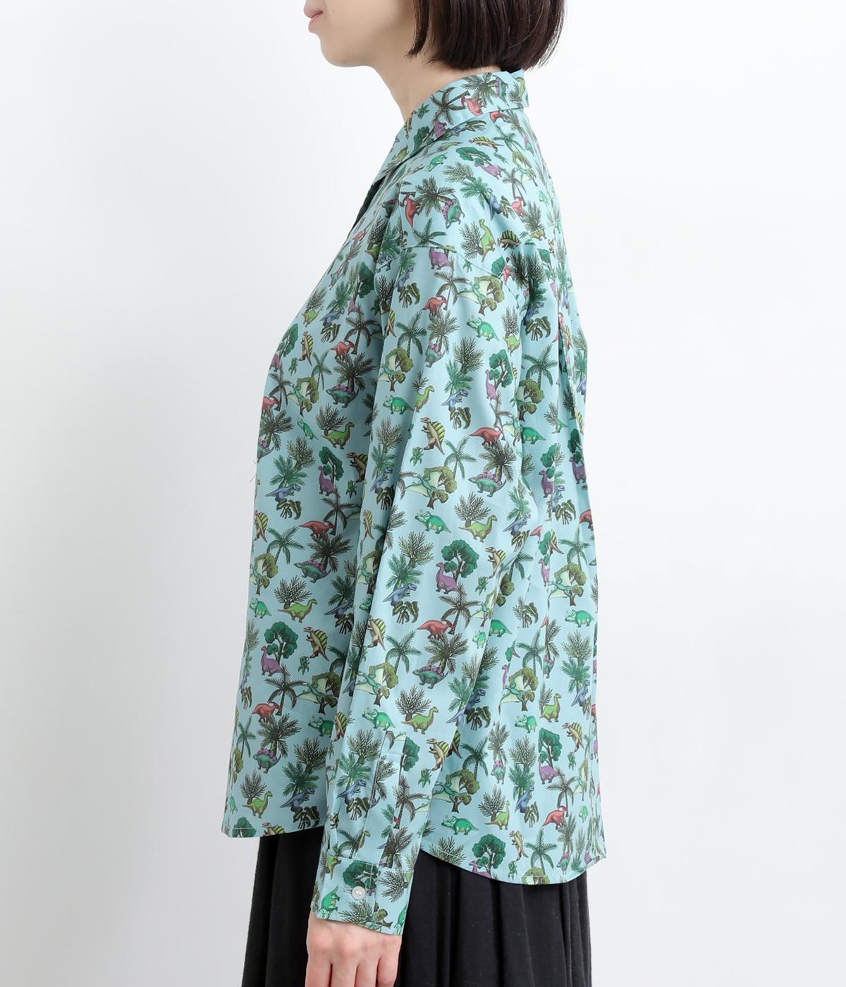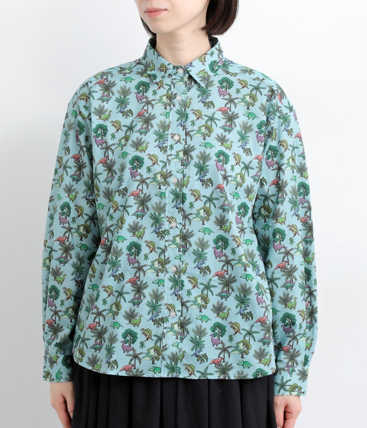 色とりどりの恐竜モチーフを散りばめた、ユニークなリバティプリントが魅力。かわいらしい表情ながら、レギュラーカラーがきちんと感を添え、大人も取り入れやすい絶妙なバランスに。シンプルなシルエットなので柄が映え、合わせるボトムを選ばない万能さもうれしいポイントです。