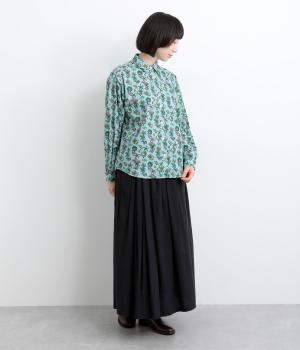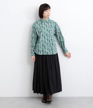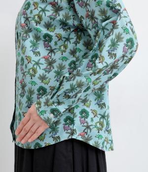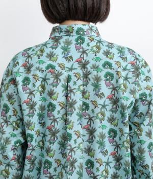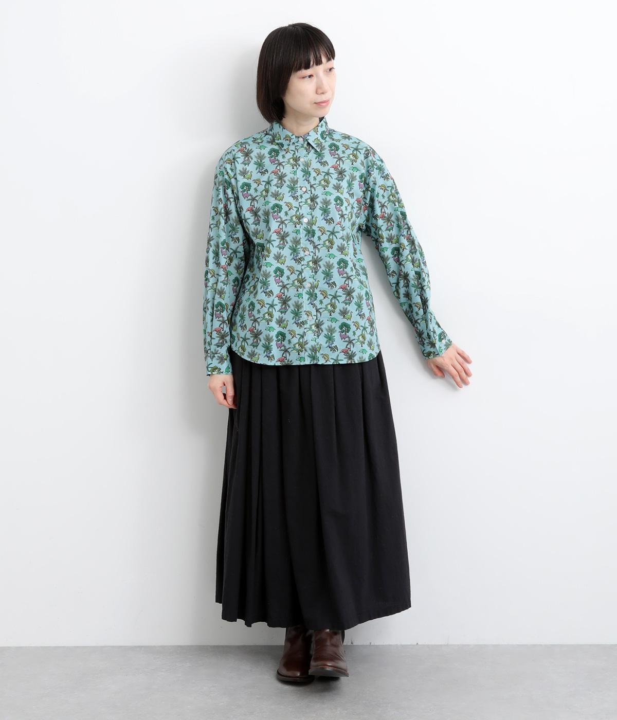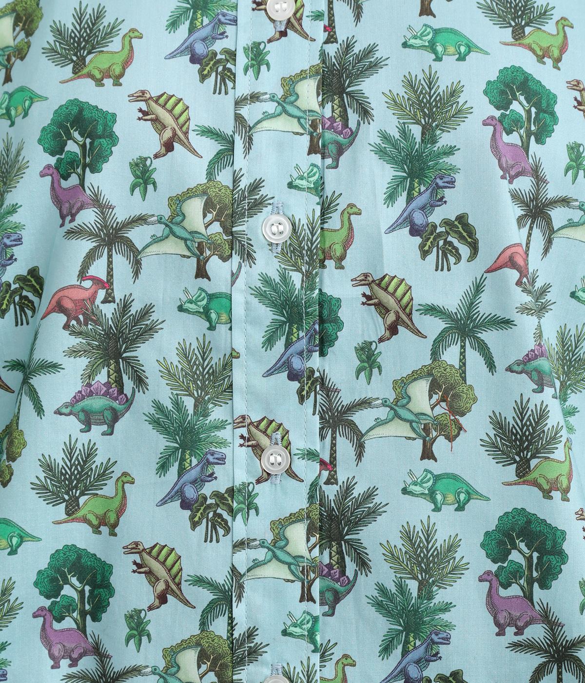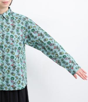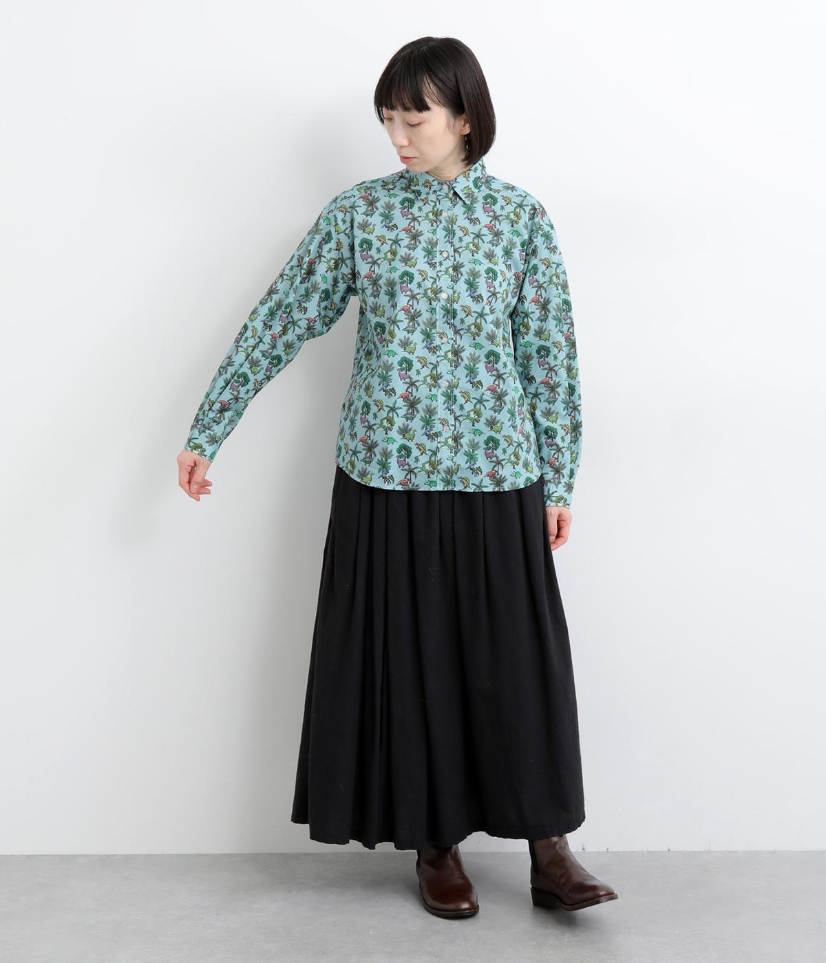 色とりどりの恐竜モチーフを散りばめた、ユニークなリバティプリントが魅力。かわいらしい表情ながら、レギュラーカラーがきちんと感を添え、大人も取り入れやすい絶妙なバランスに。シンプルなシルエットなので柄が映え、合わせるボトムを選ばない万能さもうれしいポイントです。