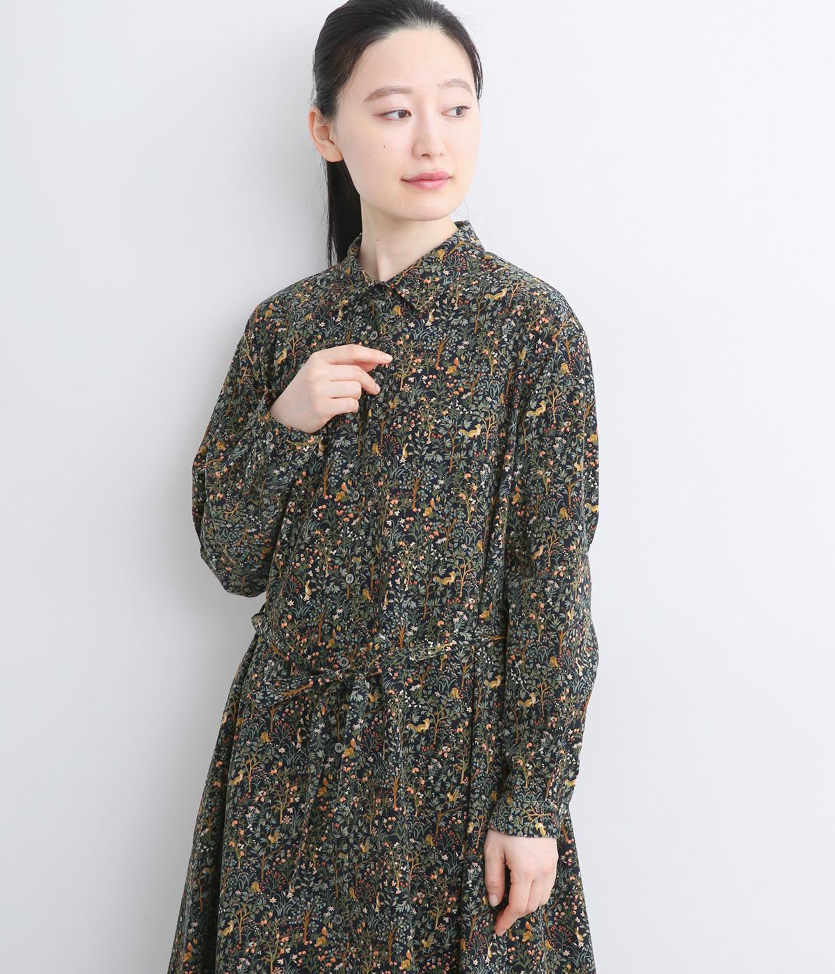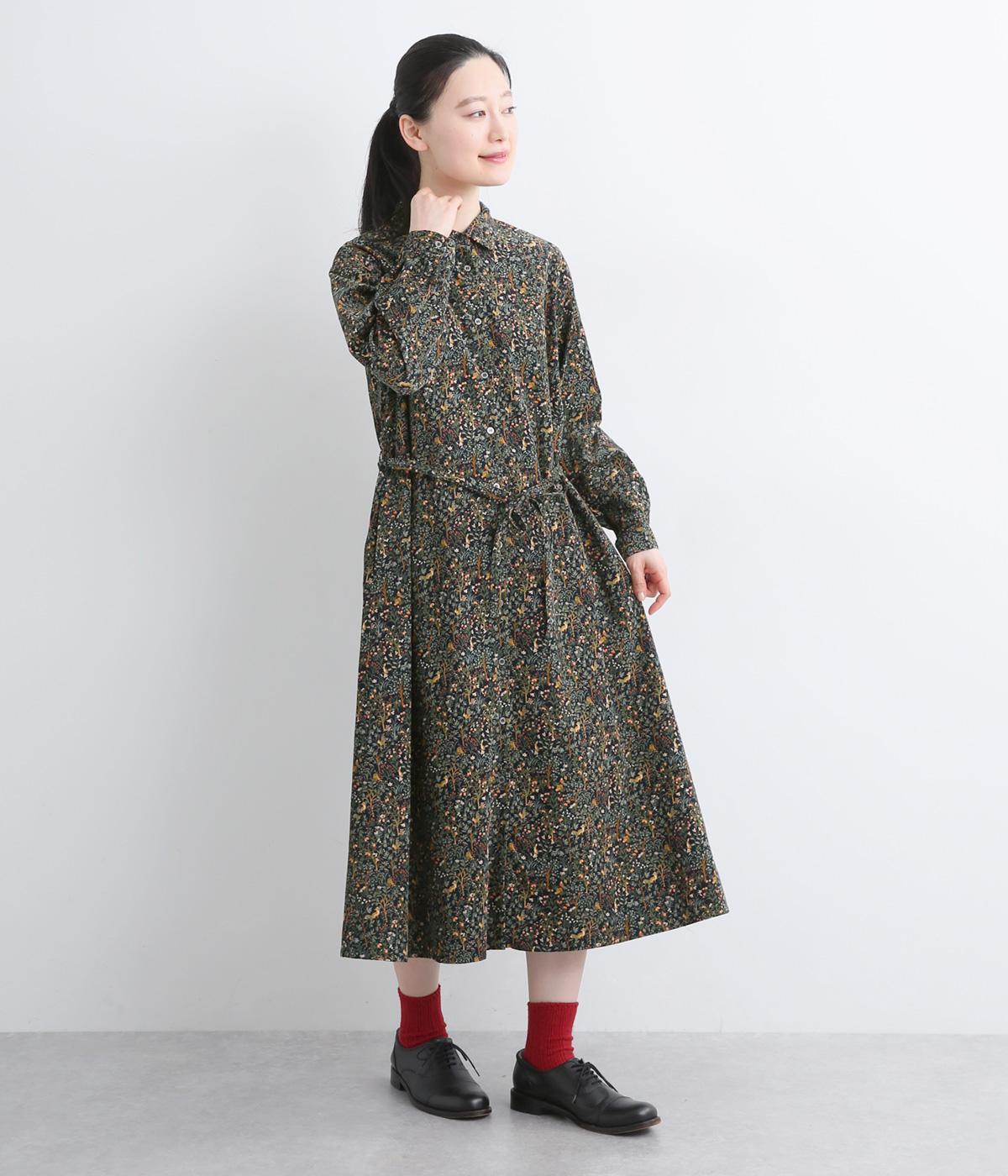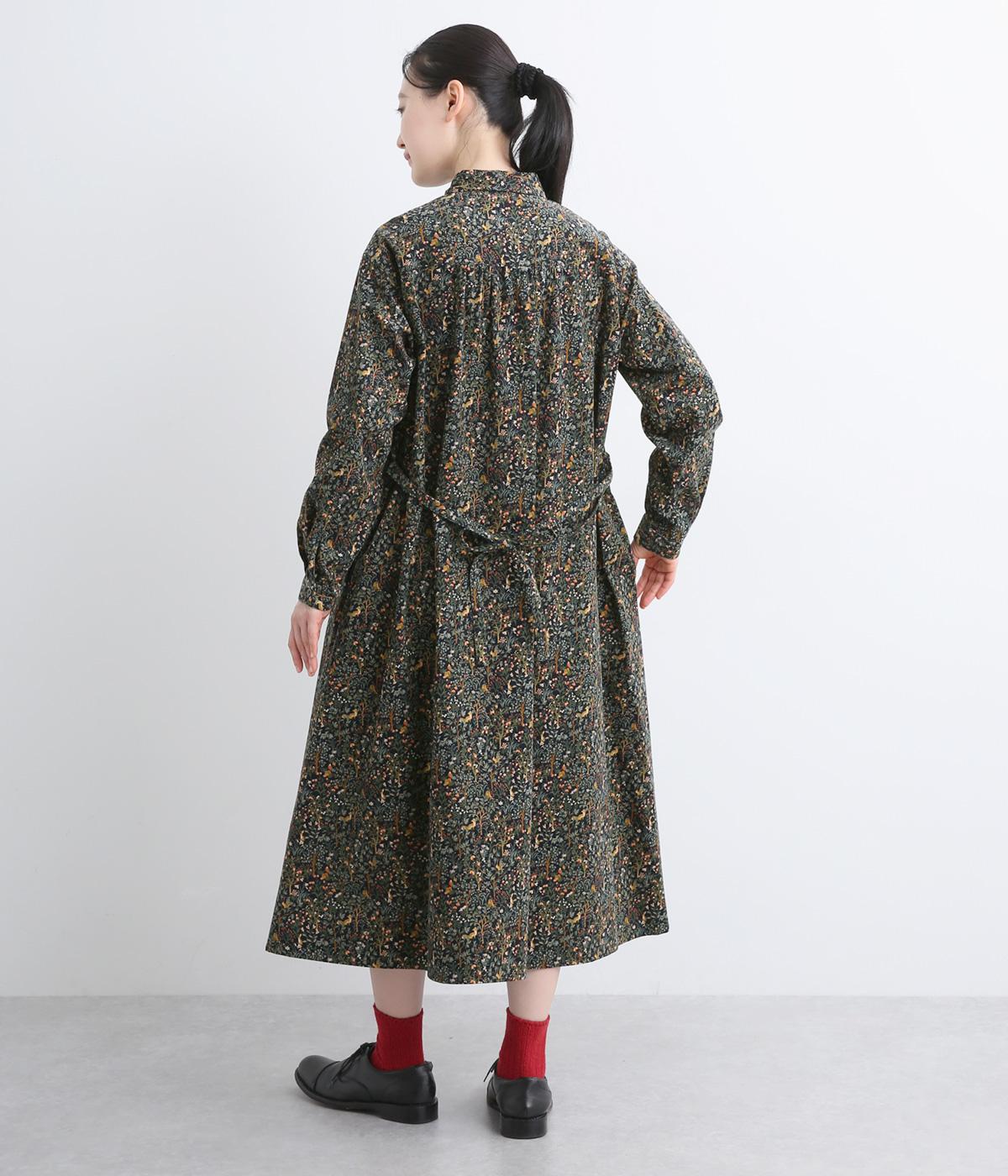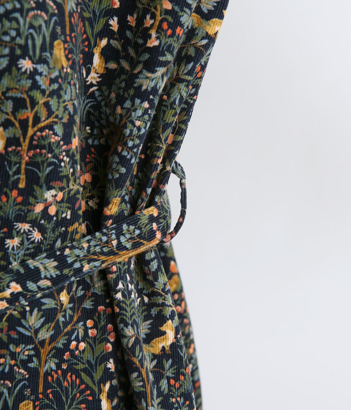 上品なAラインシルエットのワンピース。取り外し可能なウエストリボンで印象の変化も楽しめます。森の動物たちを思わせる柄を、華やかさとシックさをバランスよく仕上げ、コーディネートの主役になる一枚です。