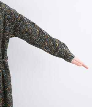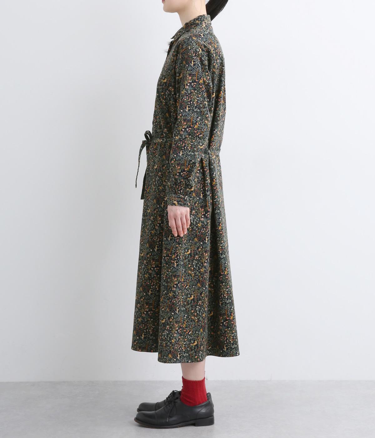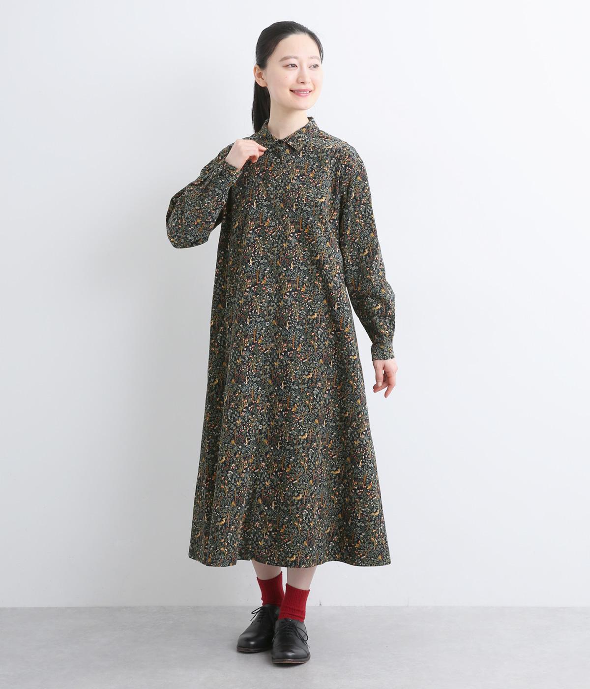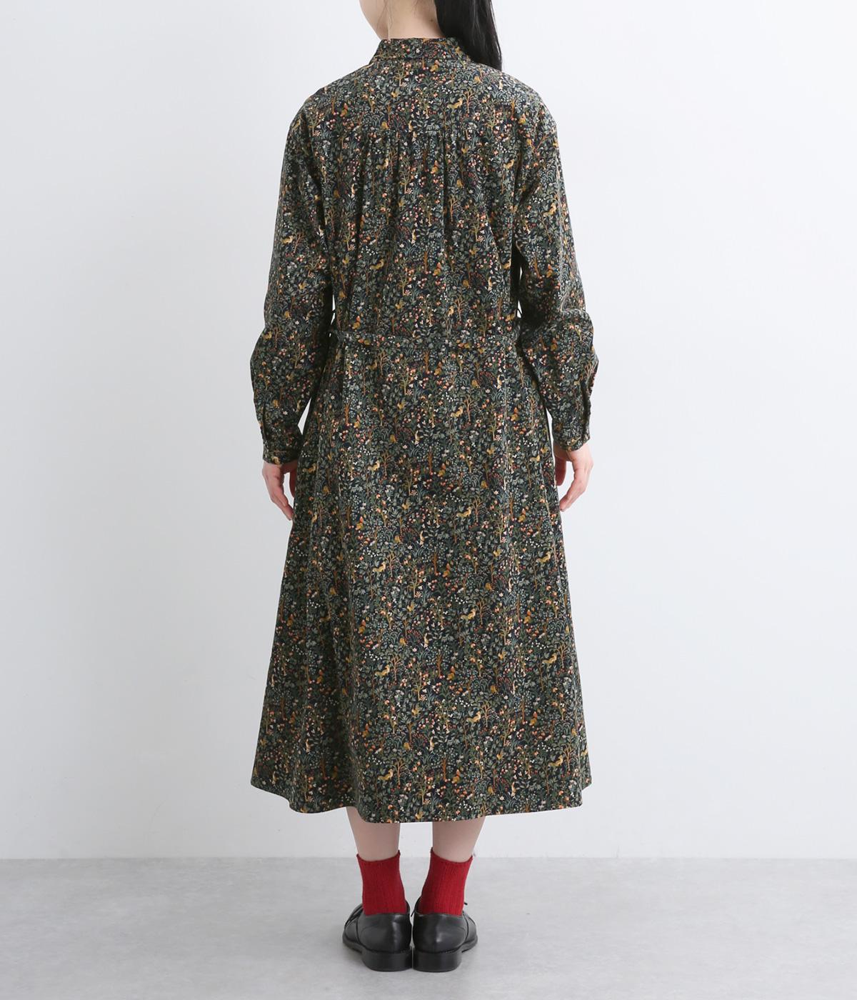 上品なAラインシルエットのワンピース。取り外し可能なウエストリボンで印象の変化も楽しめます。森の動物たちを思わせる柄を、華やかさとシックさをバランスよく仕上げ、コーディネートの主役になる一枚です。