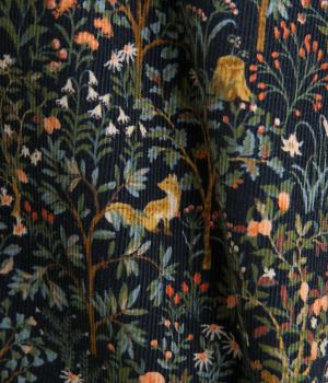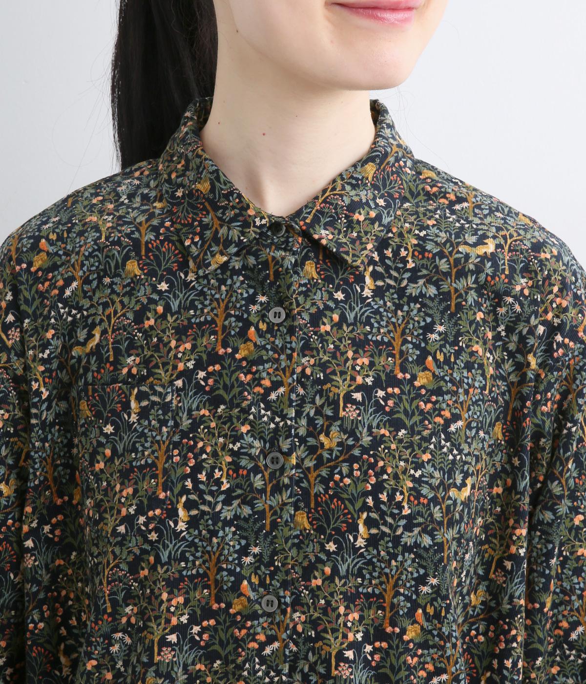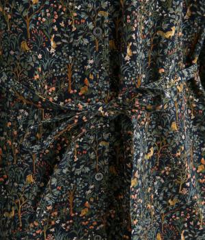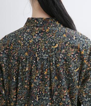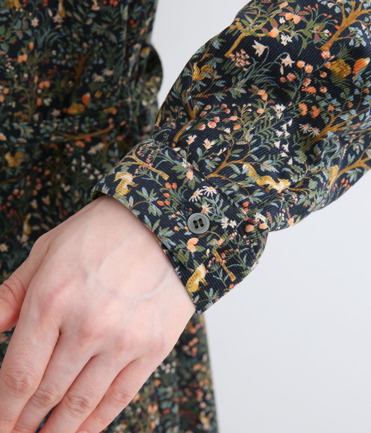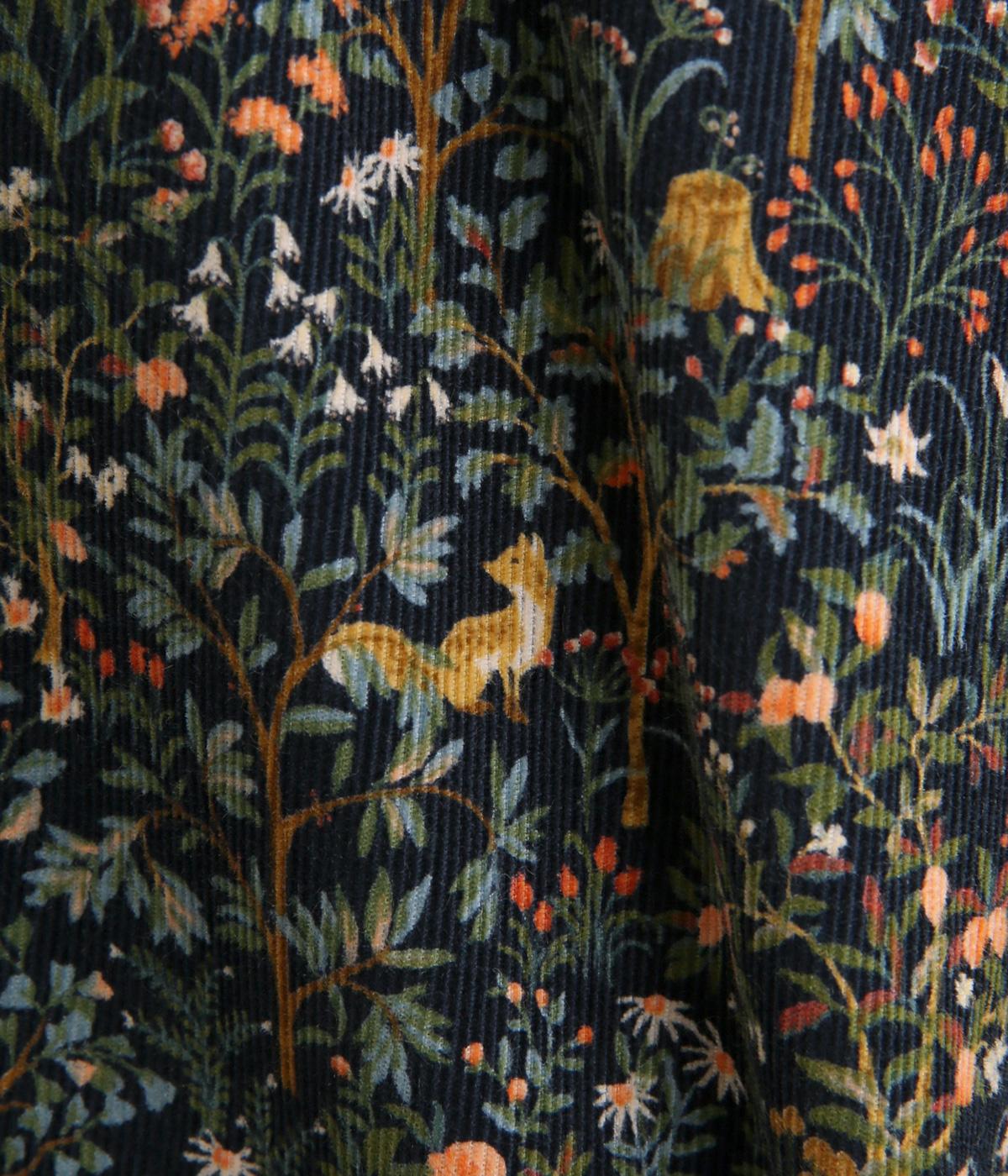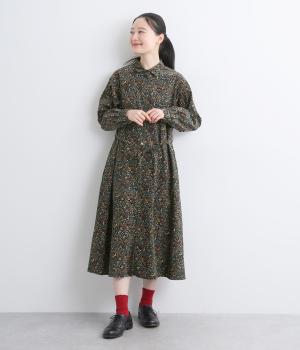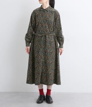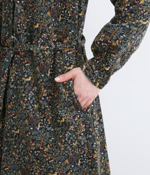 上品なAラインシルエットのワンピース。取り外し可能なウエストリボンで印象の変化も楽しめます。森の動物たちを思わせる柄を、華やかさとシックさをバランスよく仕上げ、コーディネートの主役になる一枚です。