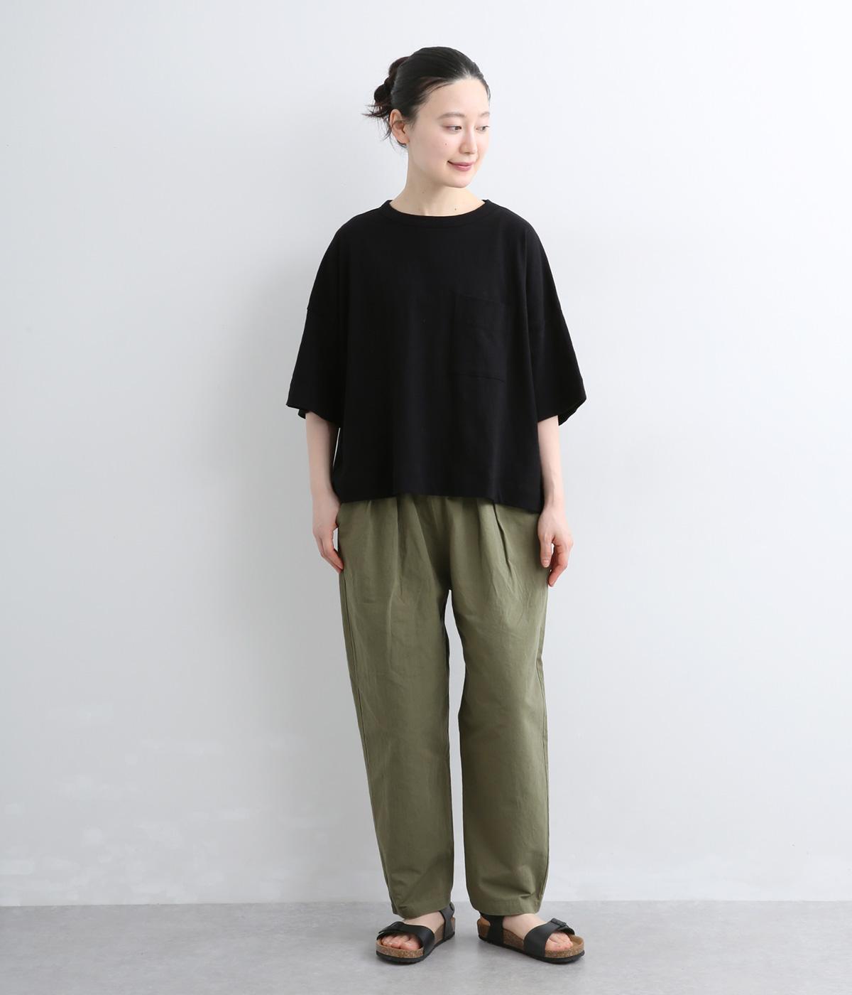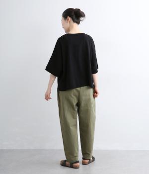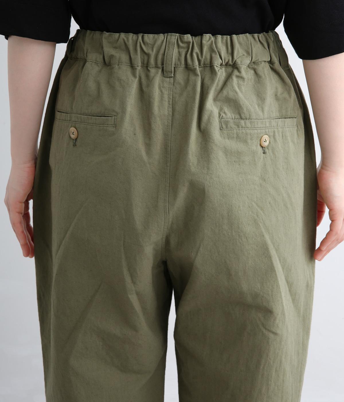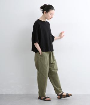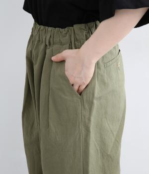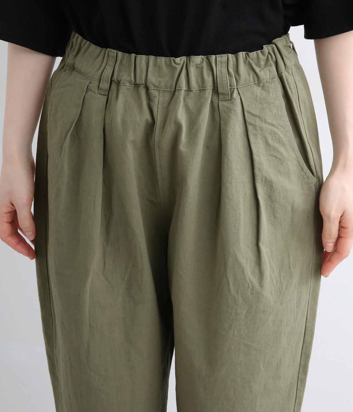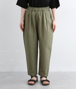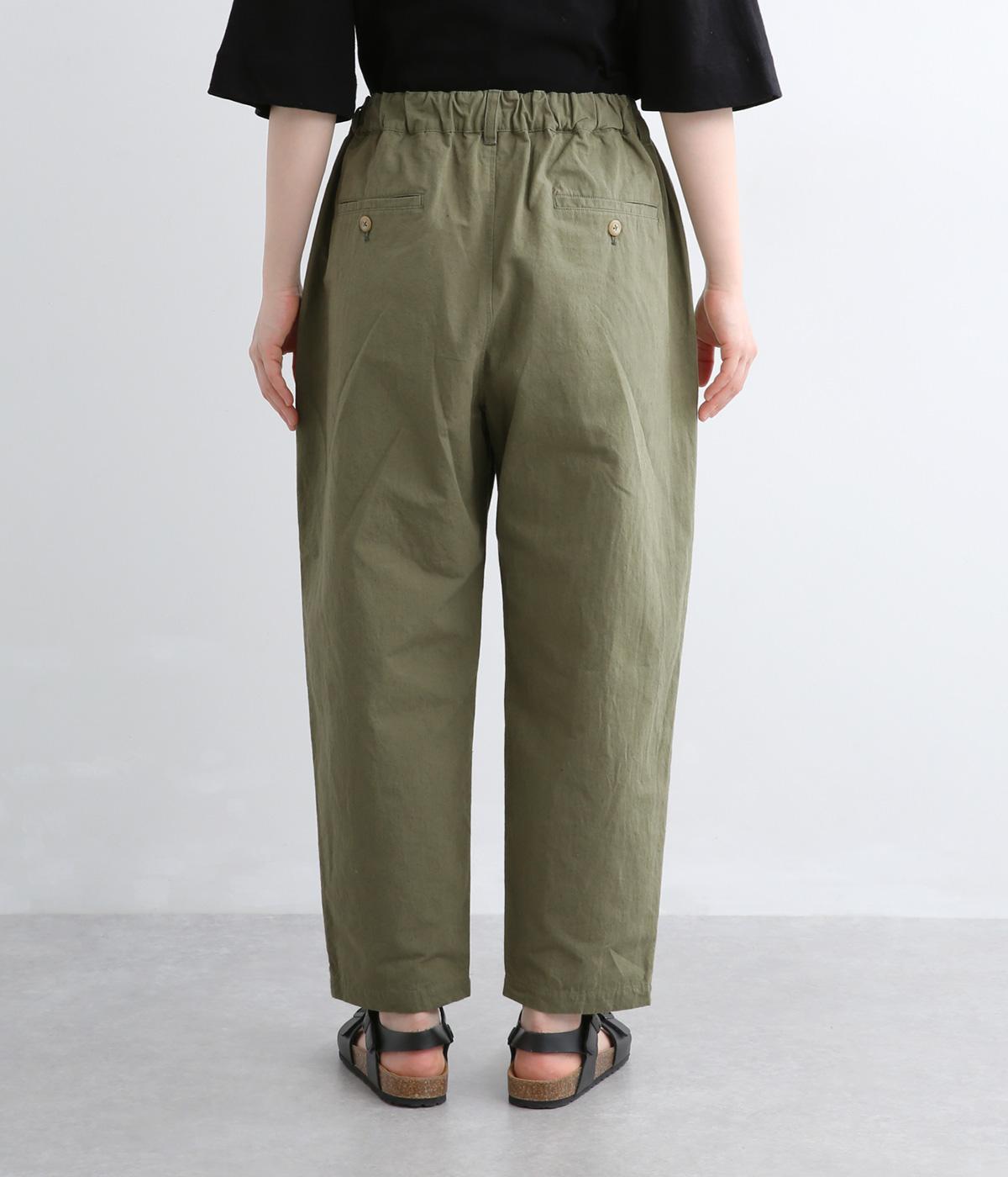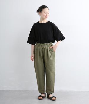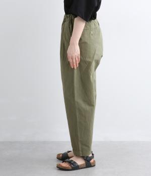 タックを入れて腰まわりはゆったりと、裾に向かってすっきりまとめたテーパードパンツ。リラックスながらもルーズに見えないシルエットが絶妙で、素材感も気持ちよくこなれた印象に。ウエストはぐるりとゴムを入れたイージー仕様でデイリー使いに最適。