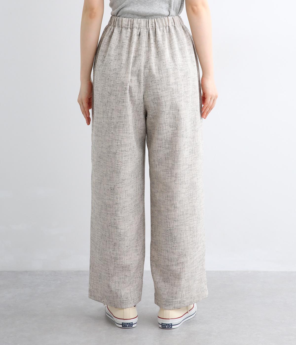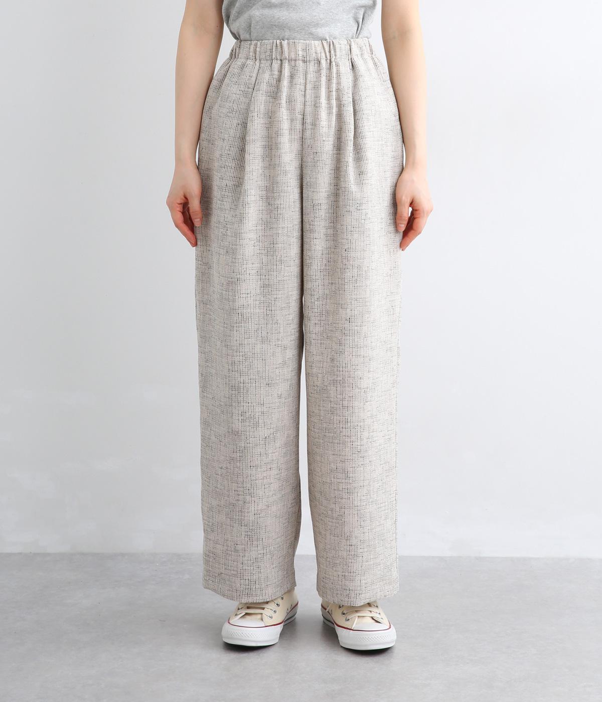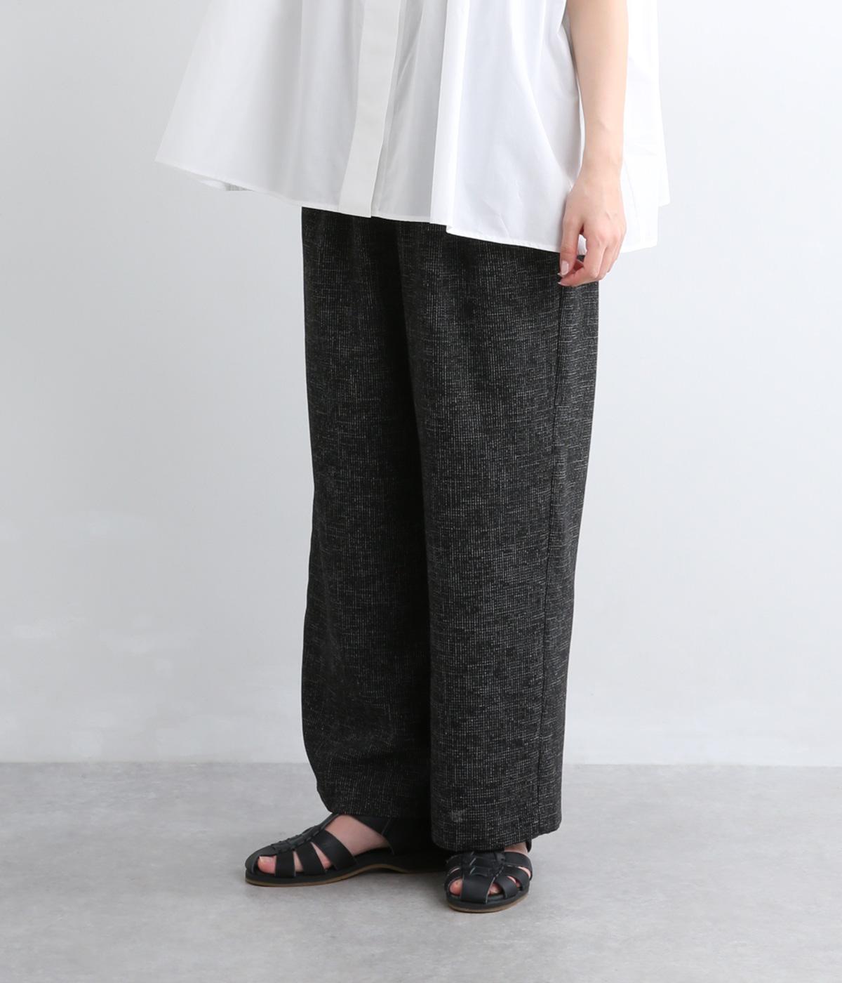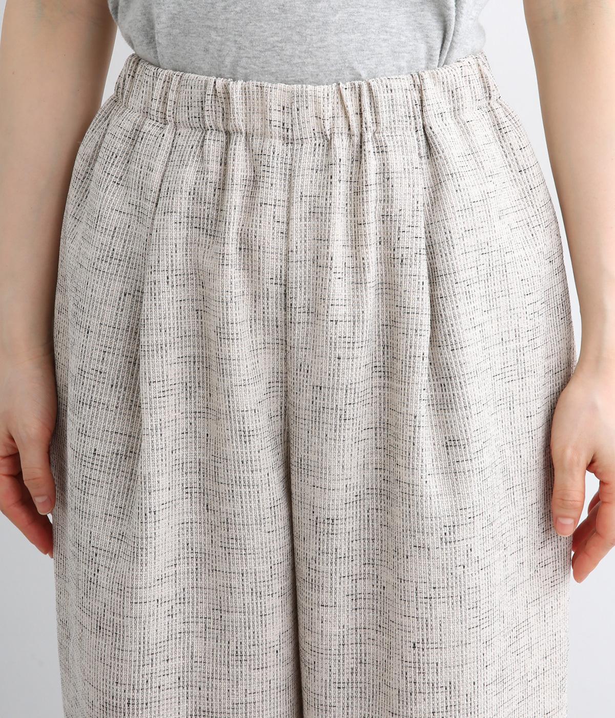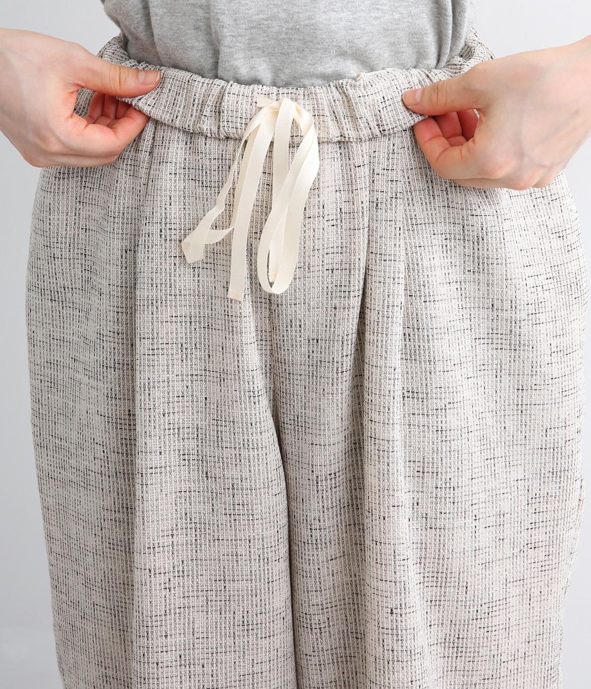 ツイード風のクラシカルな表情と軽やかさを併せ持ったパンツは、きちんと感のある装いにもラフなデイリースタイルにも活躍。タックを入れて腰まわりはゆとりを、裾はすっきりとテーパードシルエットに。ウエストは総ゴム&内紐のイージー仕様。