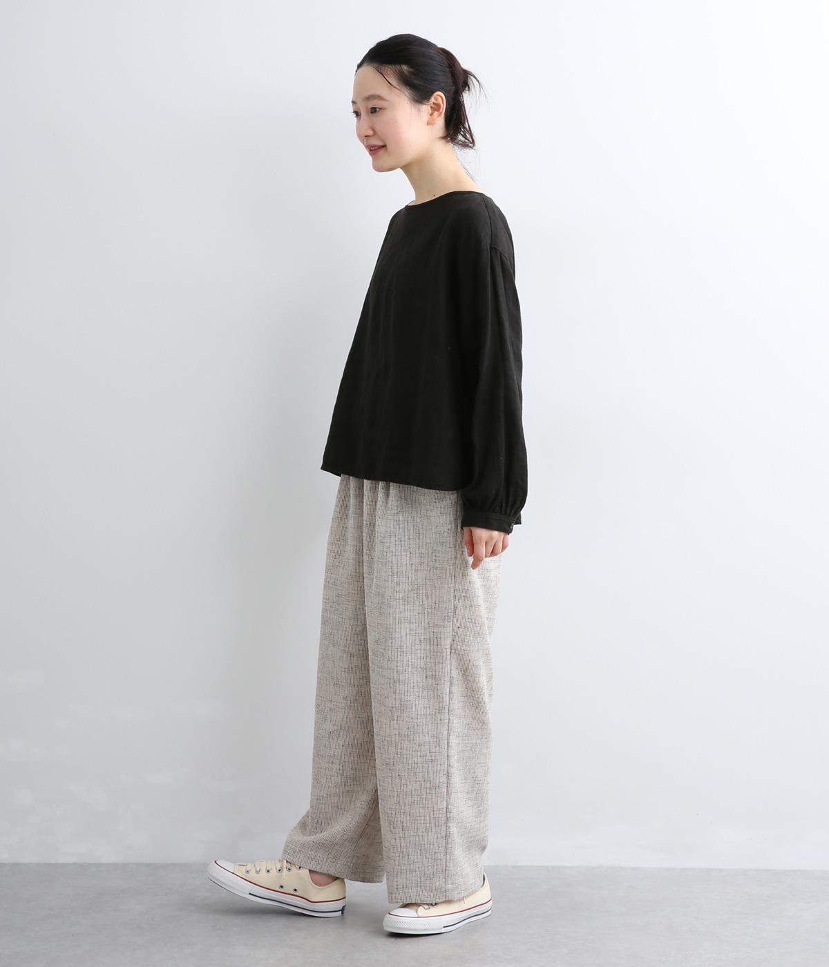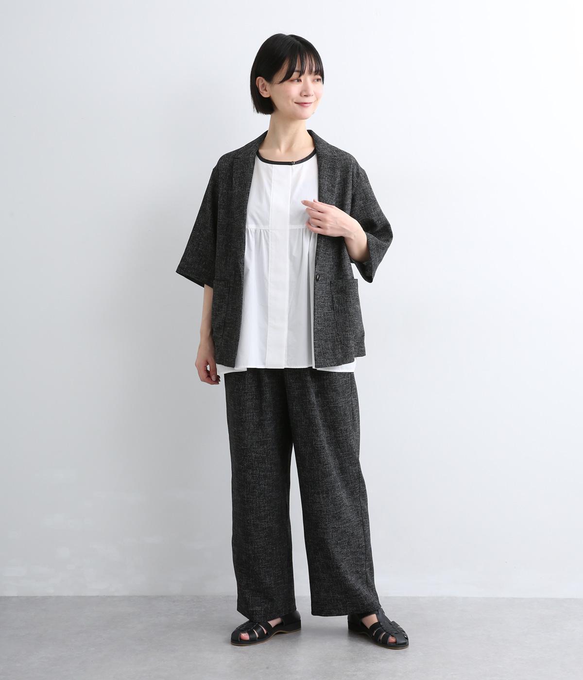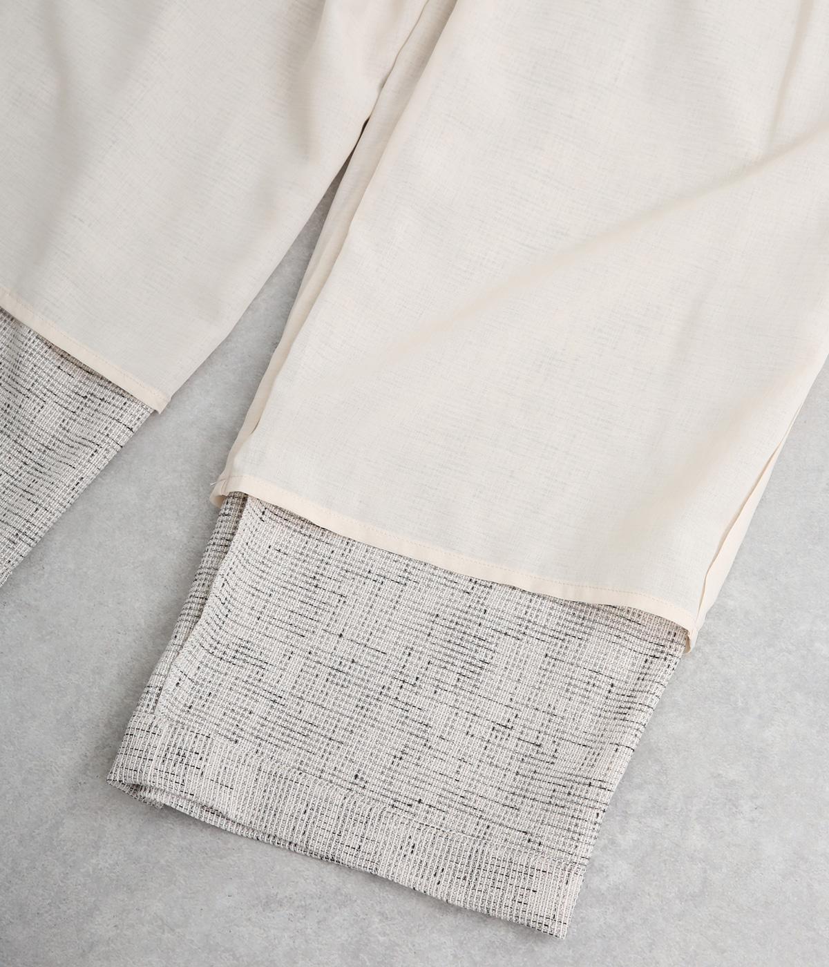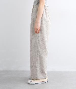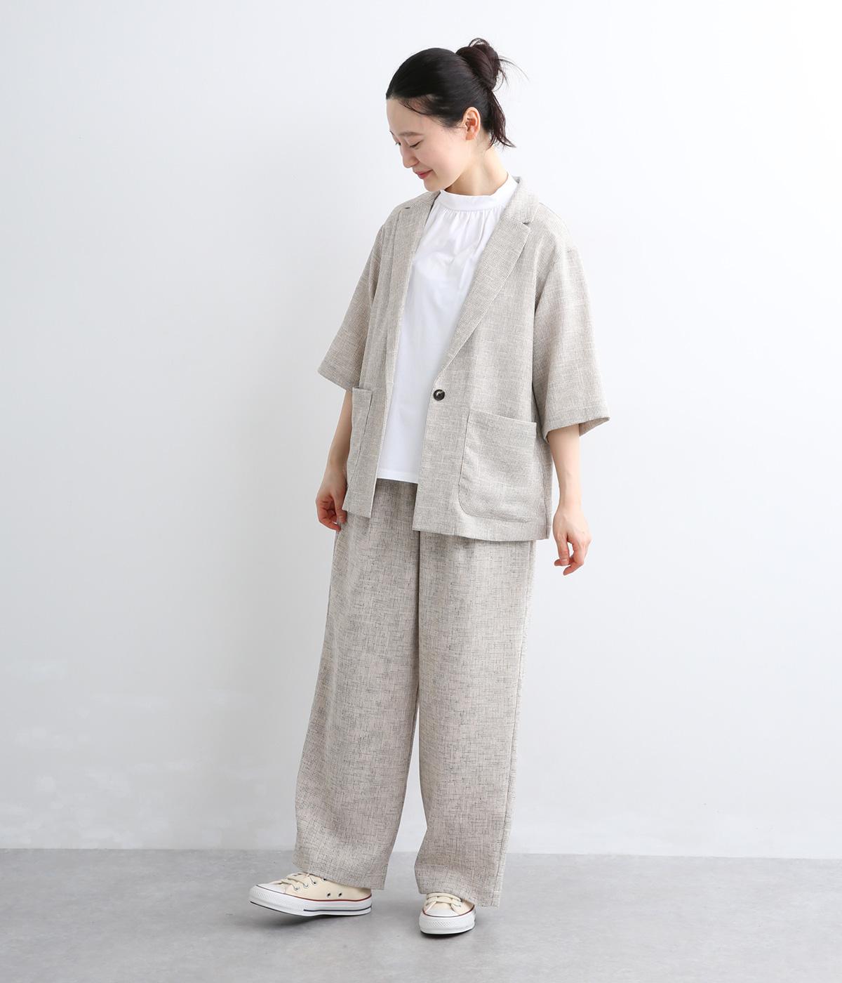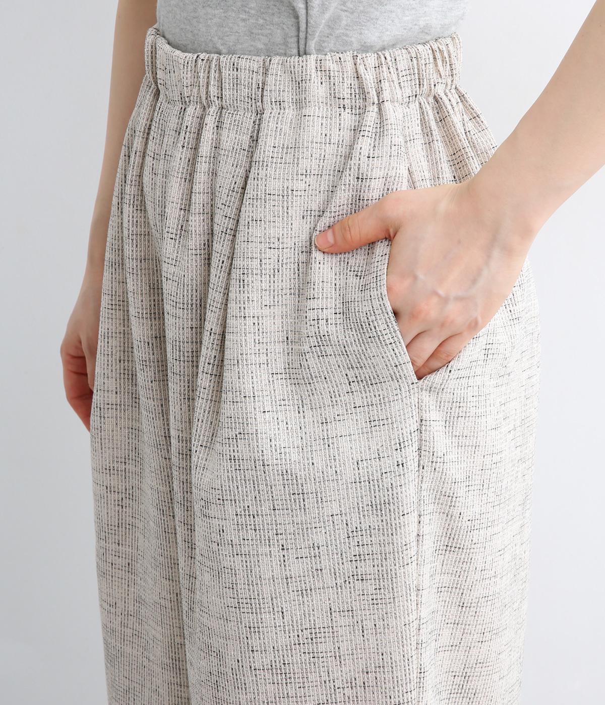 ツイード風のクラシカルな表情と軽やかさを併せ持ったパンツは、きちんと感のある装いにもラフなデイリースタイルにも活躍。タックを入れて腰まわりはゆとりを、裾はすっきりとテーパードシルエットに。ウエストは総ゴム&内紐のイージー仕様。