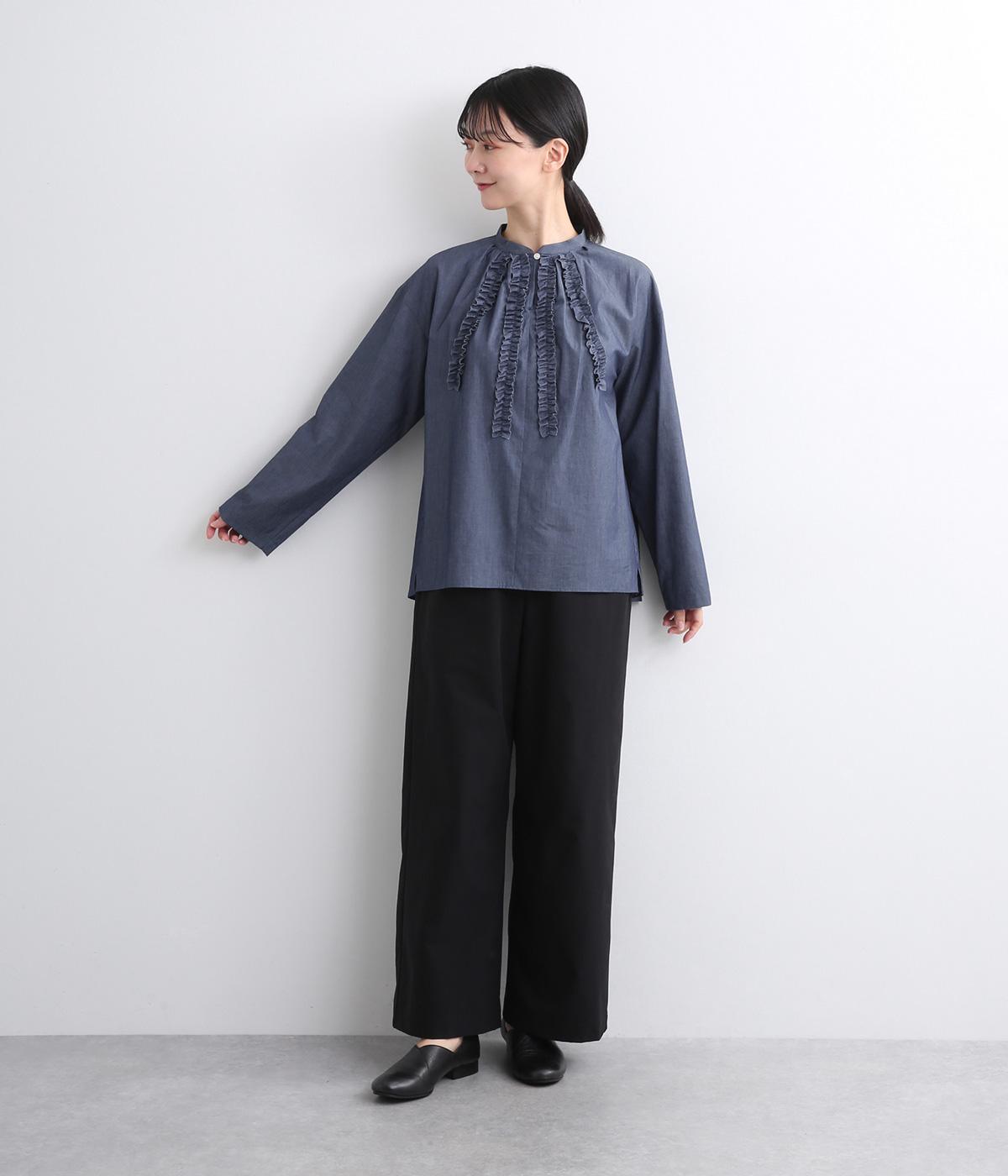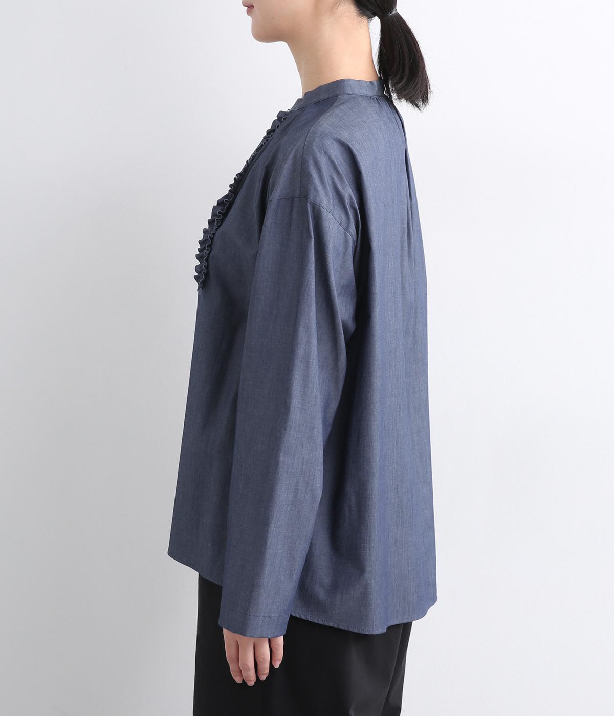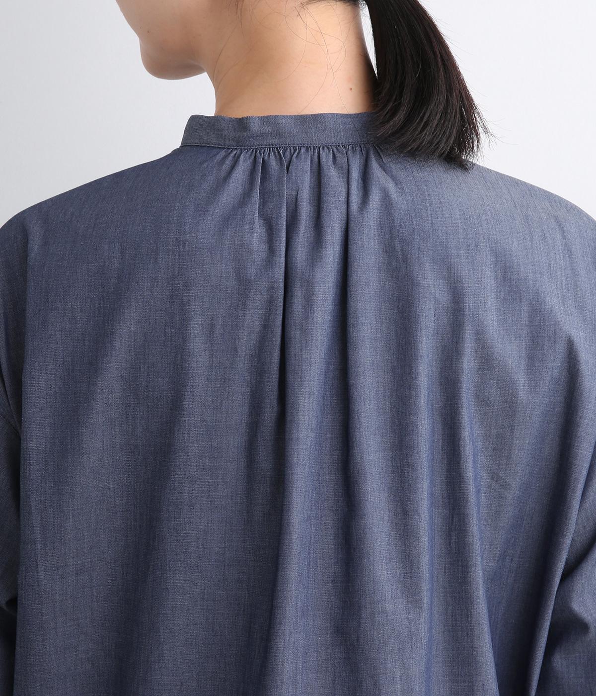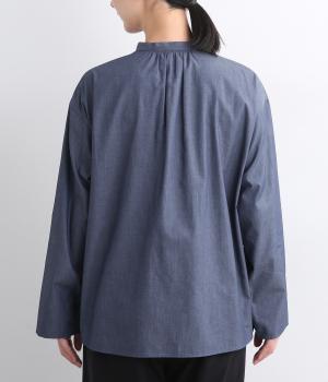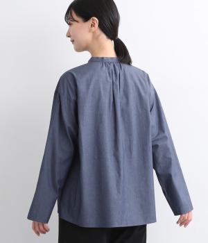 薄手のコットンデニムで仕立てたブラウスです。ほのかな光沢にやわらかな素材感がきれいめな印象も醸し、適度にふくらみもあって着心地も快適です。