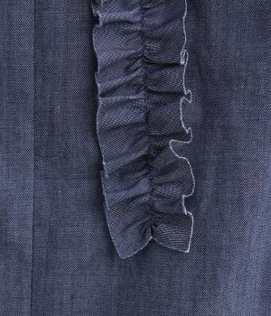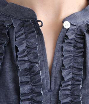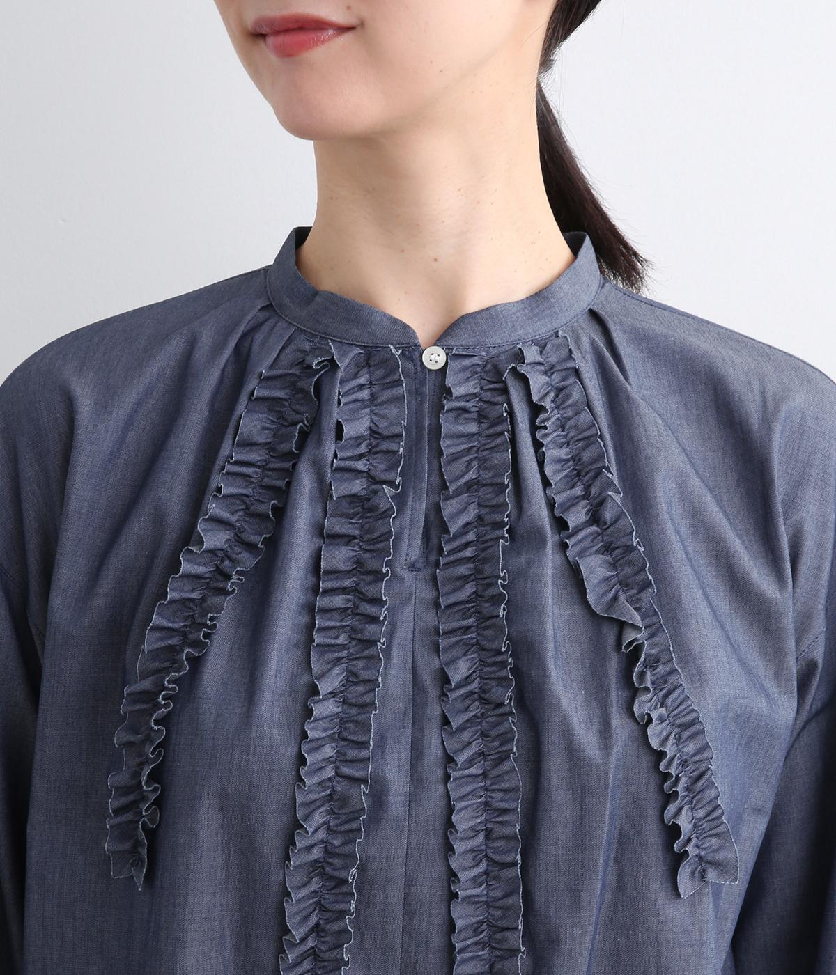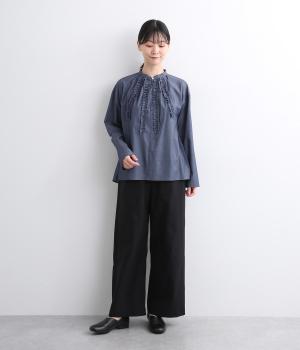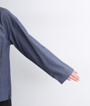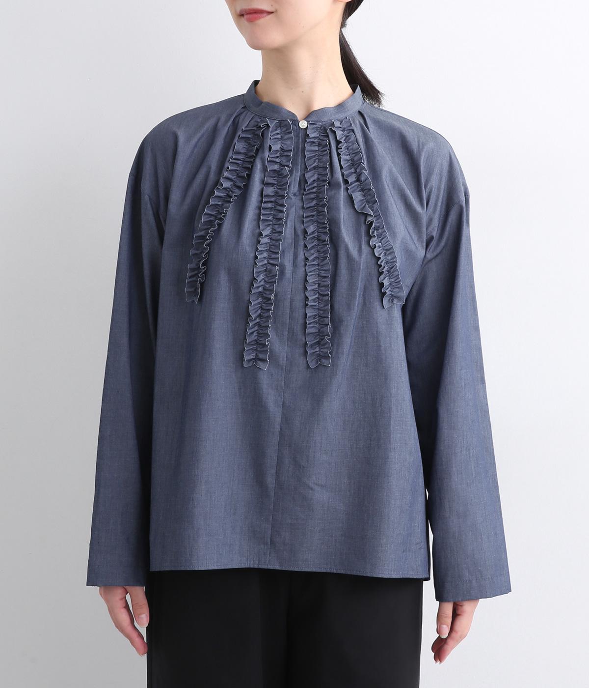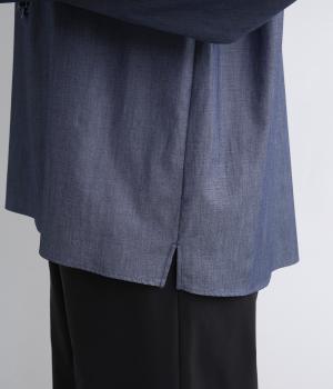 薄手のコットンデニムで仕立てたブラウスです。ほのかな光沢にやわらかな素材感がきれいめな印象も醸し、適度にふくらみもあって着心地も快適です。