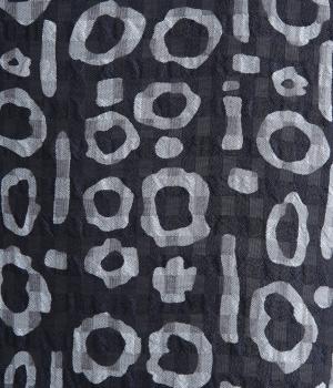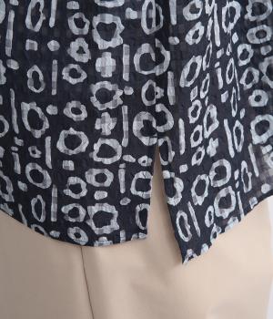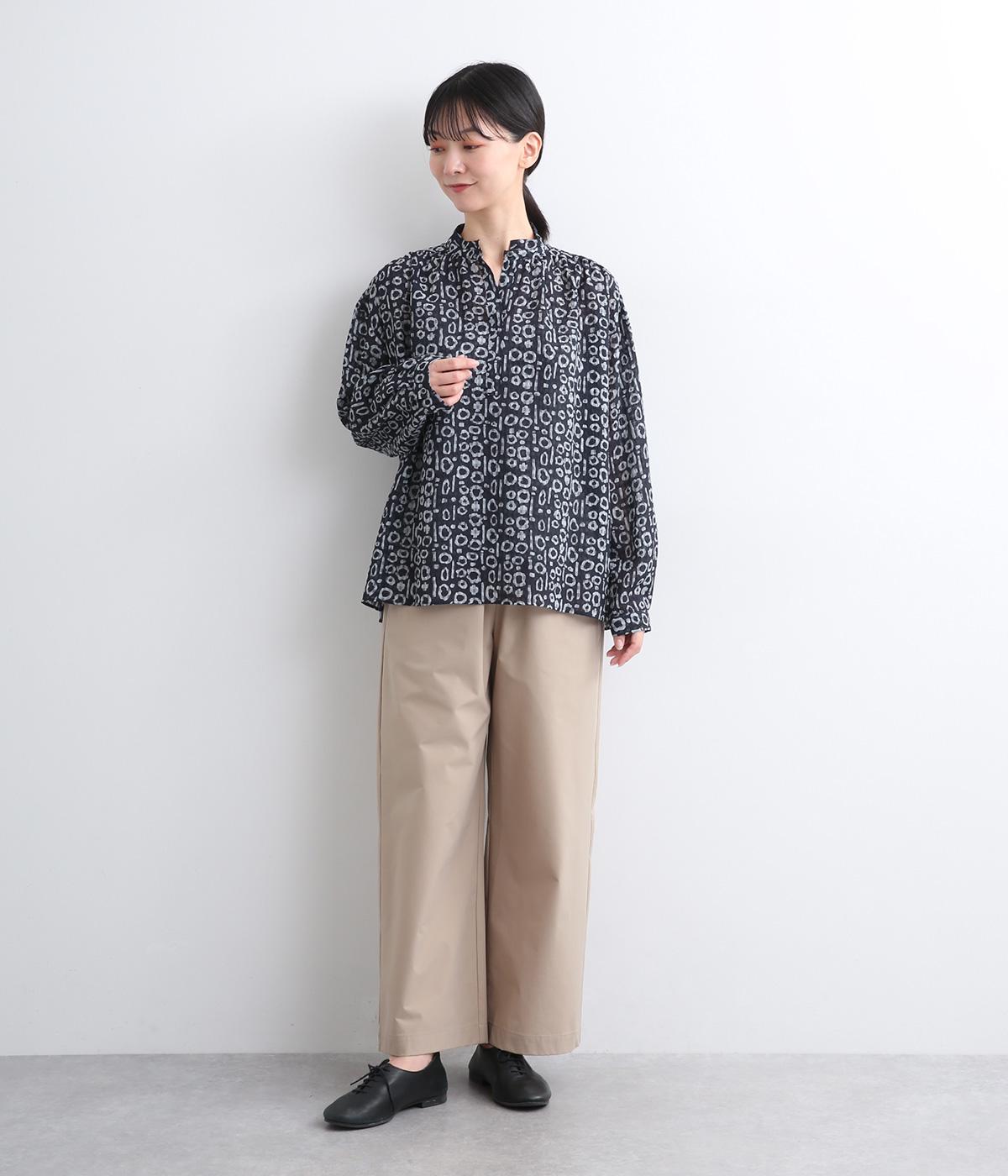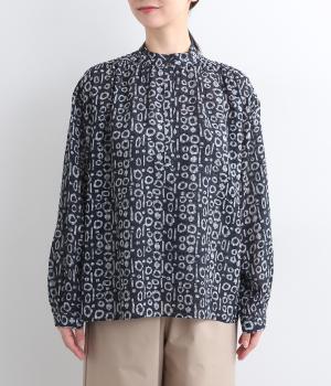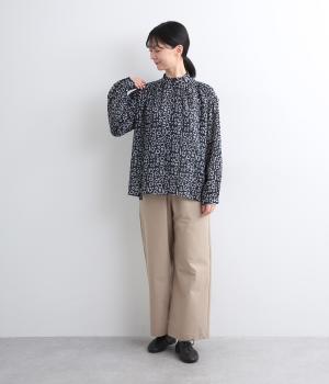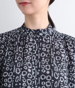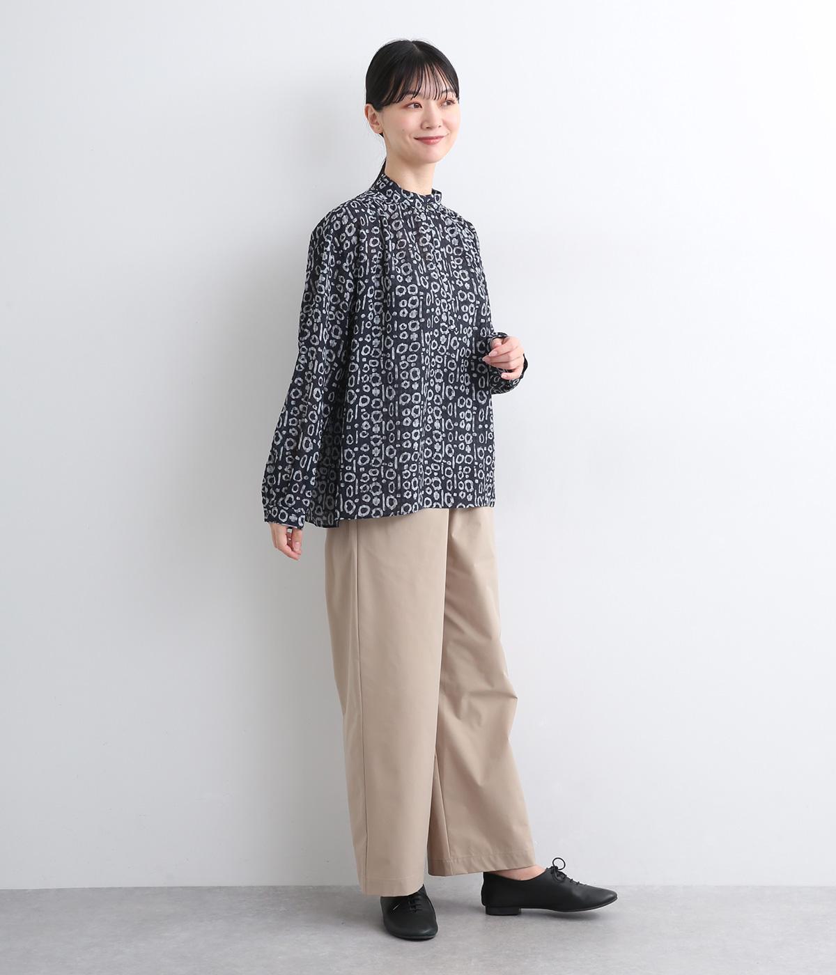 チェック生地にプリントをほどこしたテキスタイルがアイキャッチになるブラウス。襟元のボタンは留めればきちんと見えに、あければ適度に抜け感がうまれて印象がチェンジできます。サイドスリット入りでボトム合わせもきれい見え。