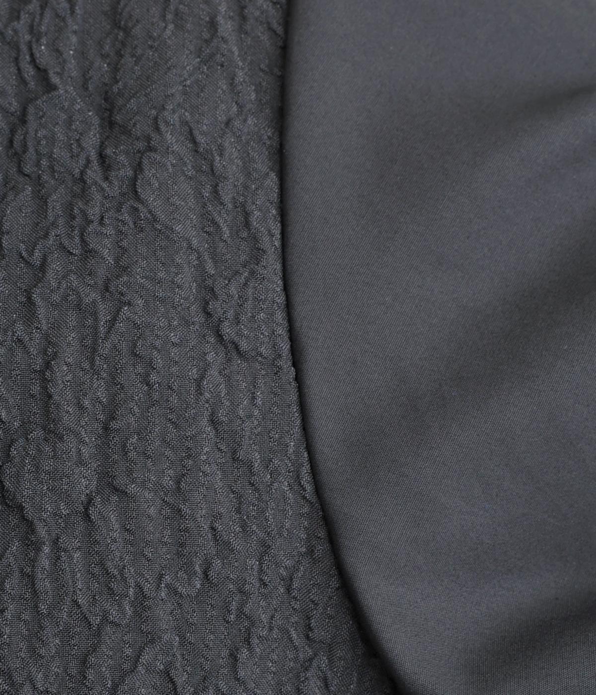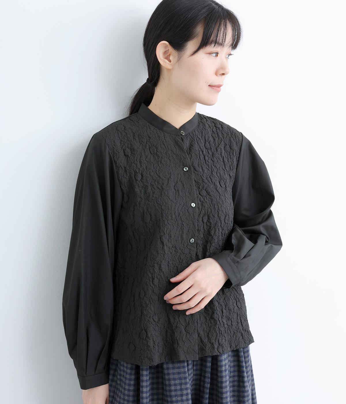 バンドカラーとふくらみのある袖のシルエットが特徴のデザイン。立体的な模様がスタイリングに奥行きを与え、すっきりしたデザインに大人らしい品を添えます。コーディネートにそっと華やかさを添える一枚です。