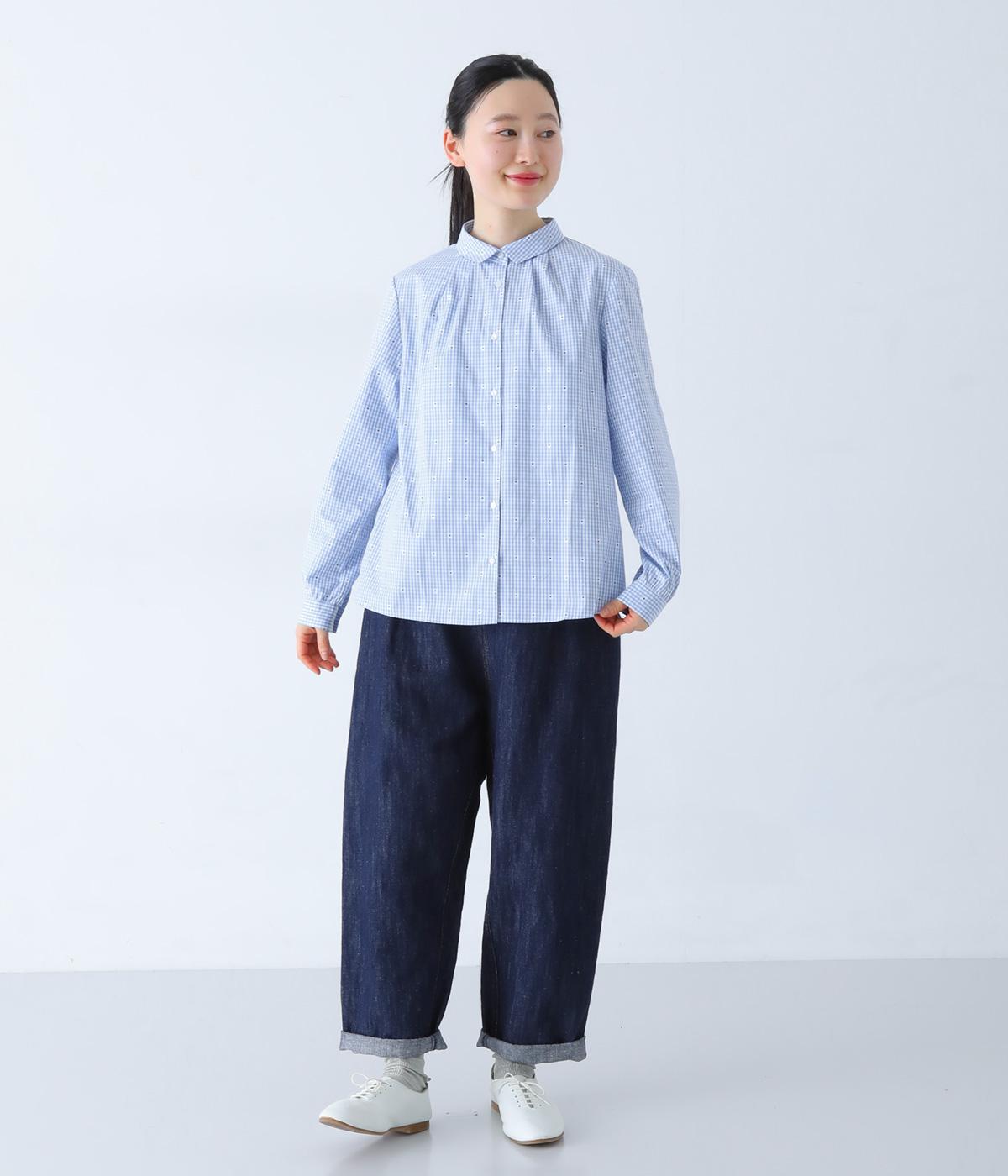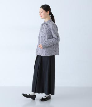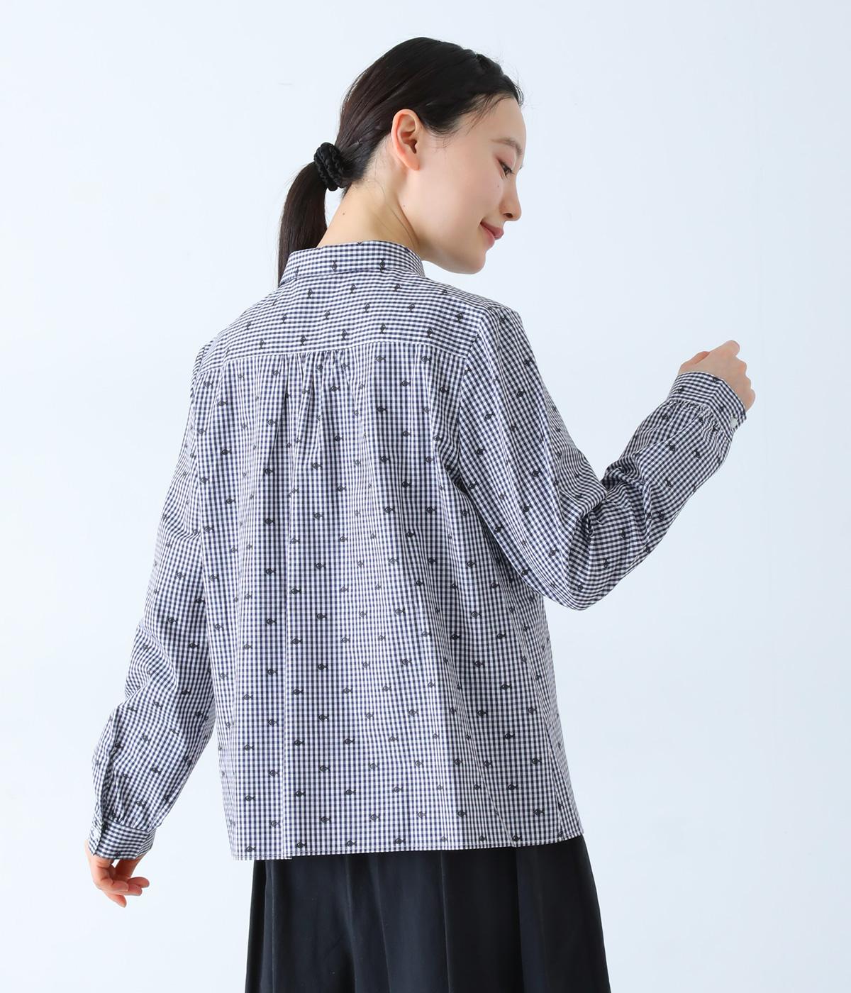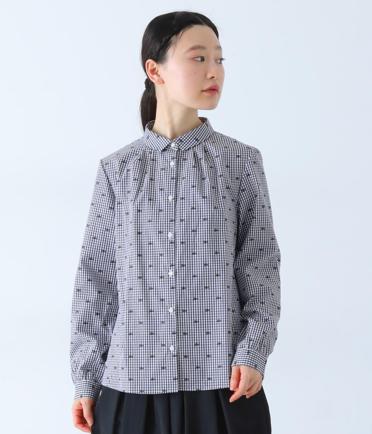 柄刺しゅうが奥行きのある表情を演出するブラウスです。スタンダードな型にところどころギャザーをほどこし、ふんわりとした立体感を描きます。カジュアルななかに華やかなアクセントを添えた、スタイリングのポイントになる一枚です。