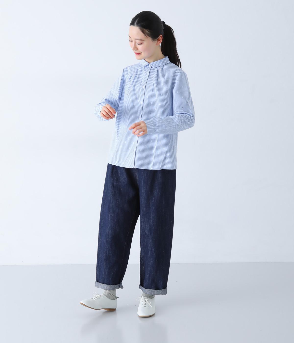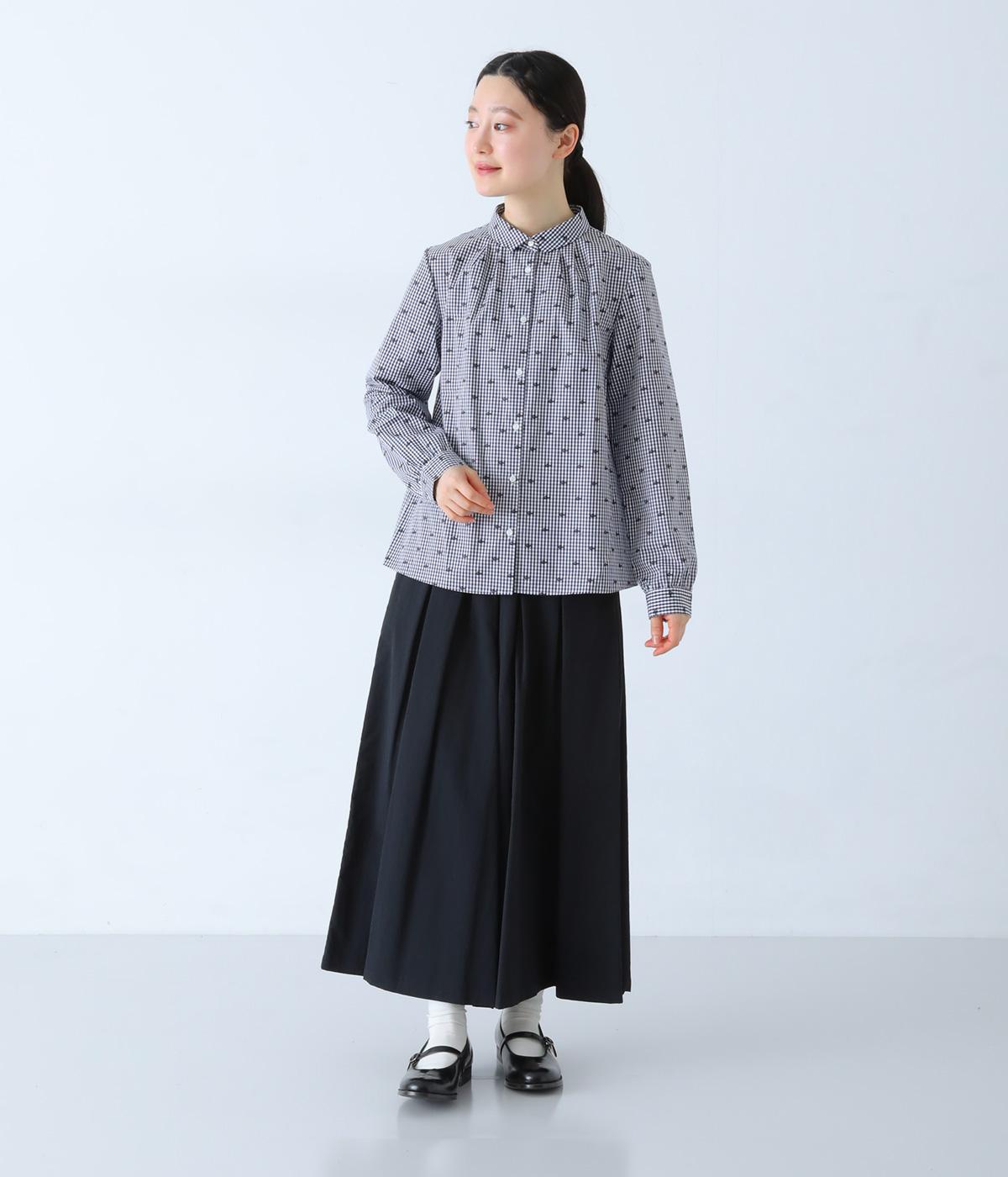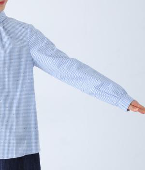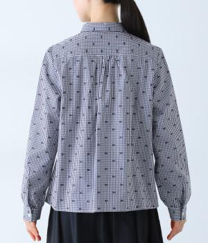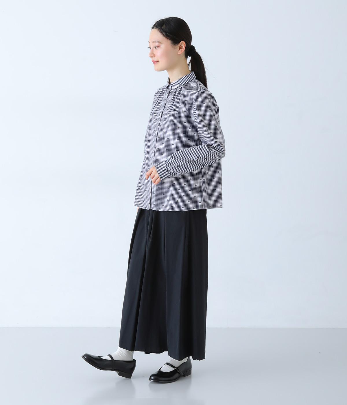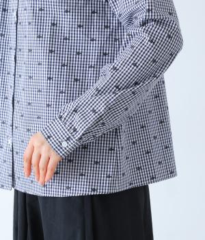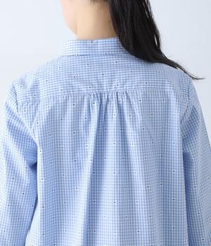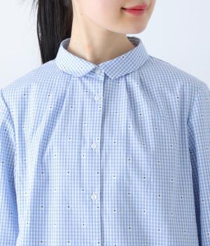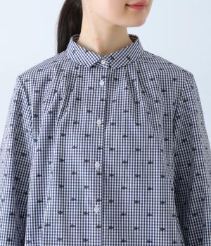 しなやかなハリがシルエットをきれいに表現するコットンブロード生地を使用しました。ギンガムチェック地に刺しゅうで柄をほどこしています。さらりと心地よい肌ざわりの素材感です。