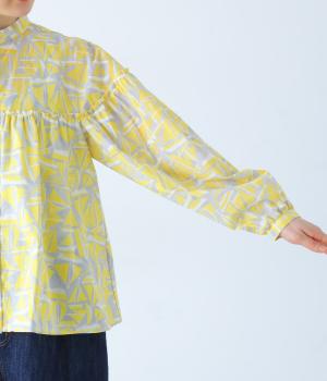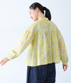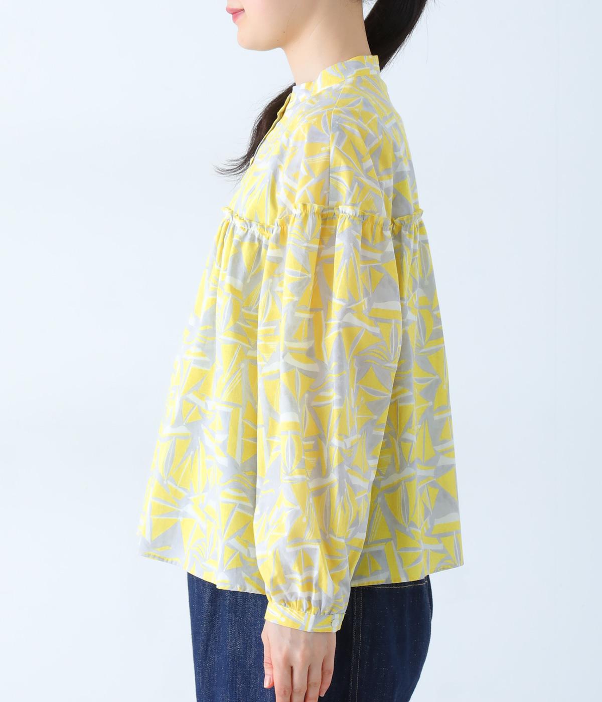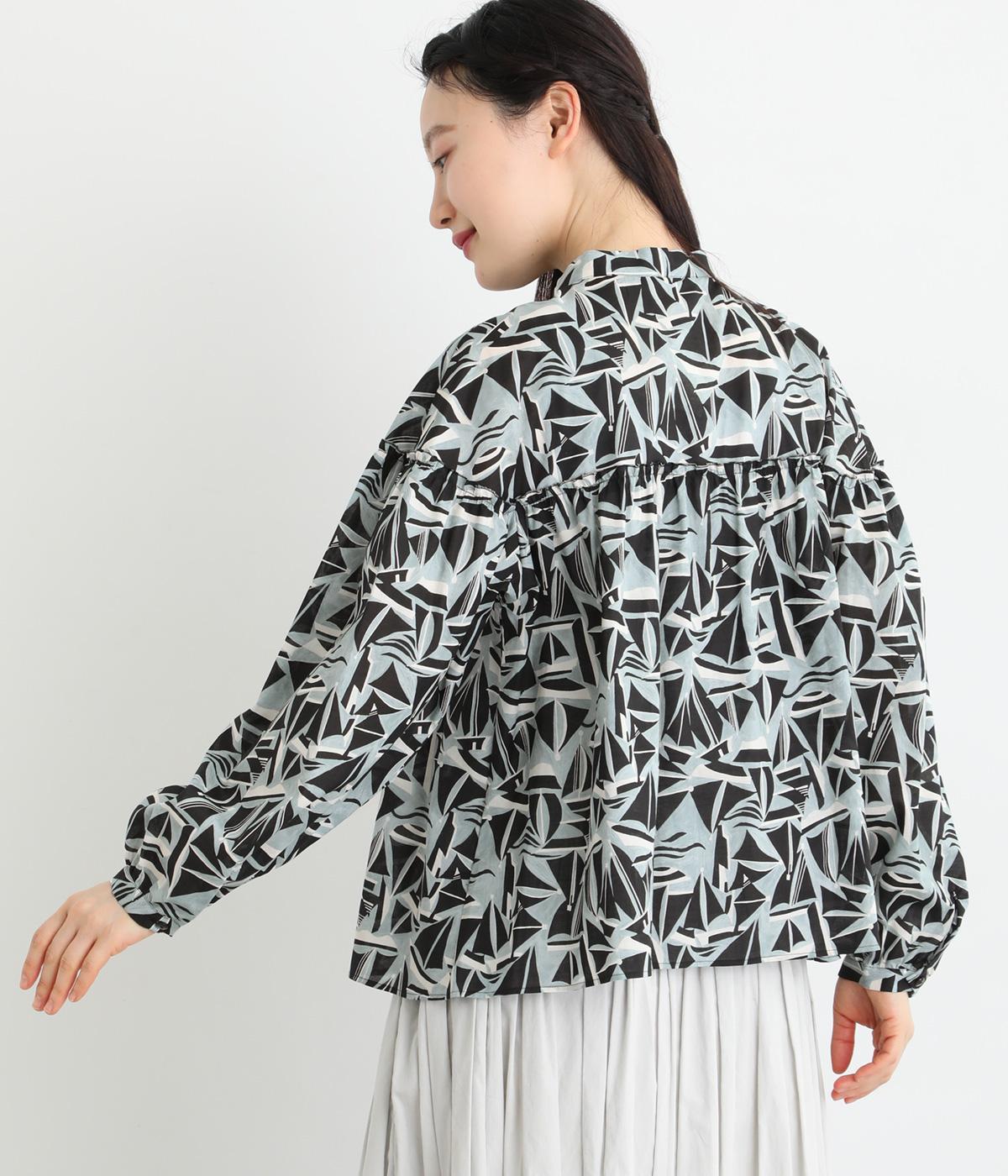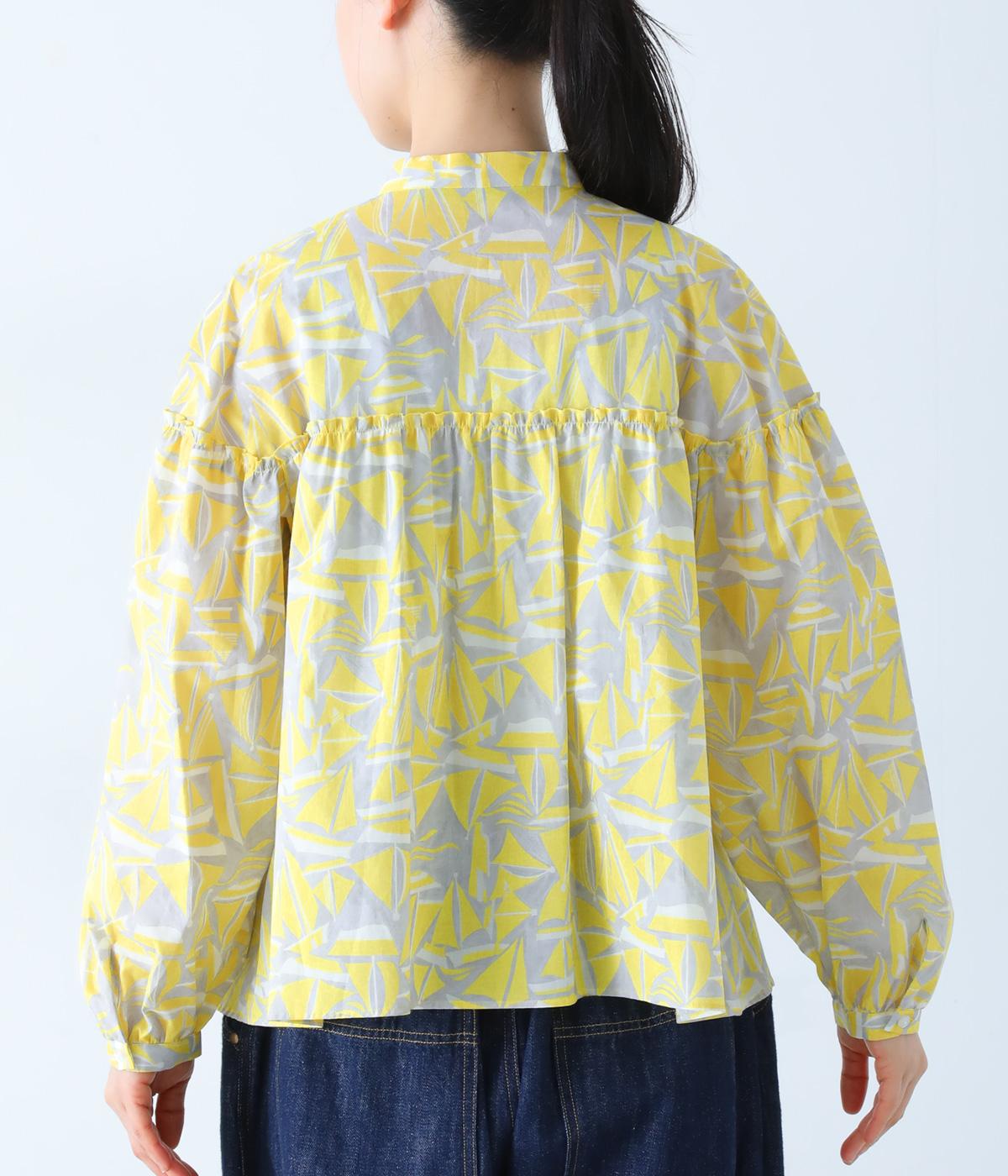 幾何学模様のヨット柄が華やかな印象を与えるブラウスです。立体的な切り替えラインがアクセントになり、ゆとりのあるシルエットをつくります。ほどよい丈感で、さまざまなボトムスになじむ一枚です。