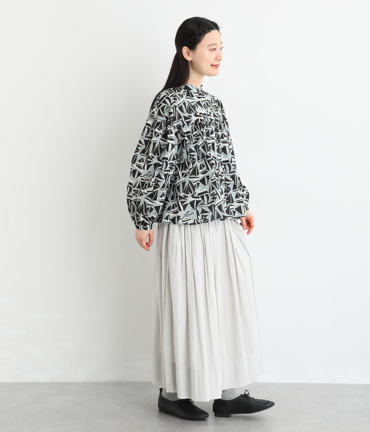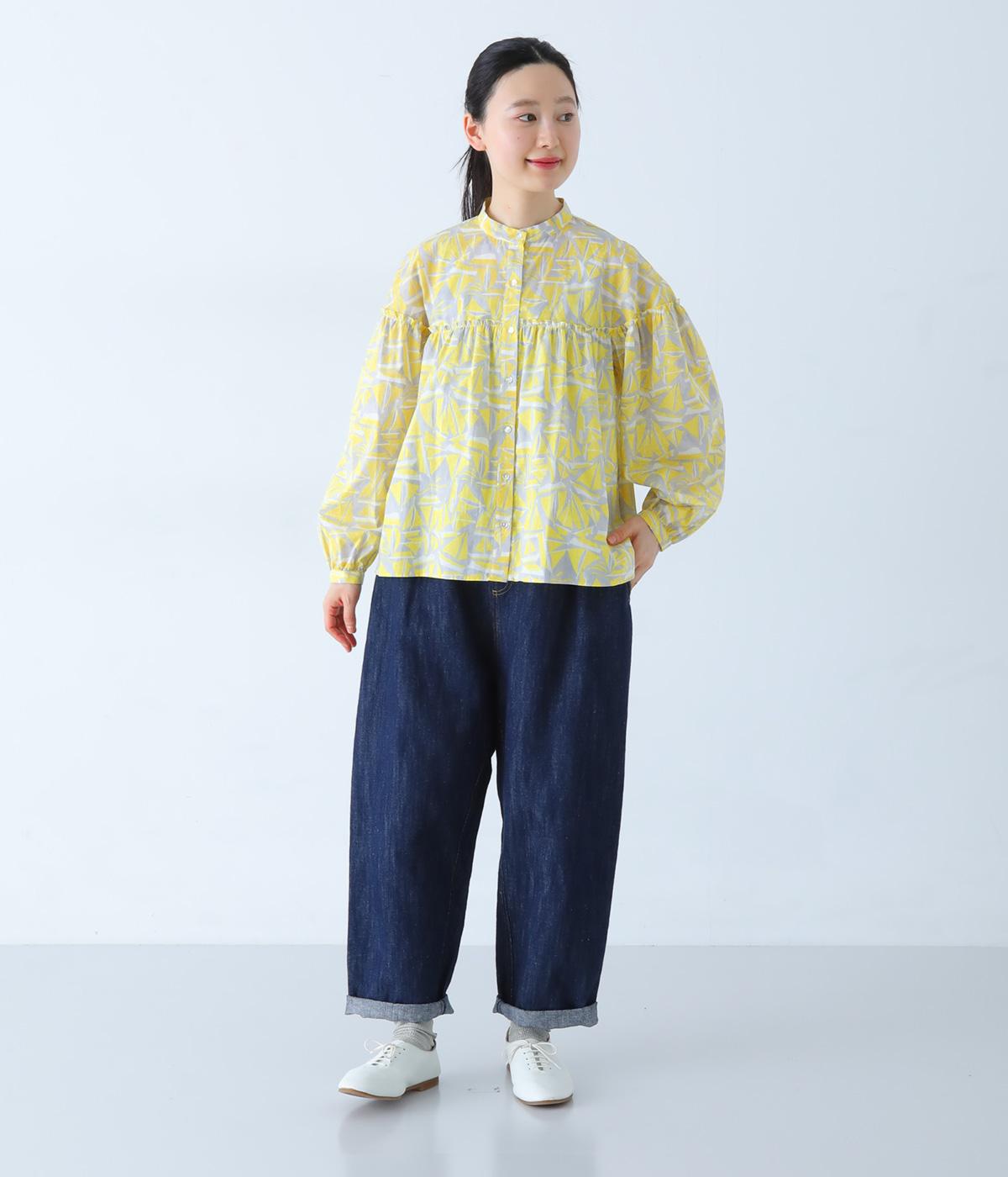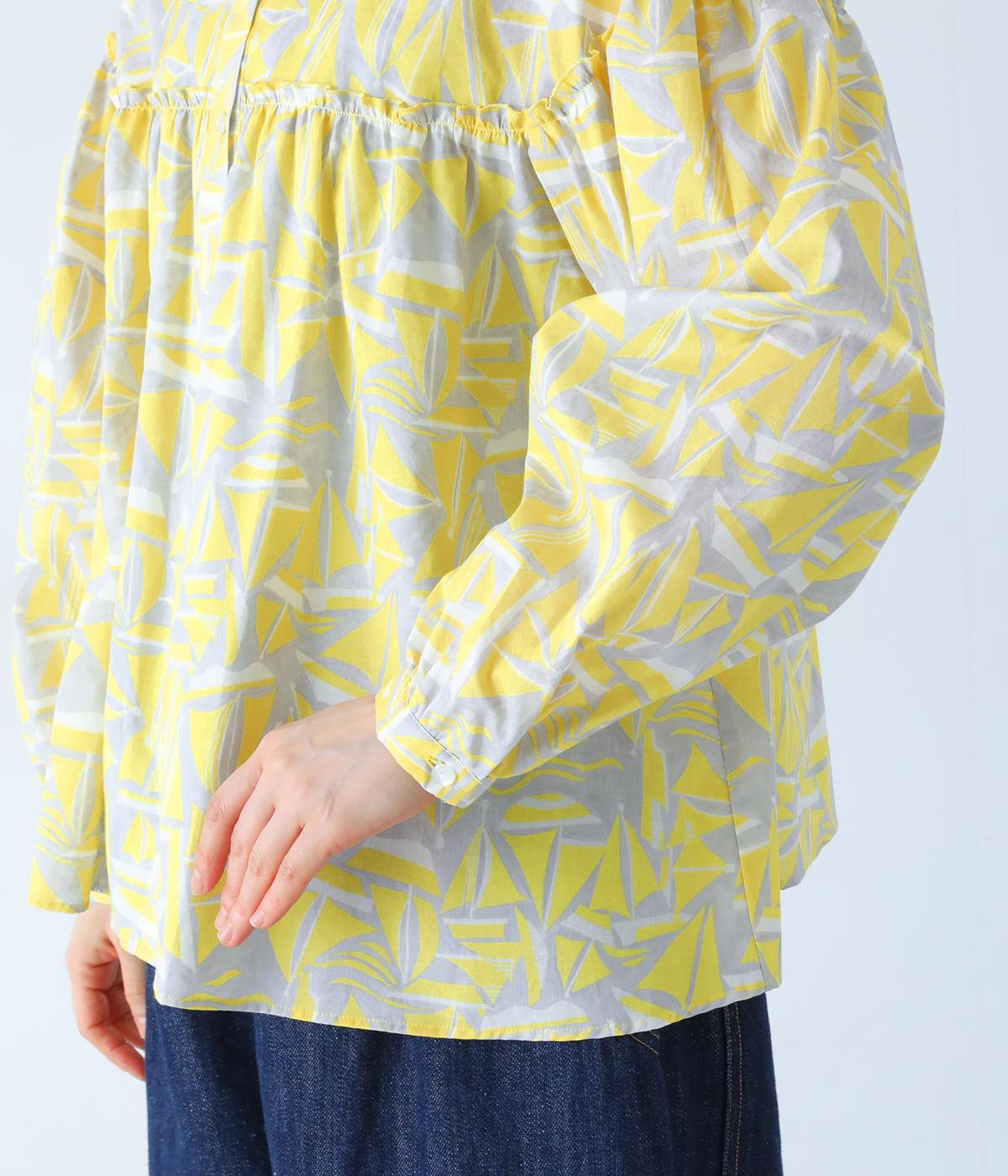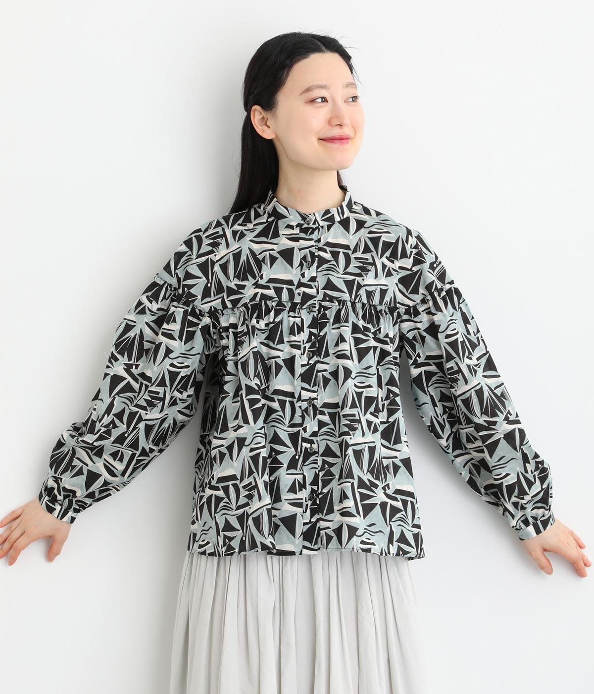 幾何学模様のヨット柄が華やかな印象を与えるブラウスです。立体的な切り替えラインがアクセントになり、ゆとりのあるシルエットをつくります。ほどよい丈感で、さまざまなボトムスになじむ一枚です。