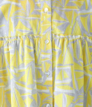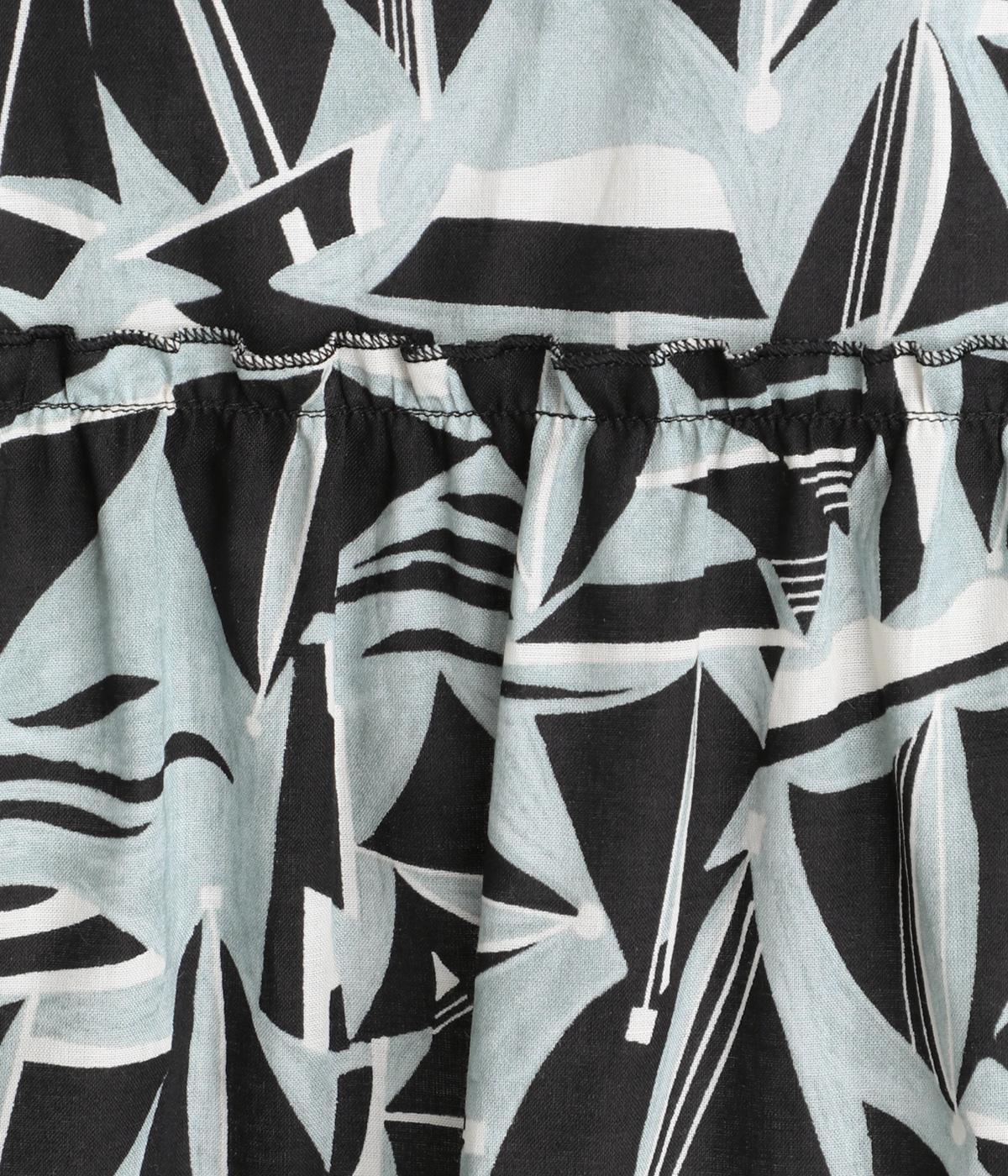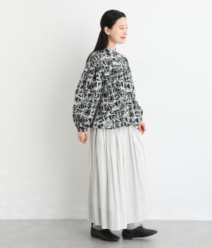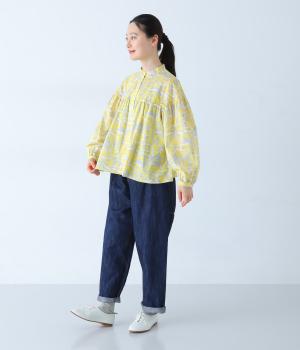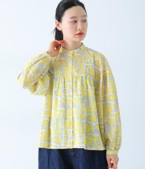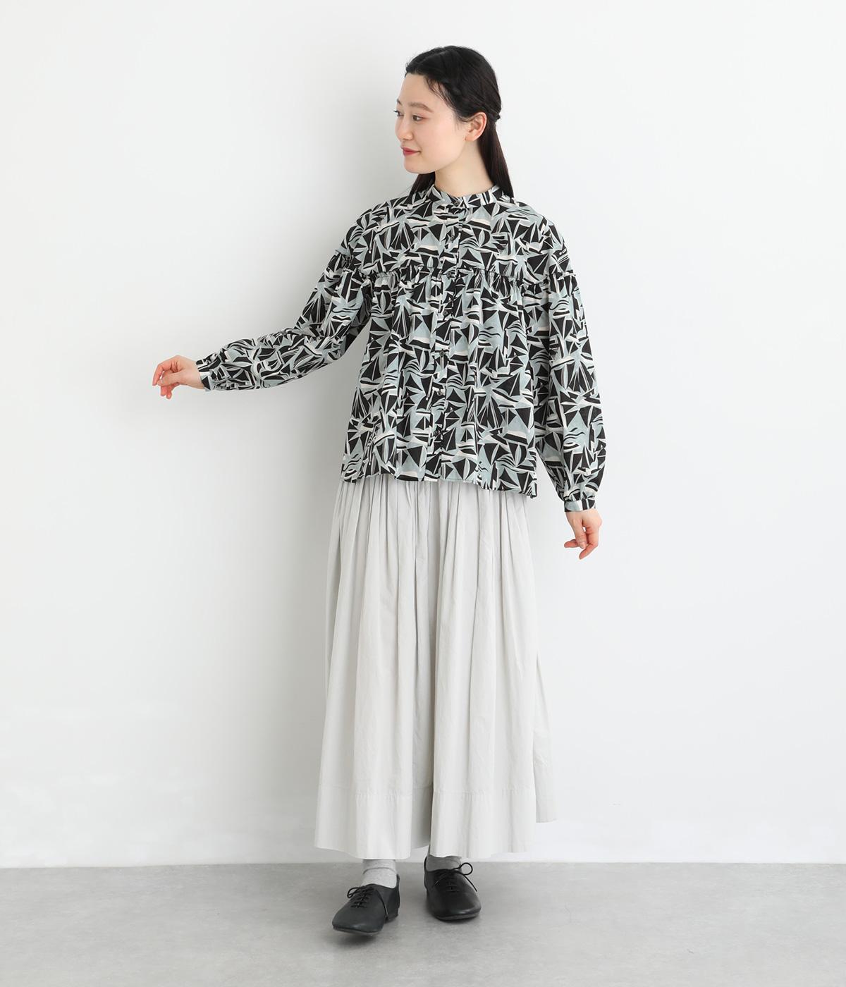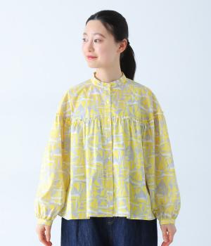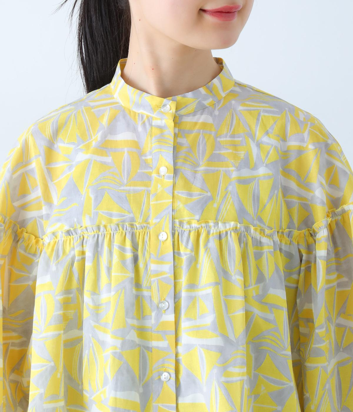 幾何学模様のヨット柄が華やかな印象を与えるブラウスです。立体的な切り替えラインがアクセントになり、ゆとりのあるシルエットをつくります。ほどよい丈感で、さまざまなボトムスになじむ一枚です。