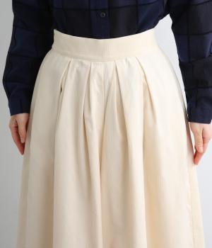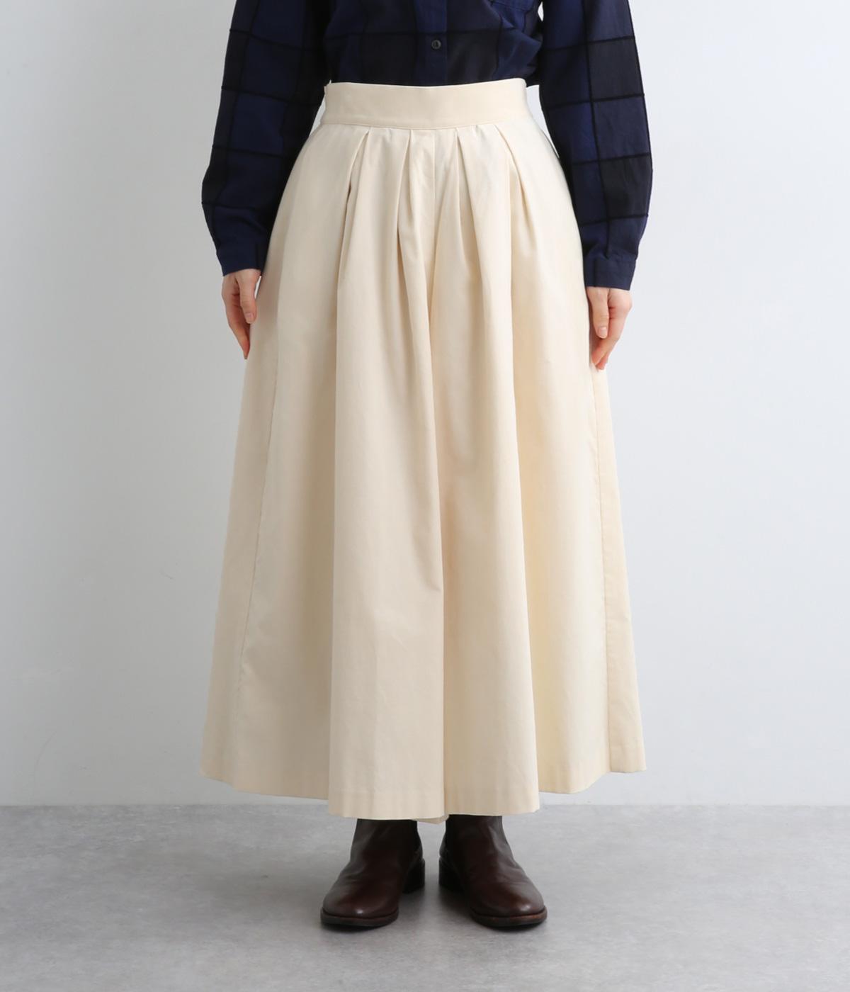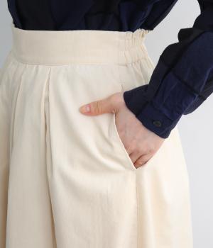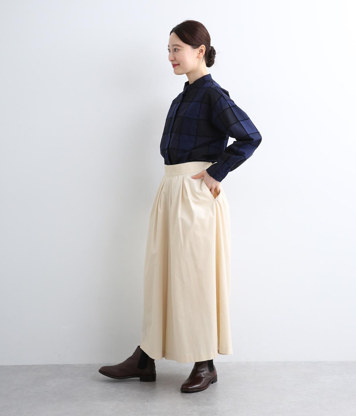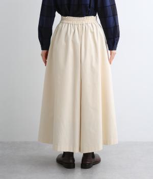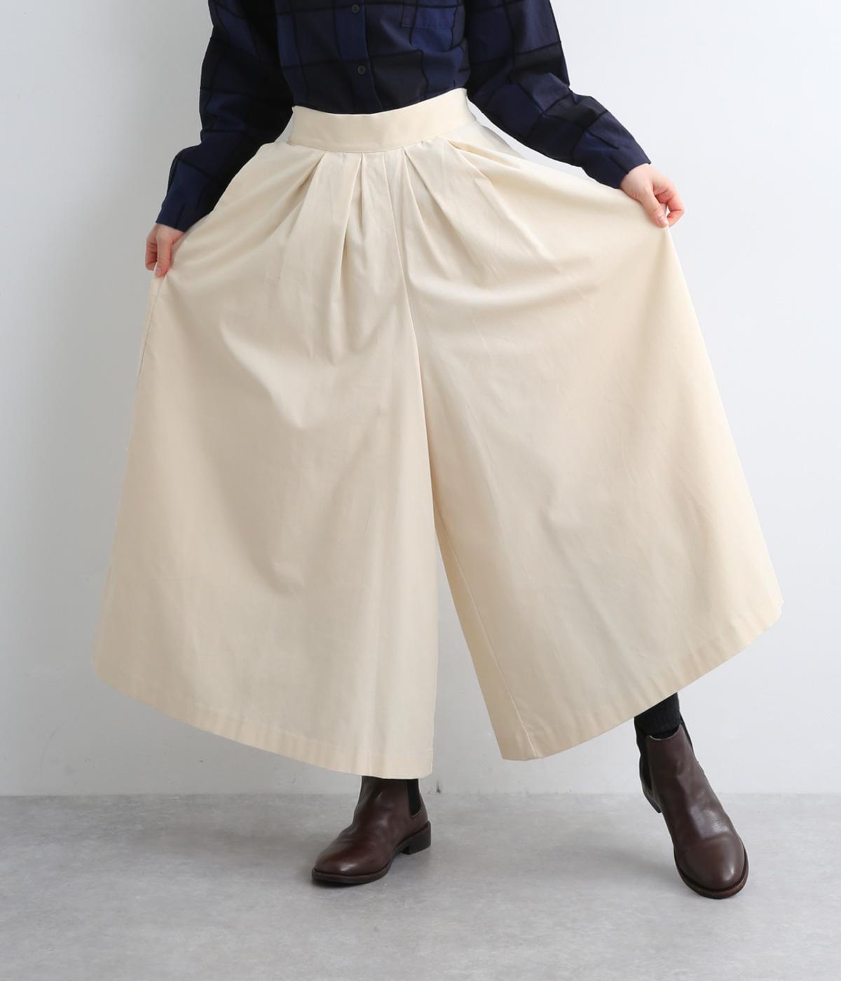 スカート見えする、タック入りのキュロットパンツです。たっぷりとしたシルエットにロング丈で存在感があり、パンツ仕立てなので動きやすさも◎。ウエストは後ろのみゴムを入れているので、前だけインしたきれいめな着こなしもおすすめ。