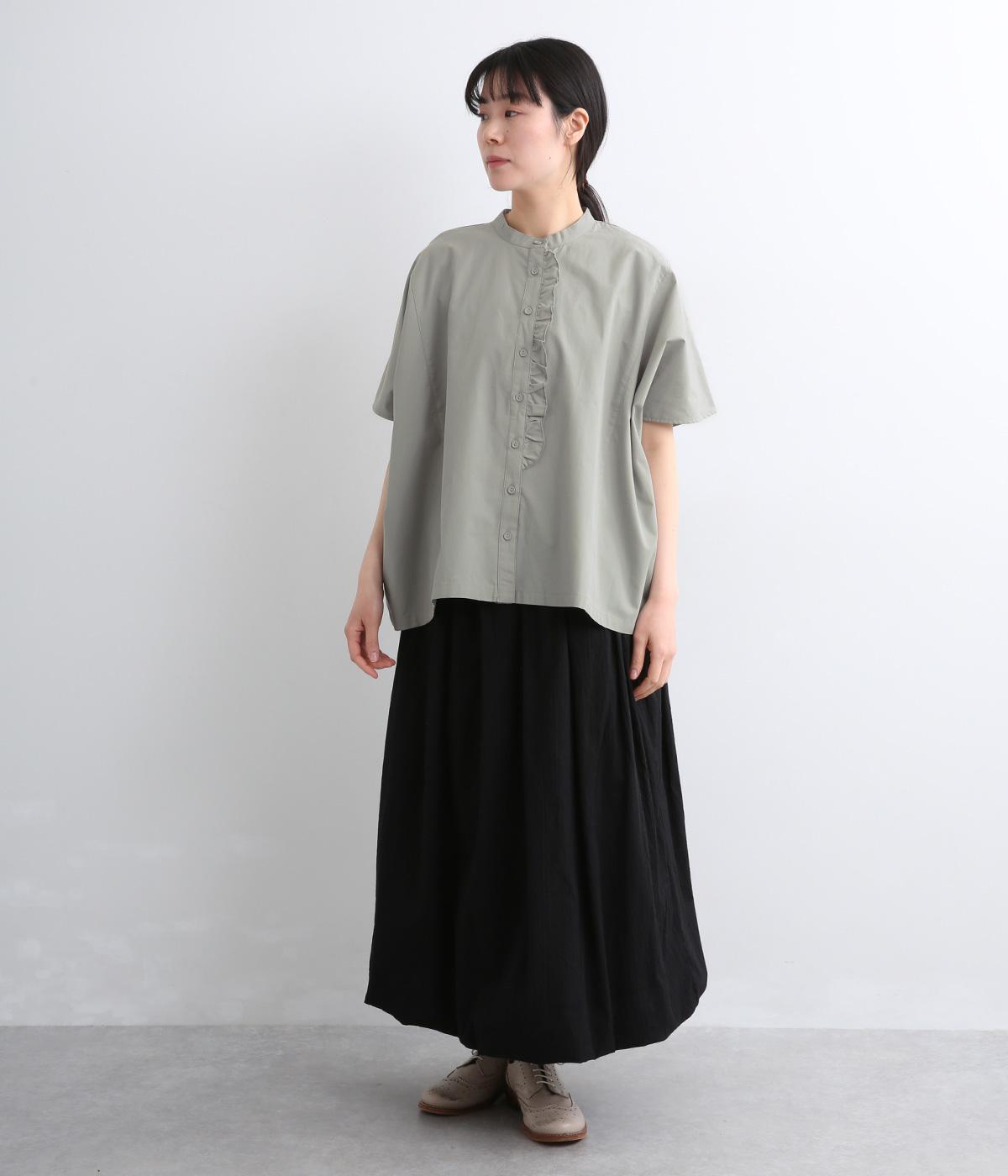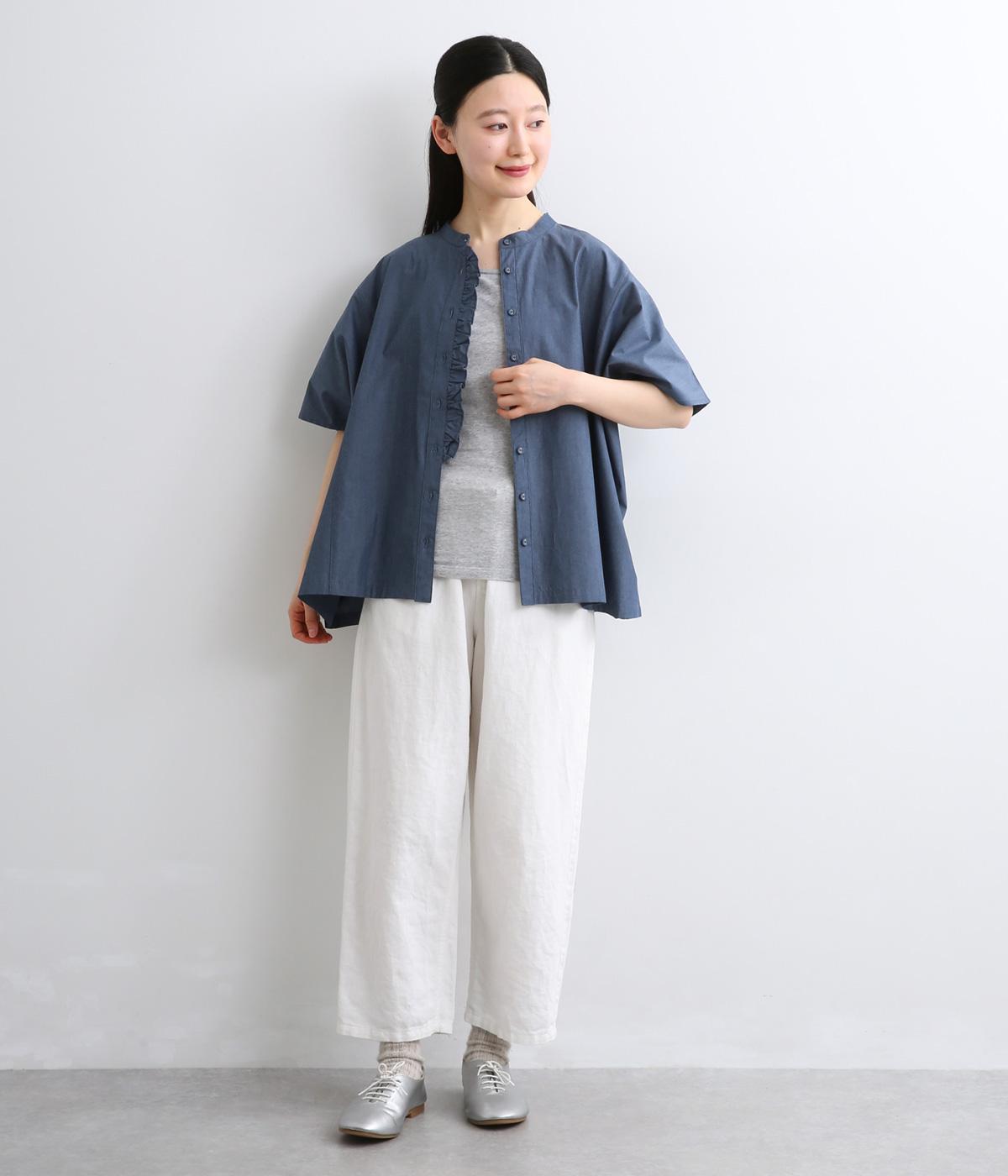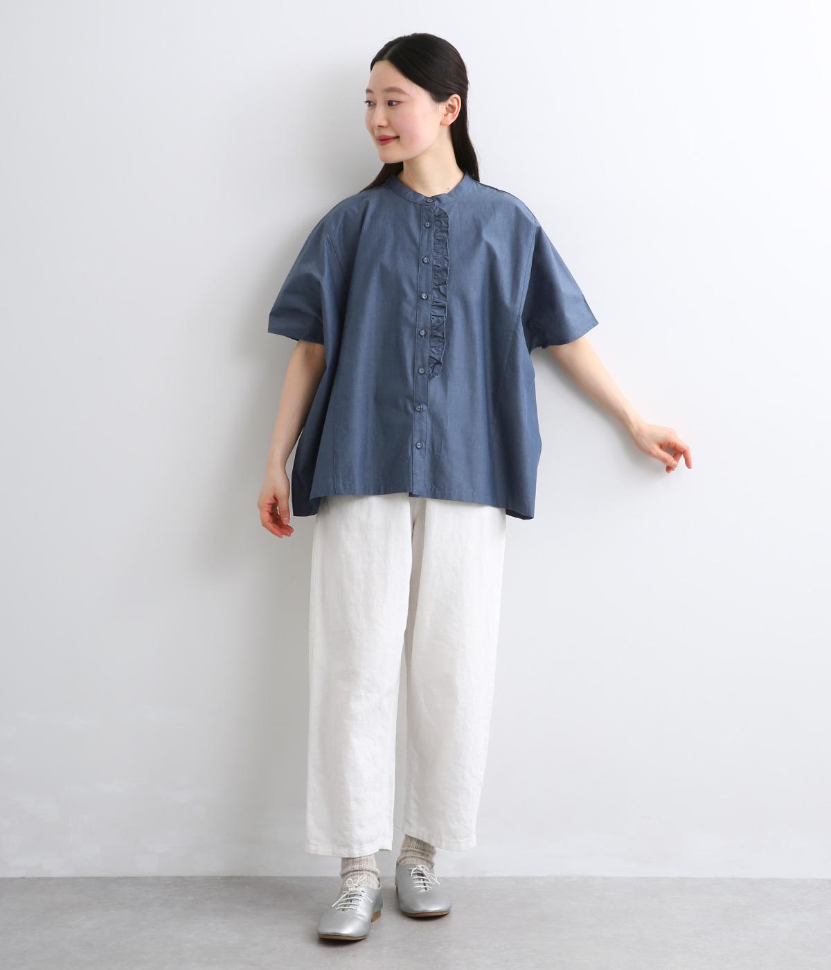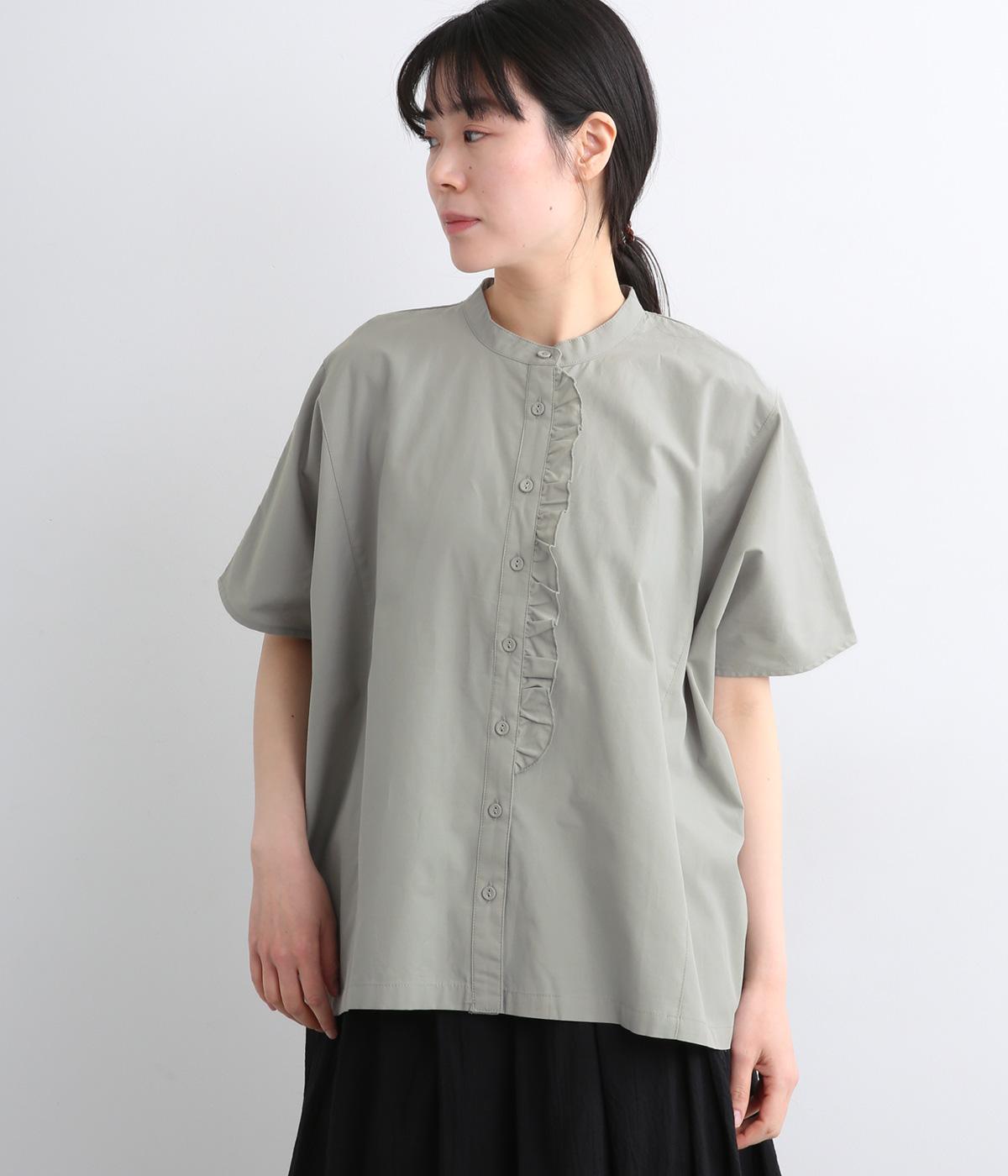 胸元のフリルがさりげない華やぎを添えるブラウス。体のラインを拾いにくいゆったりとしたシルエットで風が通り、暑い季節も心地よく着用できます。前後の縦切り替えがシルエットにほどよいアクセントを加えます。