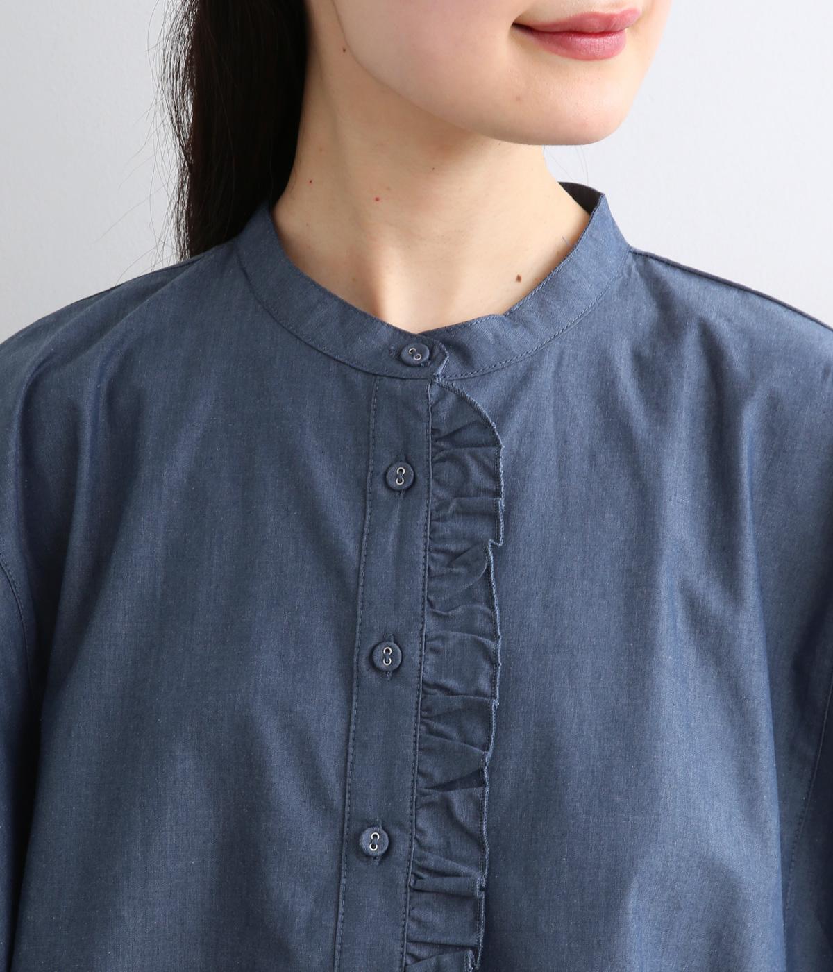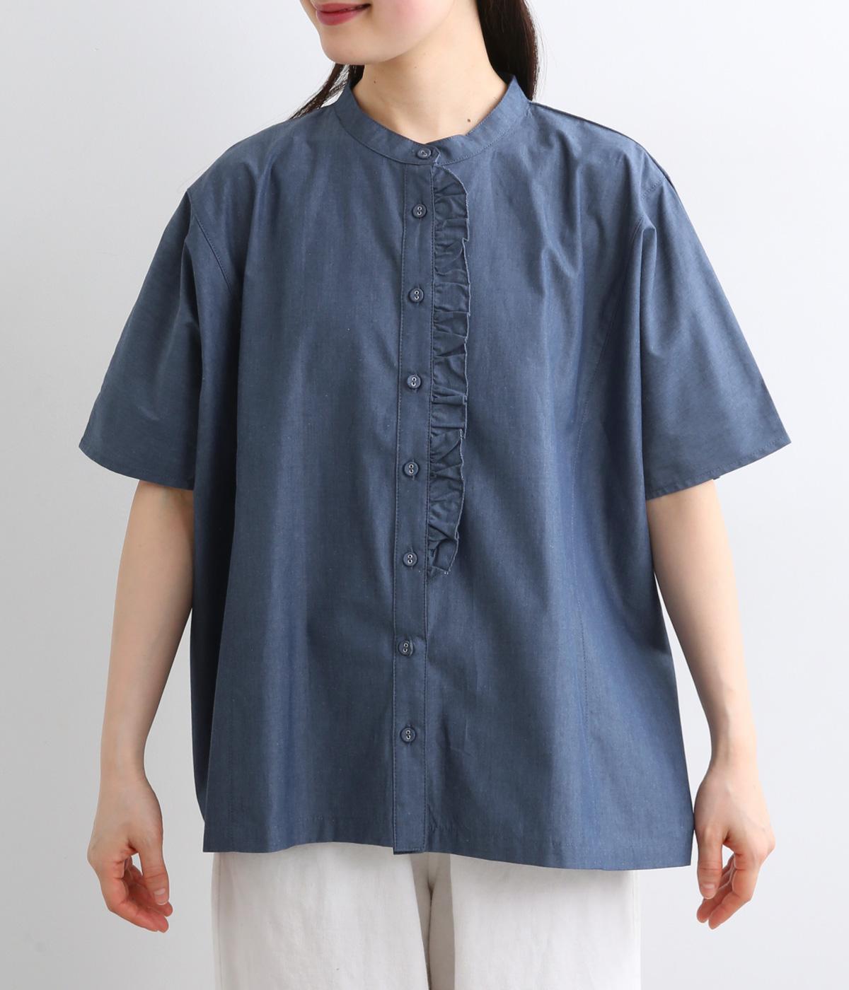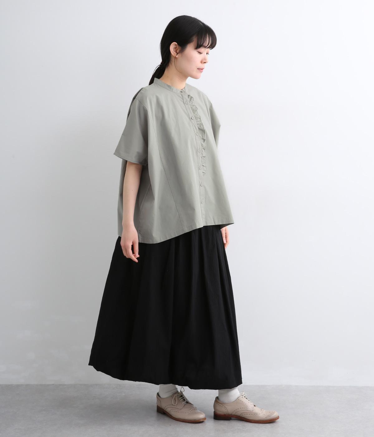 胸元のフリルがさりげない華やぎを添えるブラウス。体のラインを拾いにくいゆったりとしたシルエットで風が通り、暑い季節も心地よく着用できます。前後の縦切り替えがシルエットにほどよいアクセントを加えます。