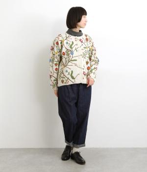 全面にほどこした手作業の花柄刺しゅうが、華やかに映えるカーディガン。広がる枝葉に色とりどりの花をあしらい、まるで小さな庭を身にまとうような雰囲気です。シルエットはベーシックなので、さまざまなボトムスとも好相性。着るだけでコーディネートの主役になる、存在感ばつぐんのアイテムです。