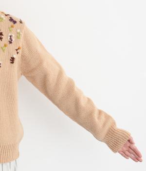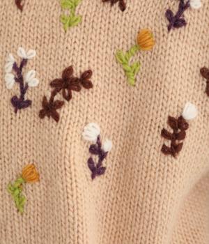 やわらかな糸でほどよい厚みに編み上げたニット生地。しなやかな伸縮性でチクチクしにくいやさしい着心地です。かわいらしい花柄刺しゅうをほどこしました。