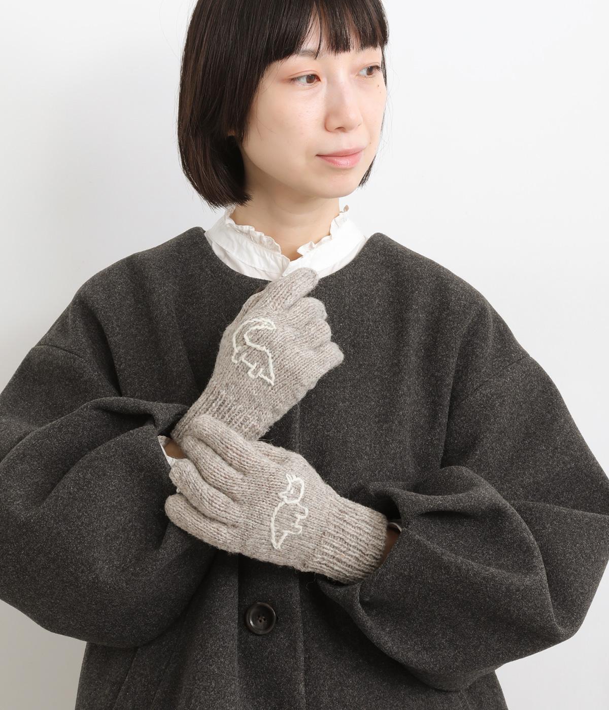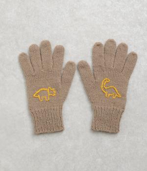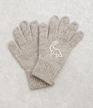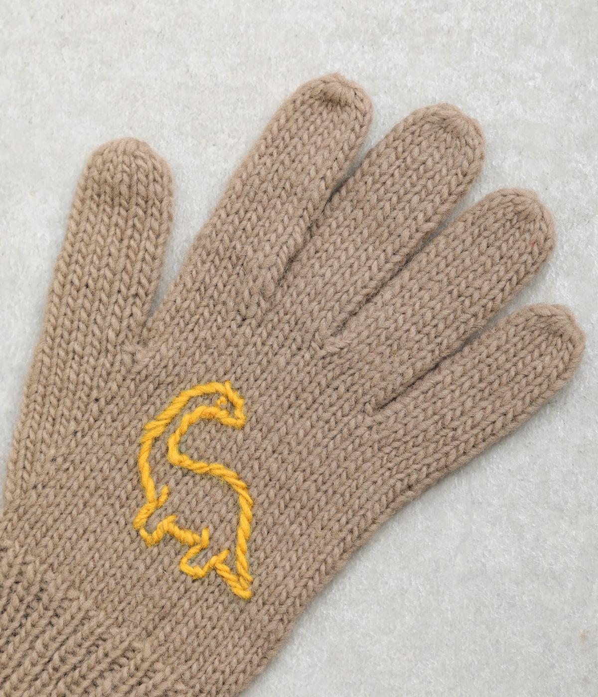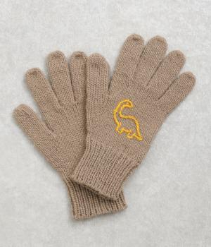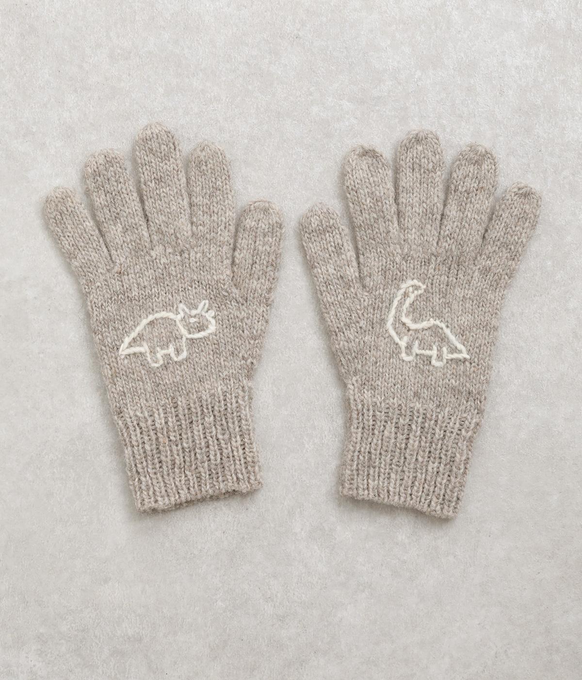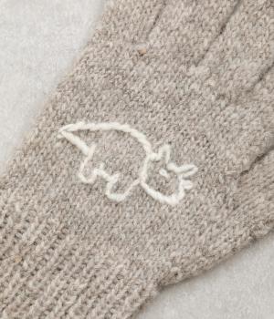 片手ずつ異なる恐竜のワンポイント刺しゅうが入った、愛らしい手袋です。細い線で描かれたモチーフなので、大人にも取り入れやすいバランスに仕上がっています。あたたかみのある編み地と相まって、装いにちいさな物語を添えてくれます。
