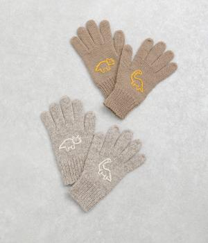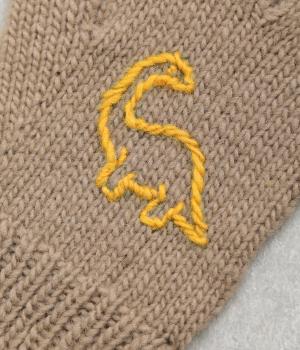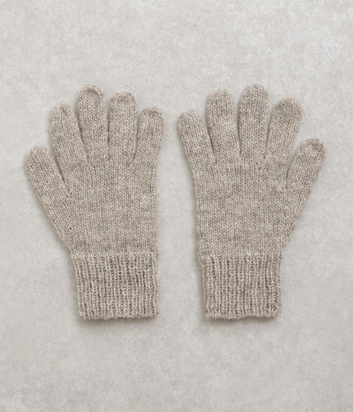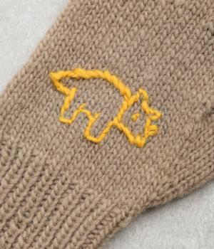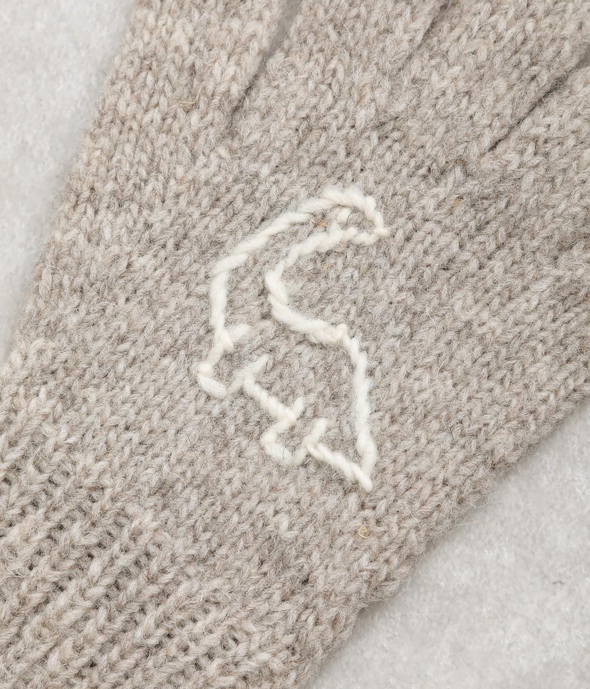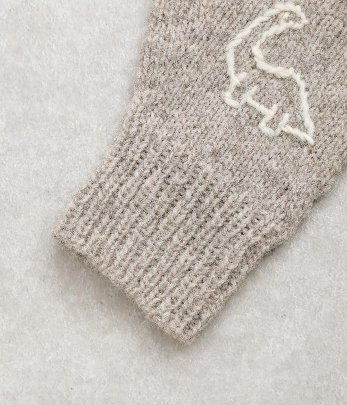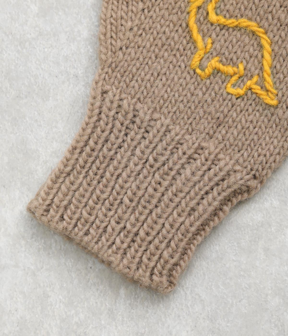 片手ずつ異なる恐竜のワンポイント刺しゅうが入った、愛らしい手袋です。細い線で描かれたモチーフなので、大人にも取り入れやすいバランスに仕上がっています。あたたかみのある編み地と相まって、装いにちいさな物語を添えてくれます。