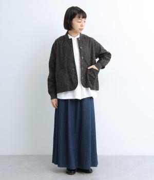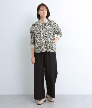 自然な風合いのプリントをほどこしたコットン素材です。ドライな質感でハリがありつつ、やわらかい手ざわり。首元と袖口のリブはソフトなあたりで、デイリーに取り入れやすい素材感です。