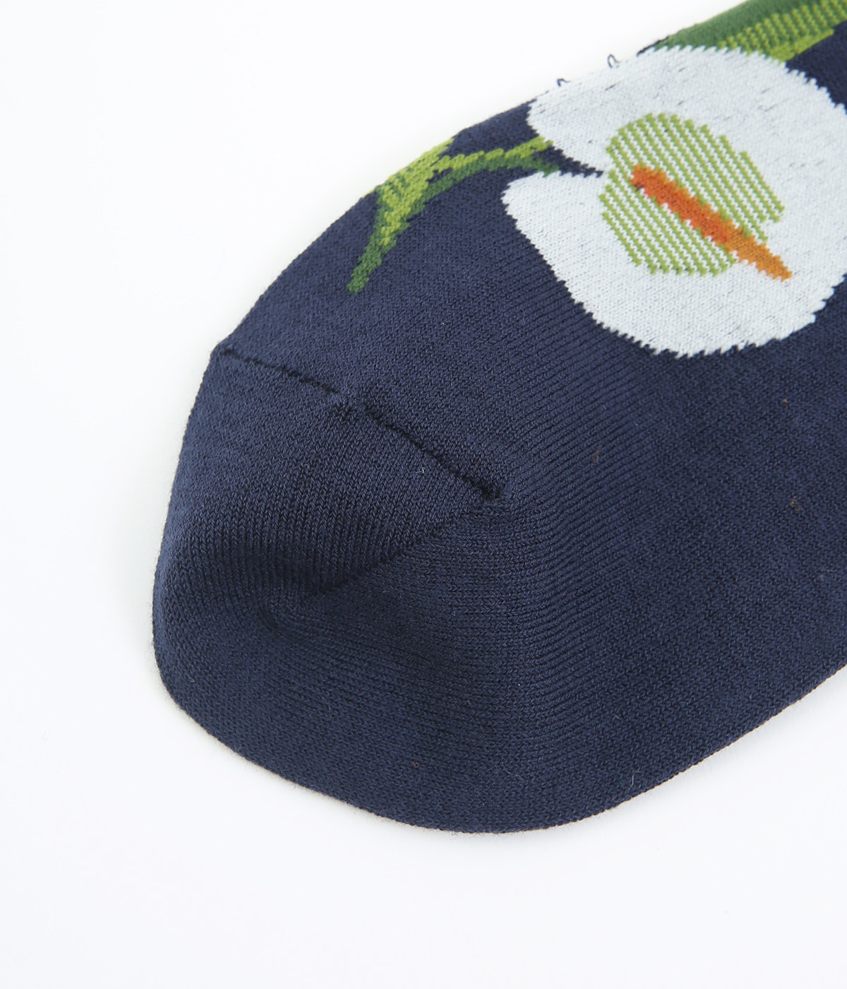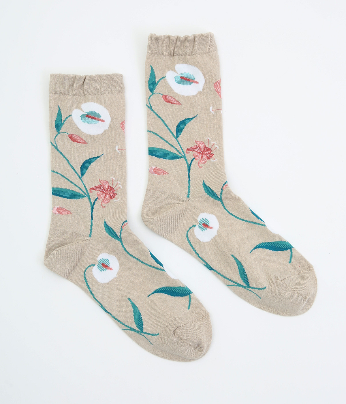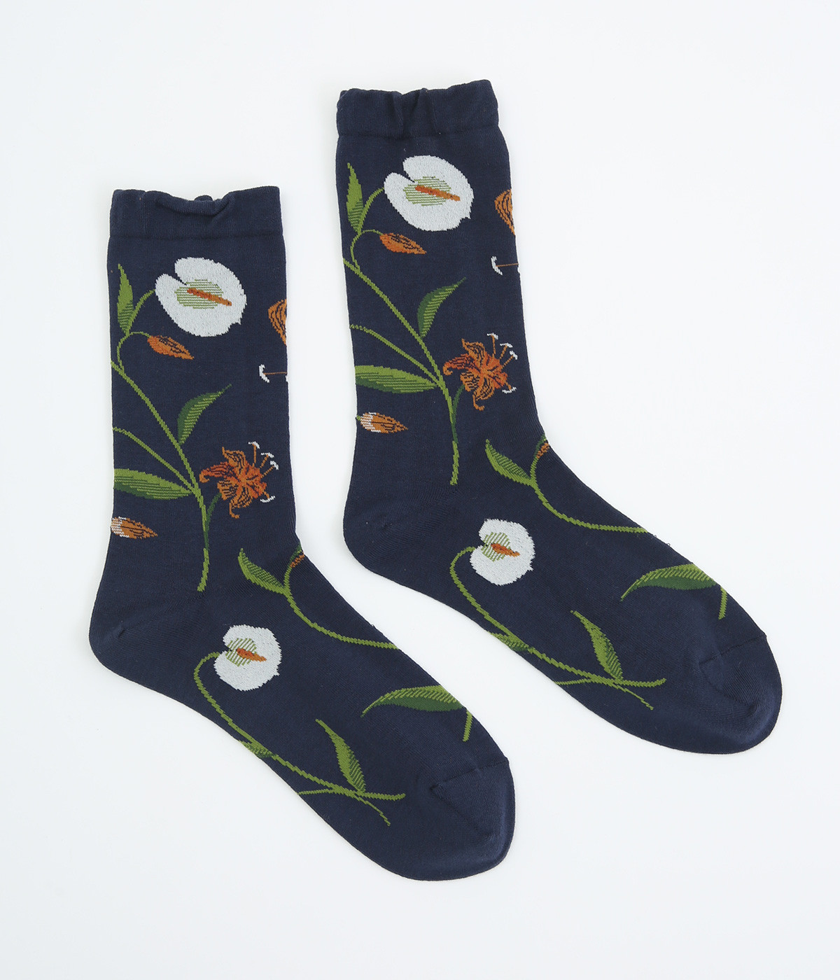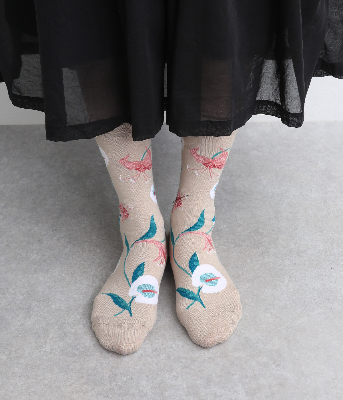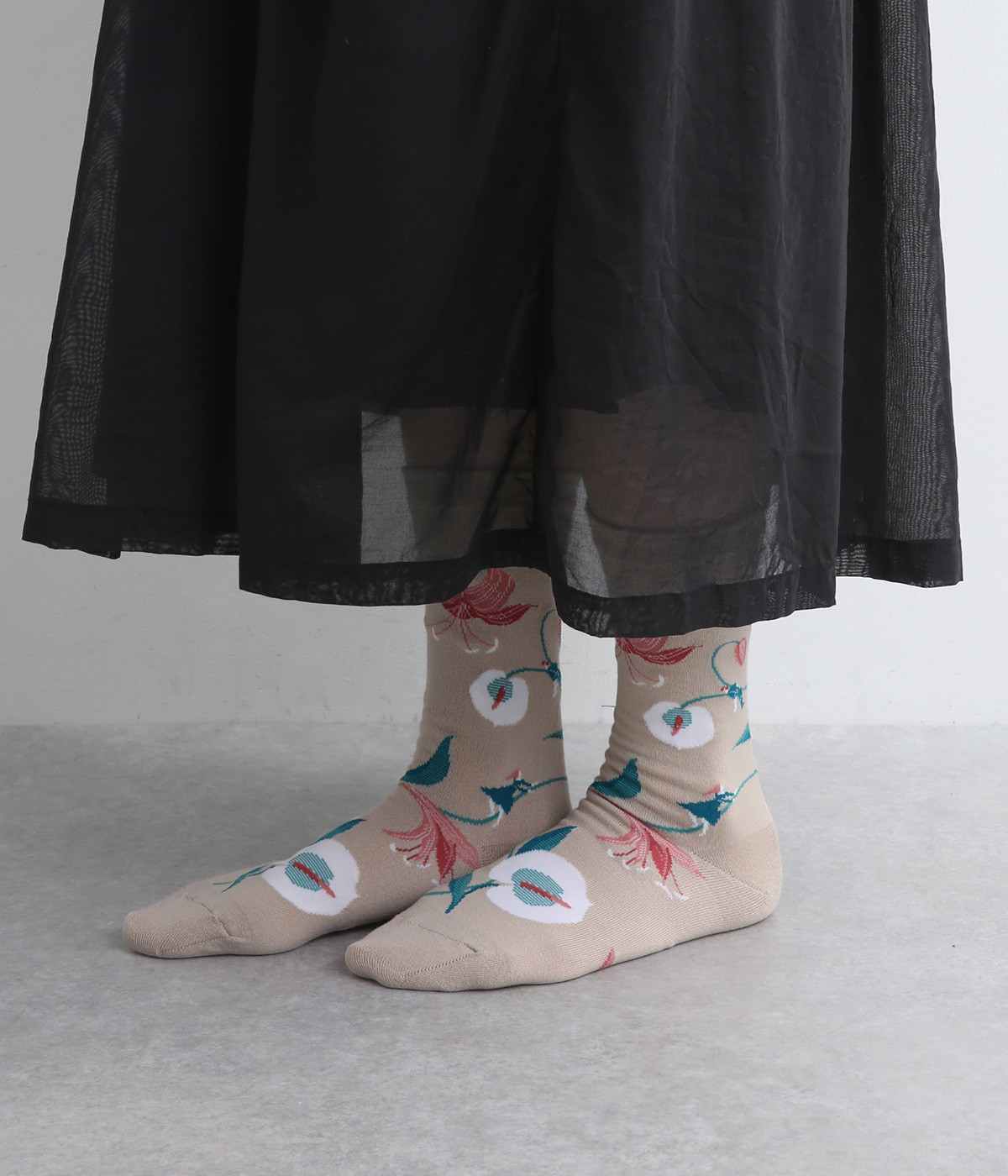 気品のあるお花を全面にあしらったクルー丈ソックス。落ち着いた配色で、さまざまな着こなしに合わせやすく、大人っぽい雰囲気を醸します。履き口はくしゅっと生地を寄せて肌にやさしくフィット。足元にさりげないアクセントを添える一足です。