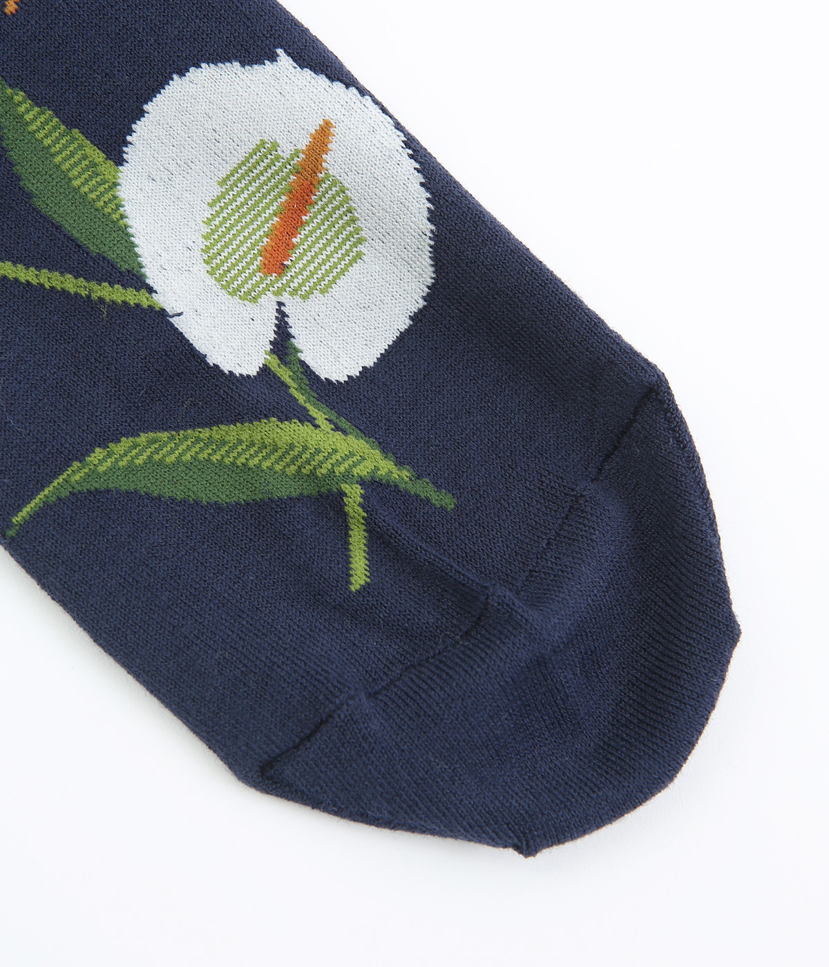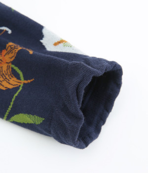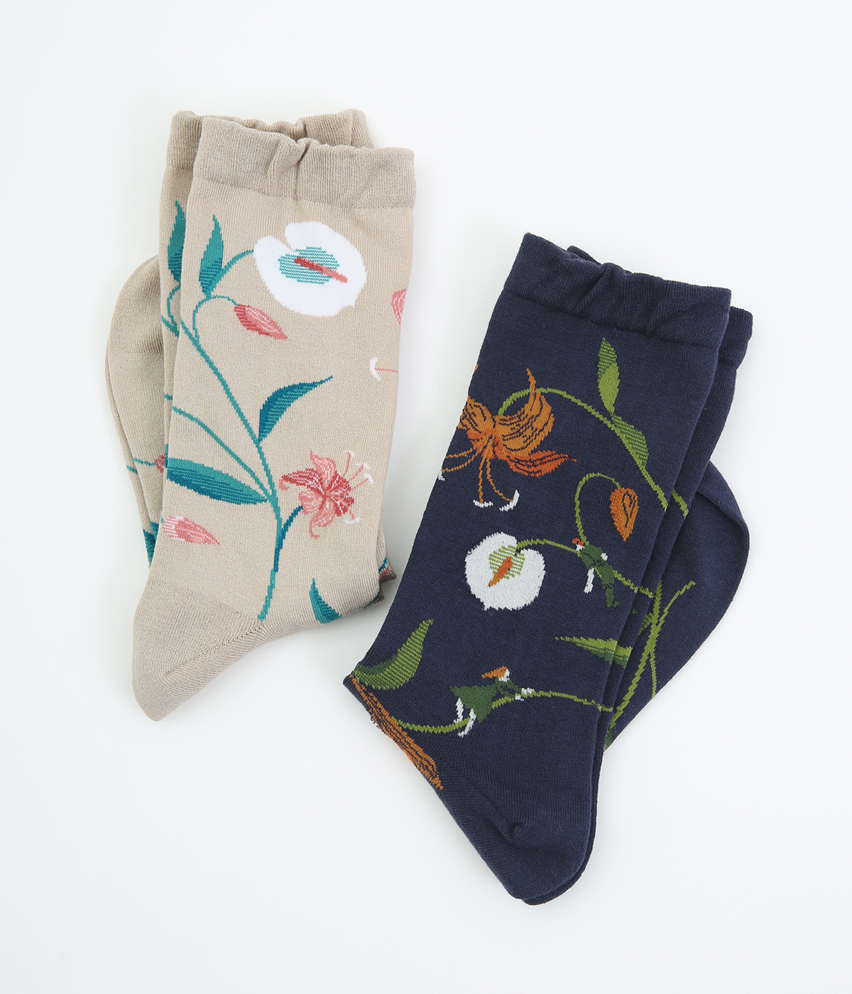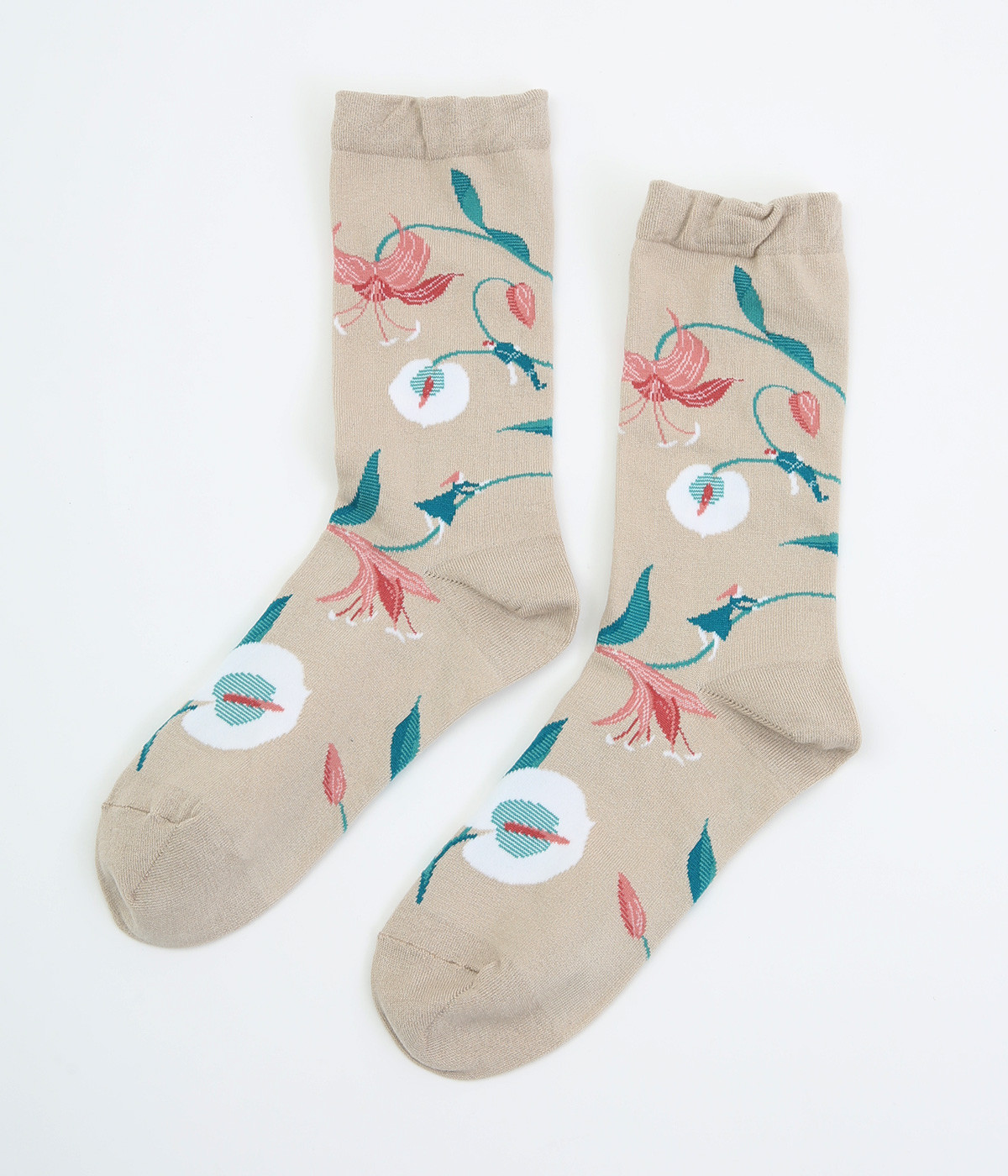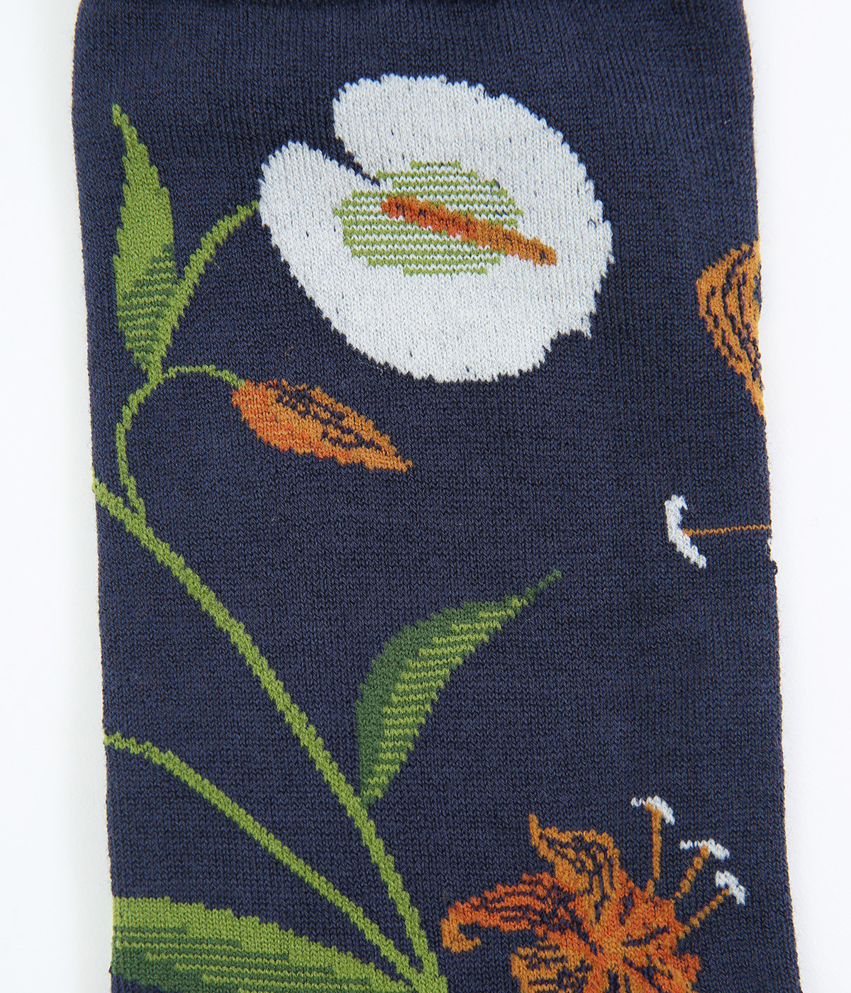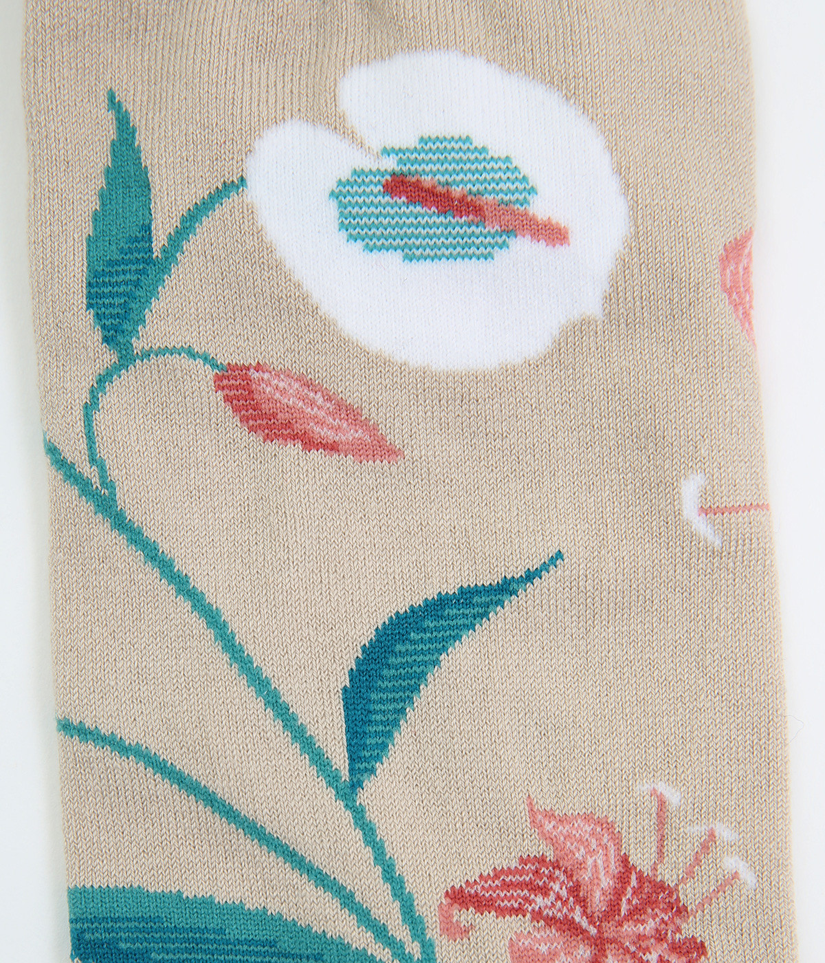 気品のあるお花を全面にあしらったクルー丈ソックス。落ち着いた配色で、さまざまな着こなしに合わせやすく、大人っぽい雰囲気を醸します。履き口はくしゅっと生地を寄せて肌にやさしくフィット。足元にさりげないアクセントを添える一足です。