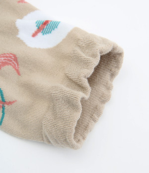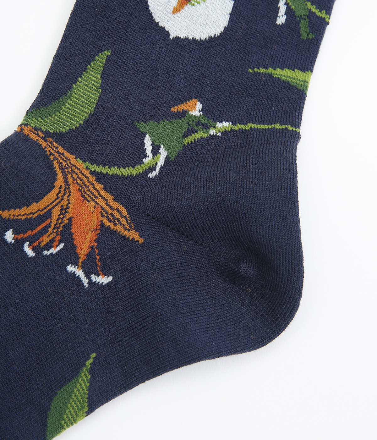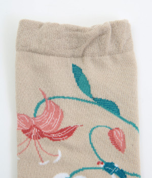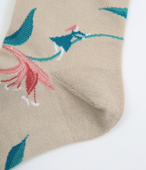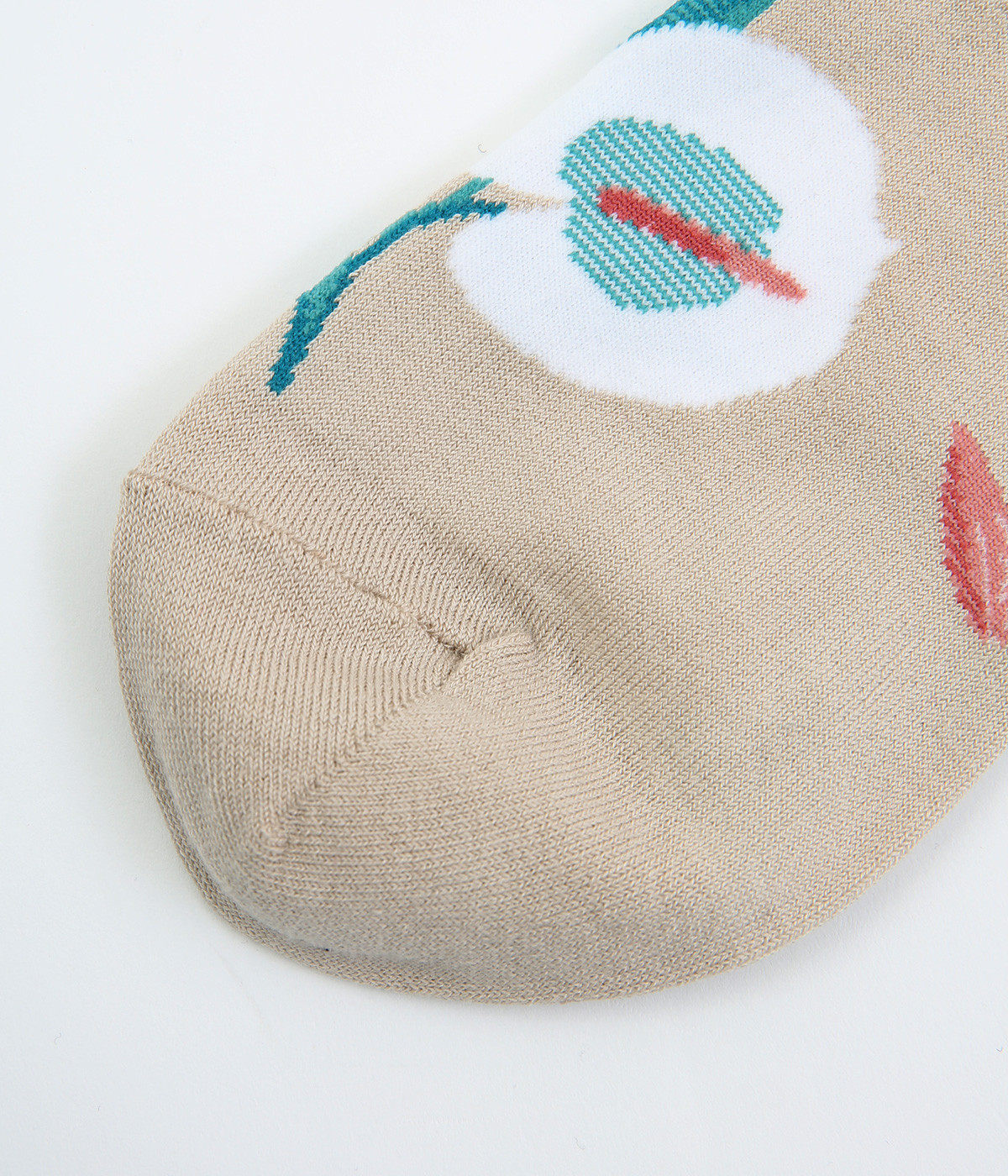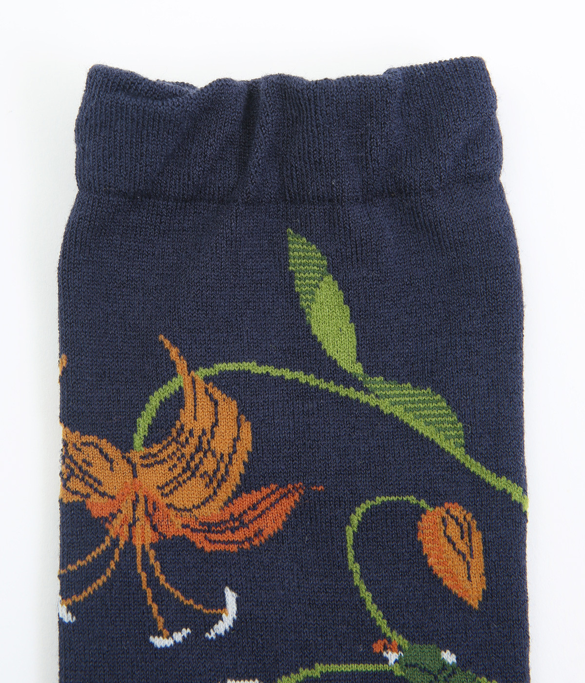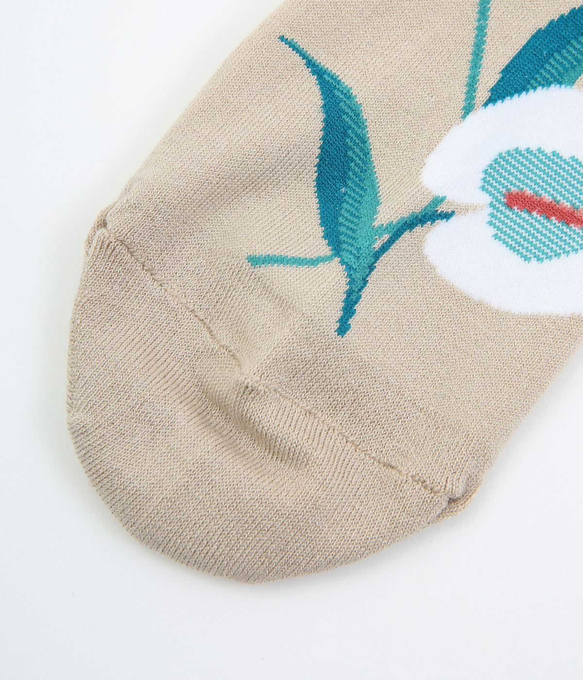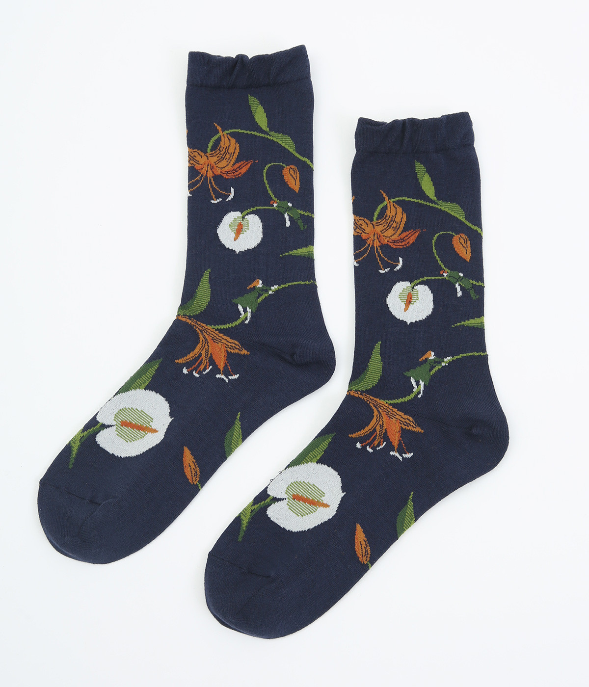 気品のあるお花を全面にあしらったクルー丈ソックス。落ち着いた配色で、さまざまな着こなしに合わせやすく、大人っぽい雰囲気を醸します。履き口はくしゅっと生地を寄せて肌にやさしくフィット。足元にさりげないアクセントを添える一足です。