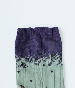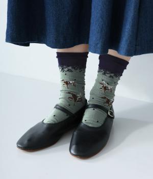 馬に乗って果物狩りをたのしむ人々の様子が描かれたソックスです。着こなしになじみやすく、足元をおしゃれに彩るくすみカラーがポイント。細かな編み目だからこそ表現できる、繊細な柄にも注目です。