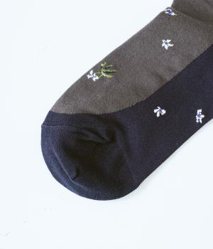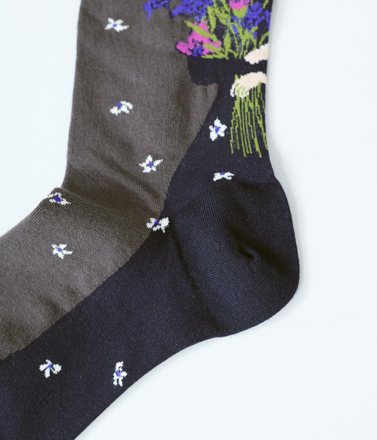 体よりも大きな花束を抱える女性が描かれた、幸福感あふれるハイソックスです。背面を中心にほどこされたデザインが、後ろ姿の華やかさをアップ。全体に散りばめられた小さなお花も愛らしいポイントです。