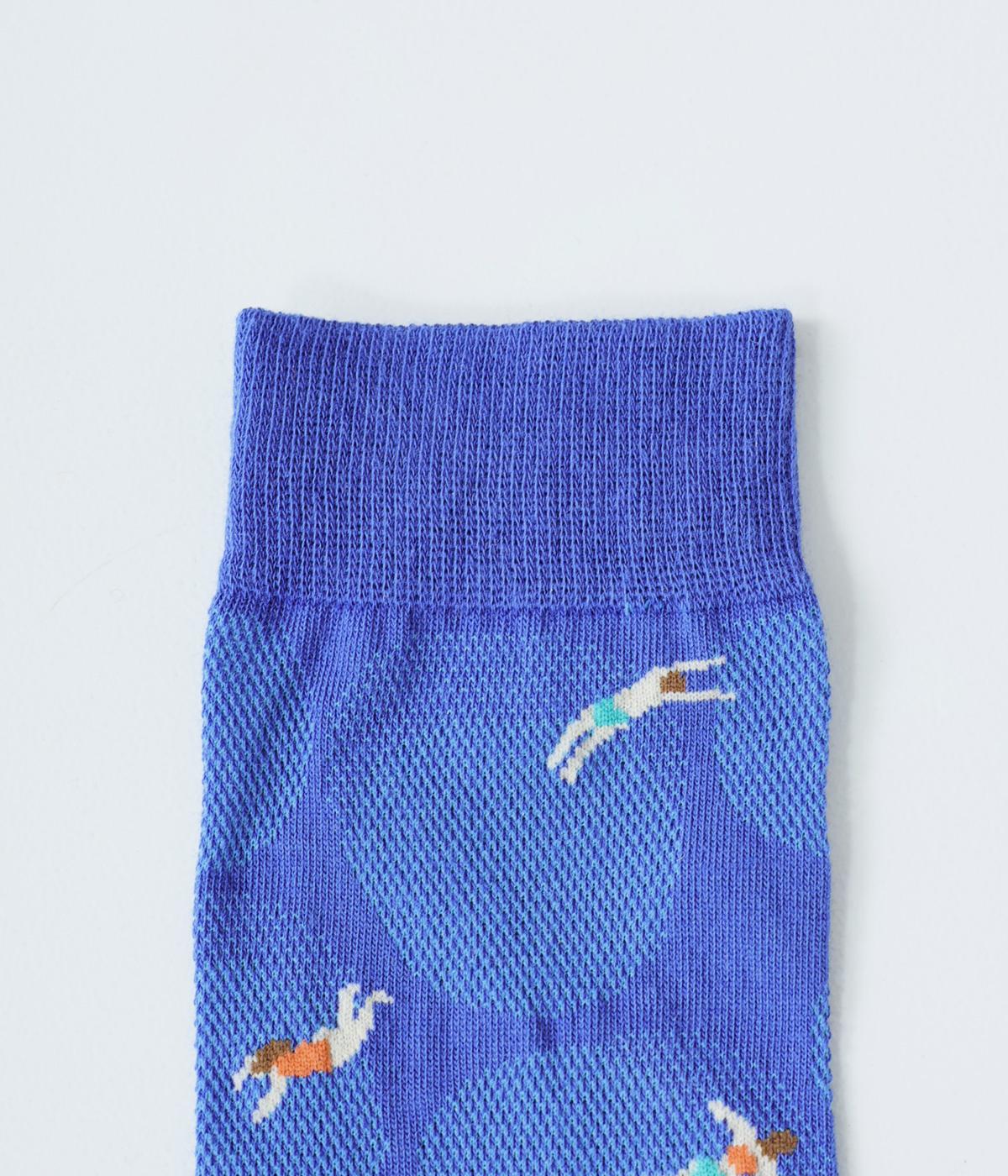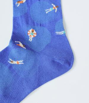 プールで気持ちよさそうに泳ぐ人々が描かれたユニークなデザインが魅力です。柄自体は小さめなので、個性的になりすぎずデイリー使いしやすいのもうれしいポイント。やや薄手なのでパンプスやサンダルとも好相性です。