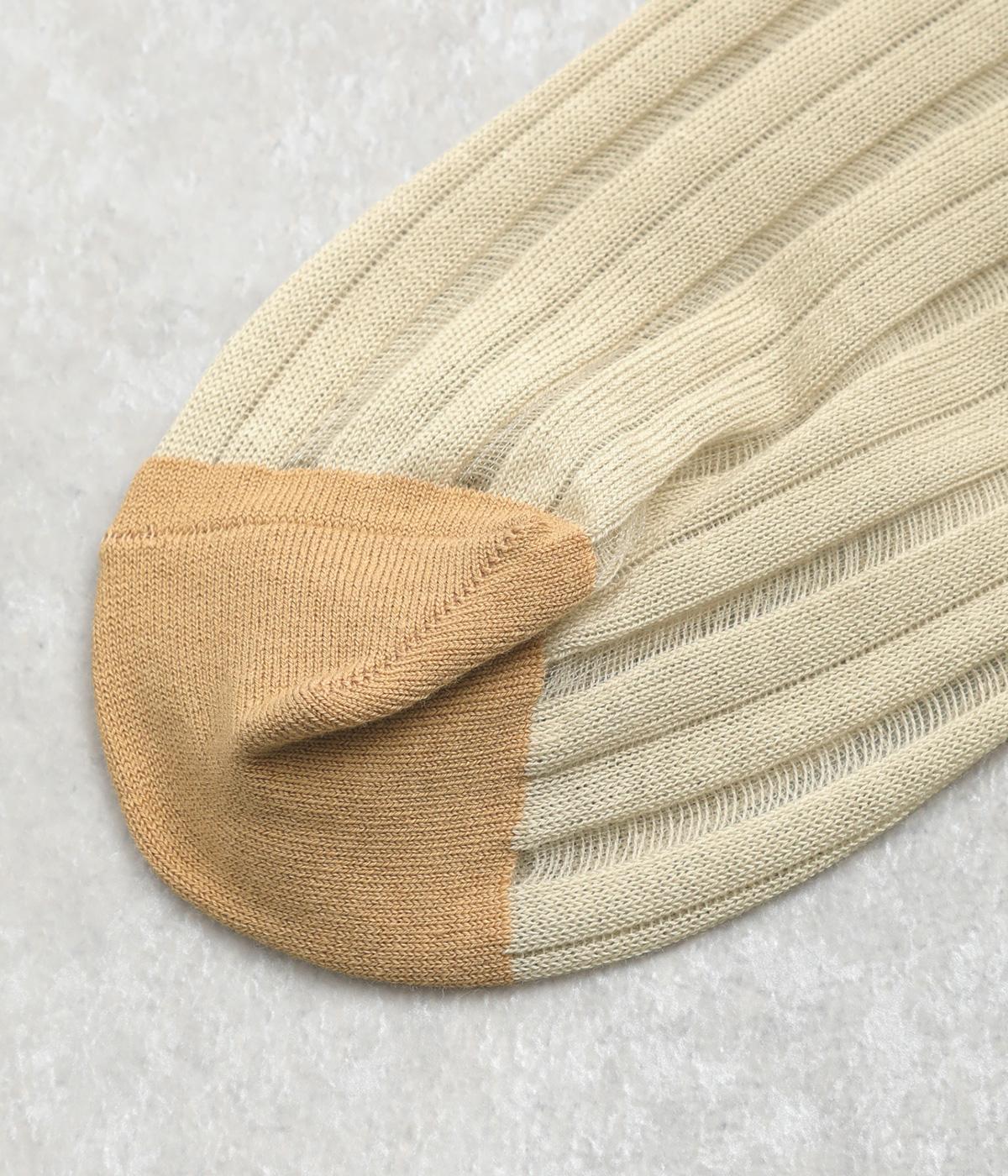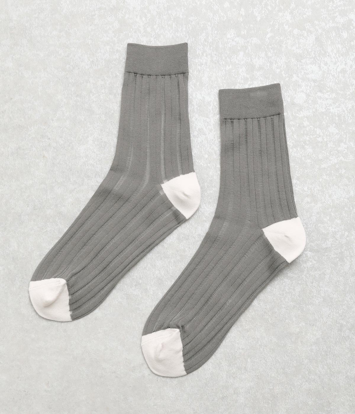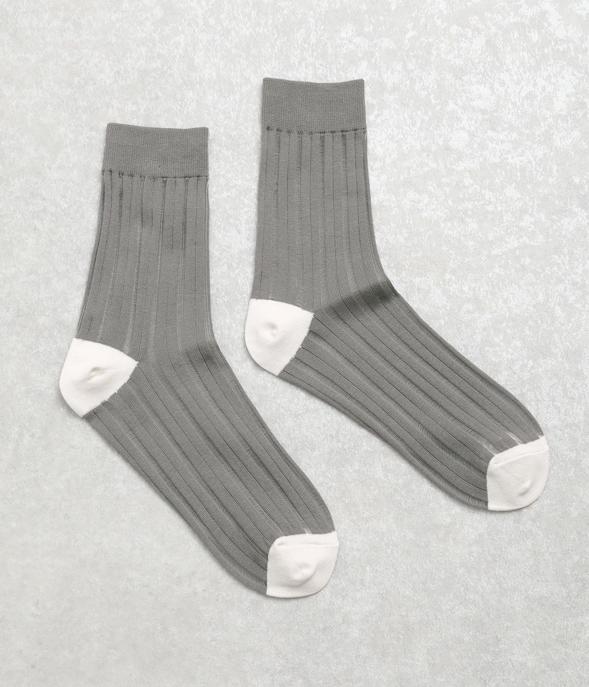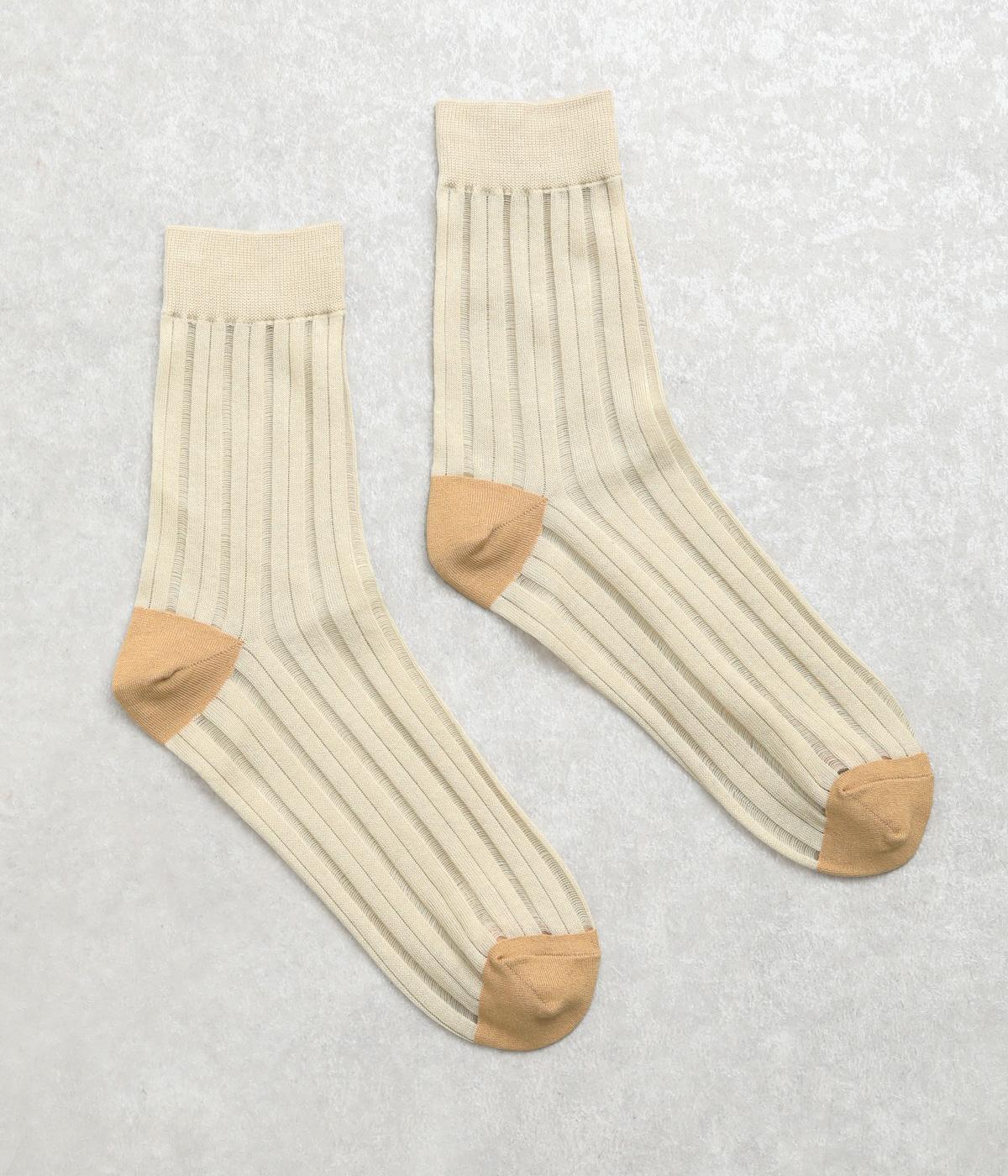 透け感のあるストライプ柄が大人のカジュアルスタイルを盛り上げる上質なソックス。つま先とかかとをバイカラーにして、さり気なくアクセントをきかせています。デイリースタイルに取り入れやすくもワンランクアップした上品な装いに。
