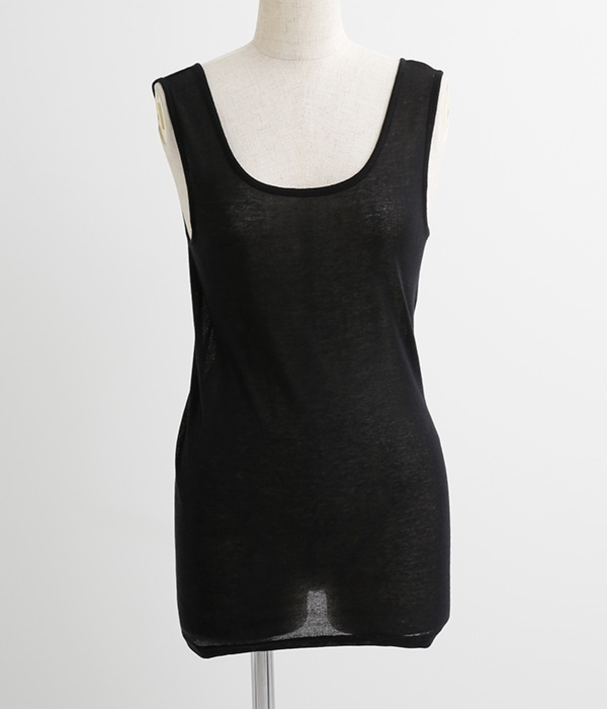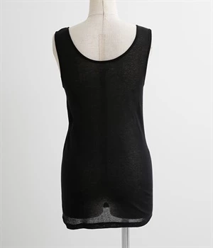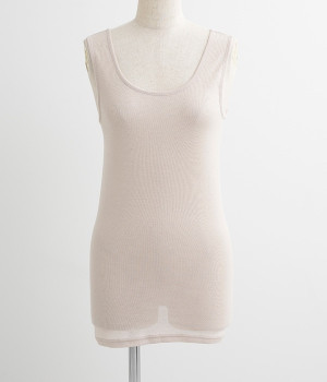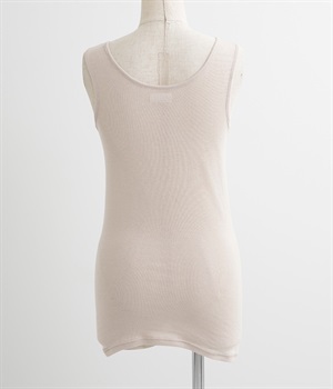 肌に触れる内側が正絹、外側が極細のコットンの特殊な2重構造の生地で仕立てたタンクトップです。繊維の間に空気をたくさん含むので、ガーゼのようにふんわり柔らかく軽い着心地。脇に縫い目の無い筒編みでボディに優しくフィットしながらも、とてもよく伸びます。着丈はヒップが隠れるほどの長さですので、冷え対策にもオススメです。