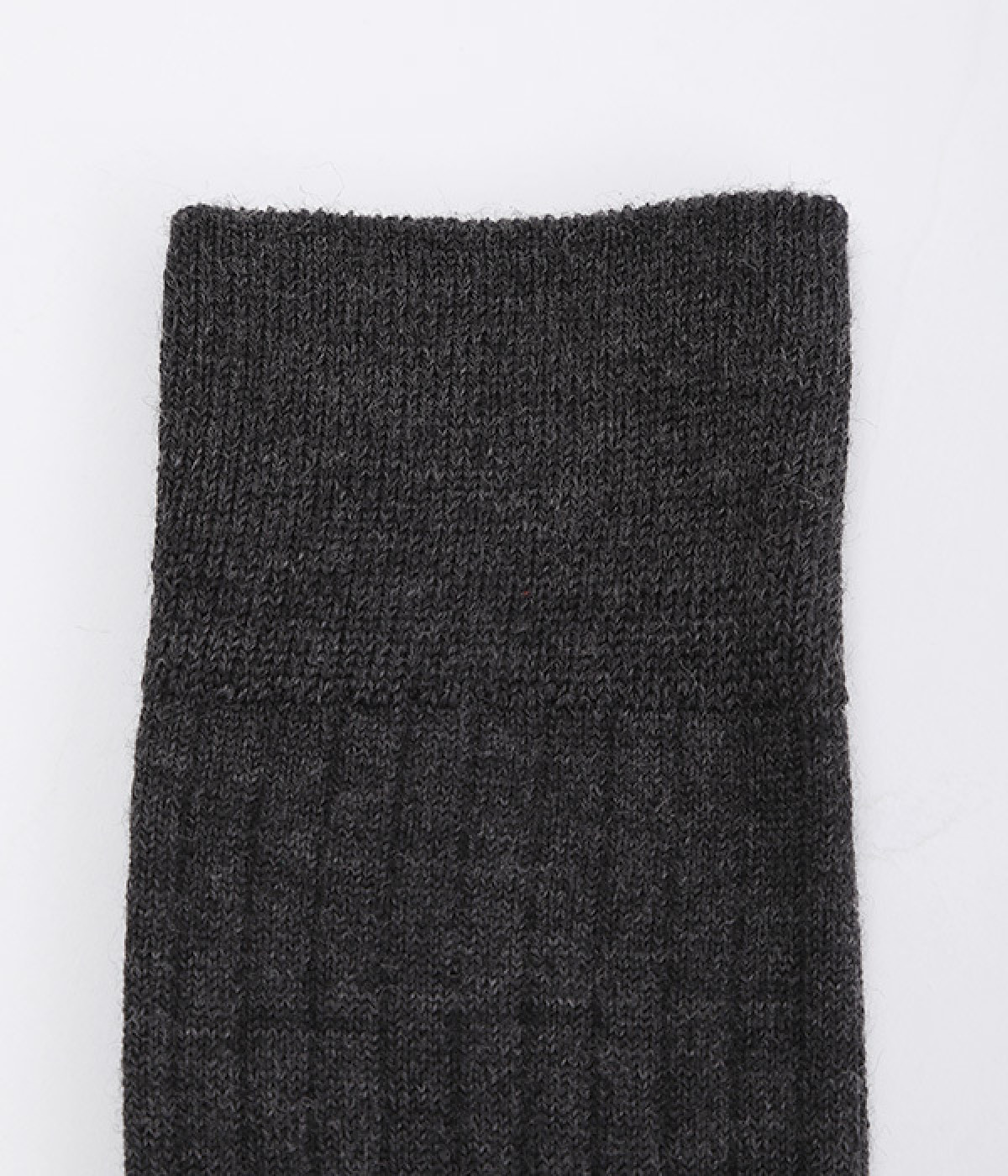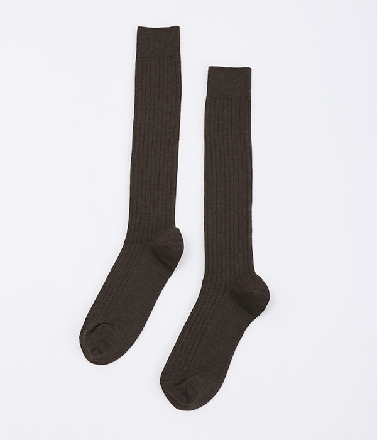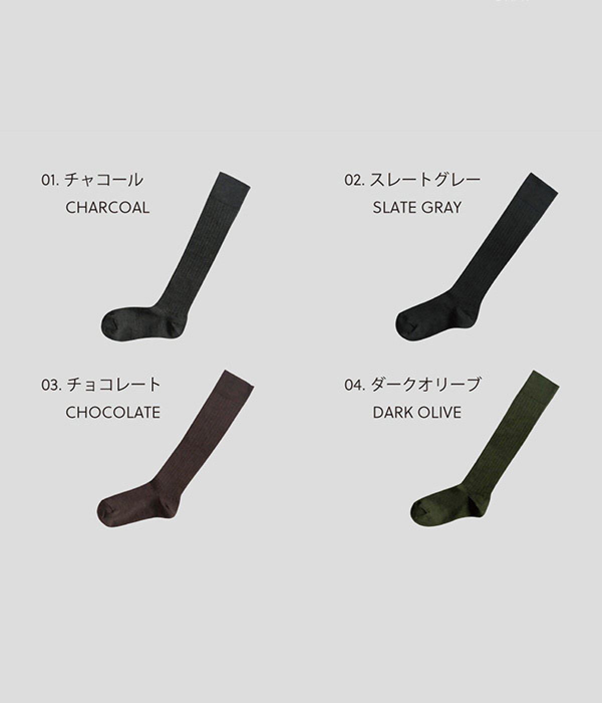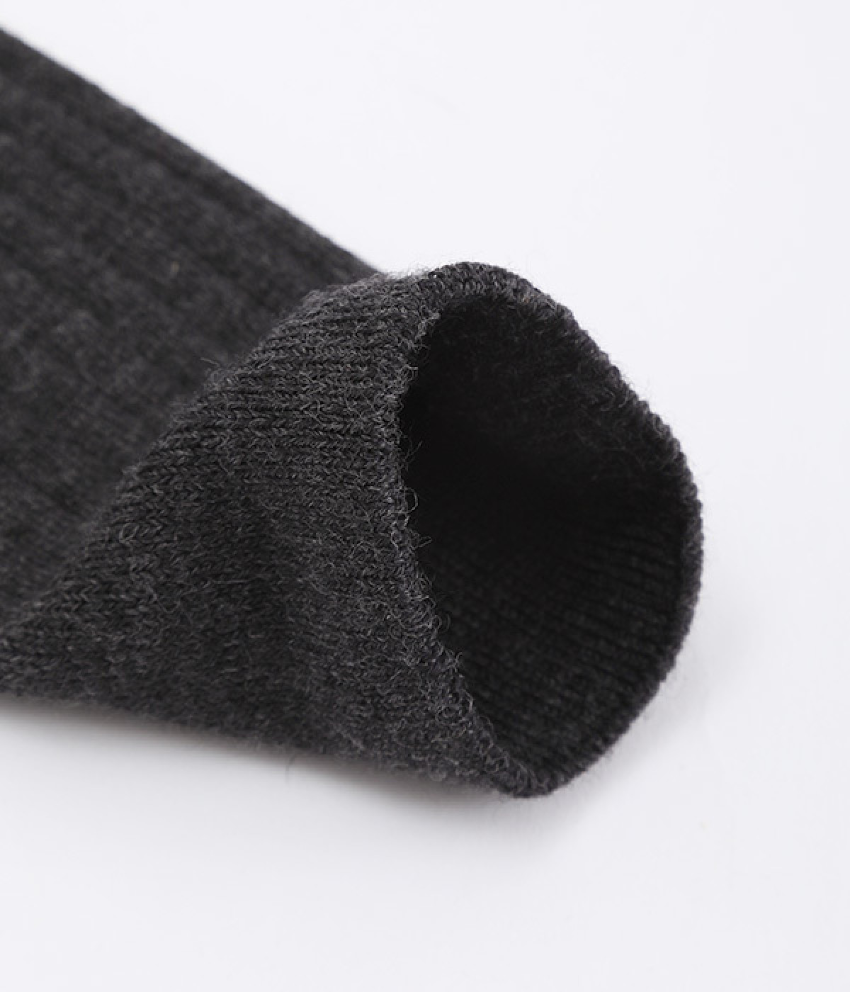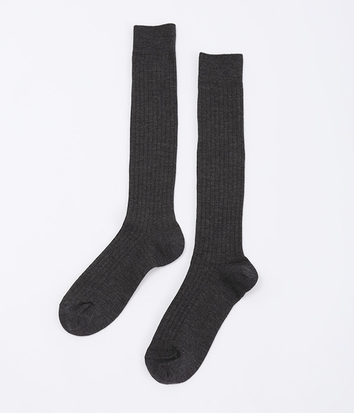 程よい光沢感や暖かみがあるウール素材のハイソックスです。ゆったりと編むことでウールの柔らかさを最大限に引き出しています。保温性が高く、ウールらしい膨らみを感じられます。伸縮性に富んだ編み方をしているので、ひざ下までゆったりと履けます。あえてクシャっとたるませてボトムとの隙間に肌を出し、抜け感を演出するのもおすすめです。