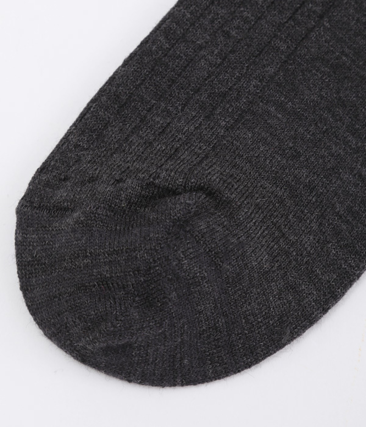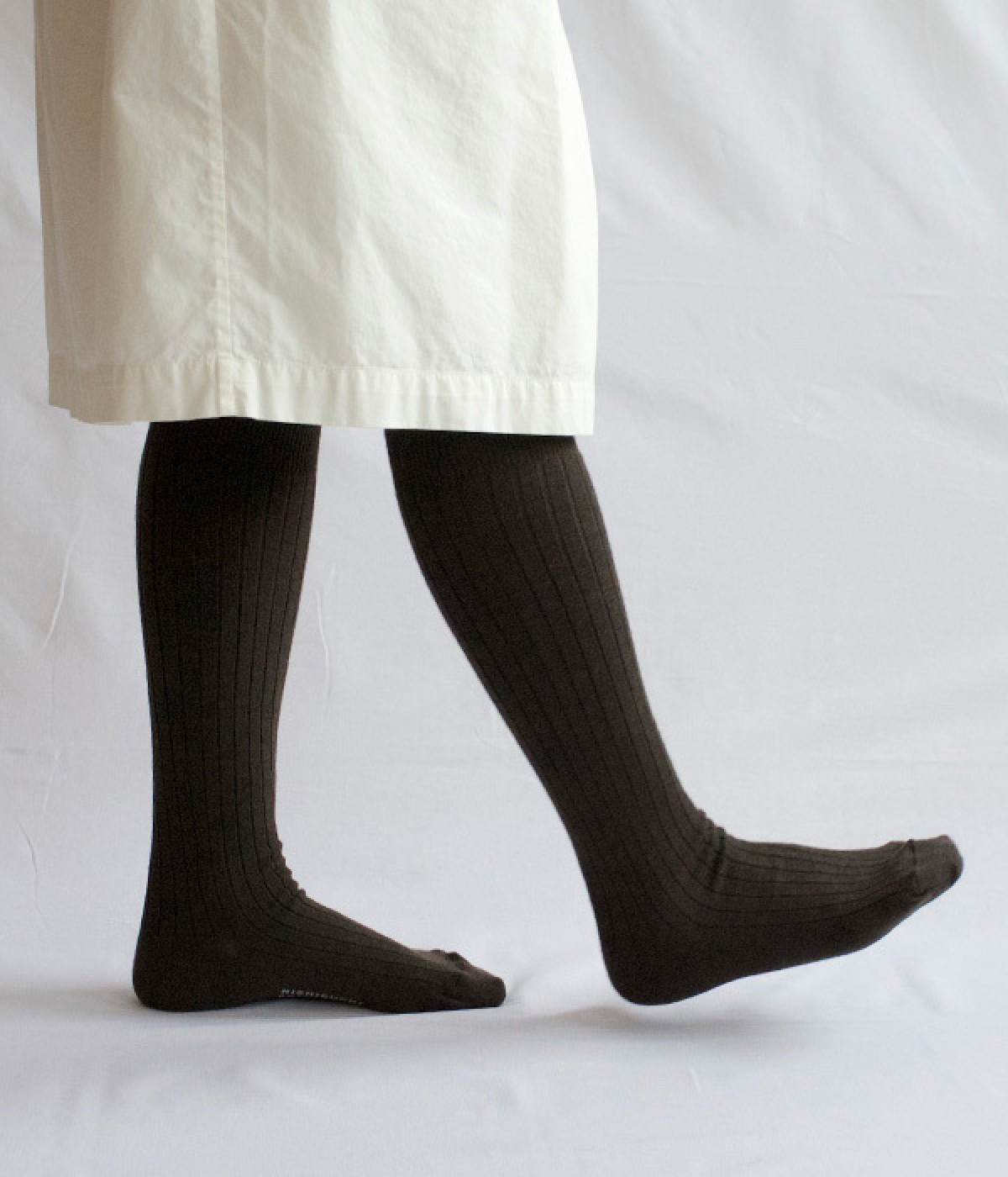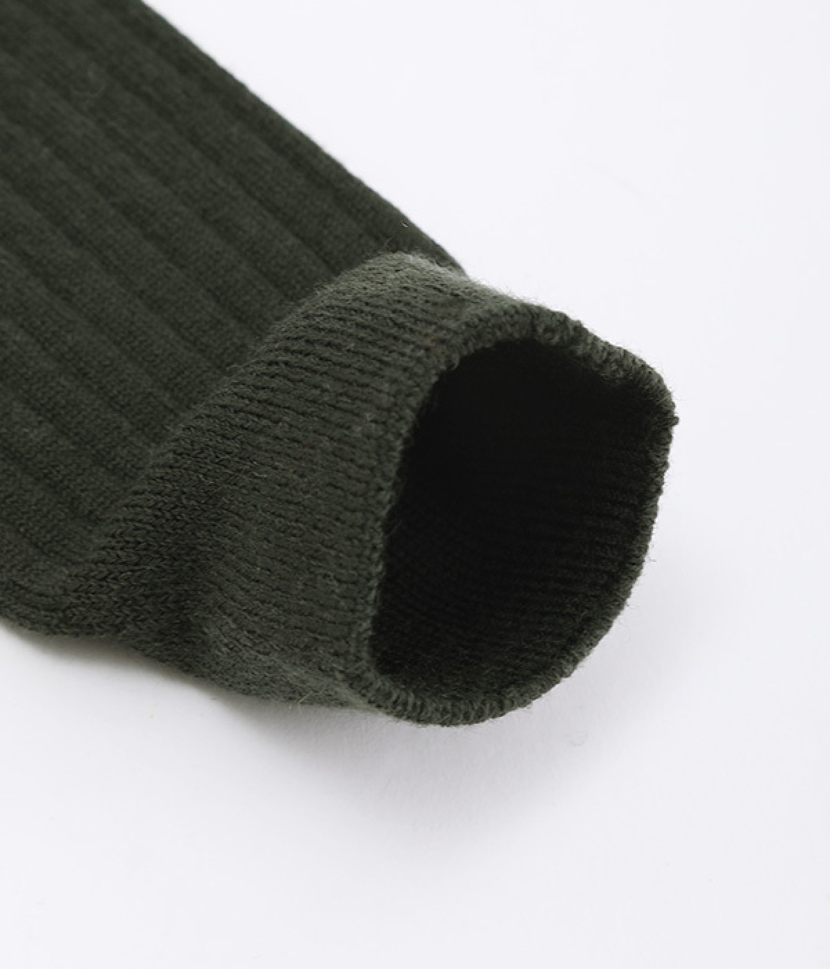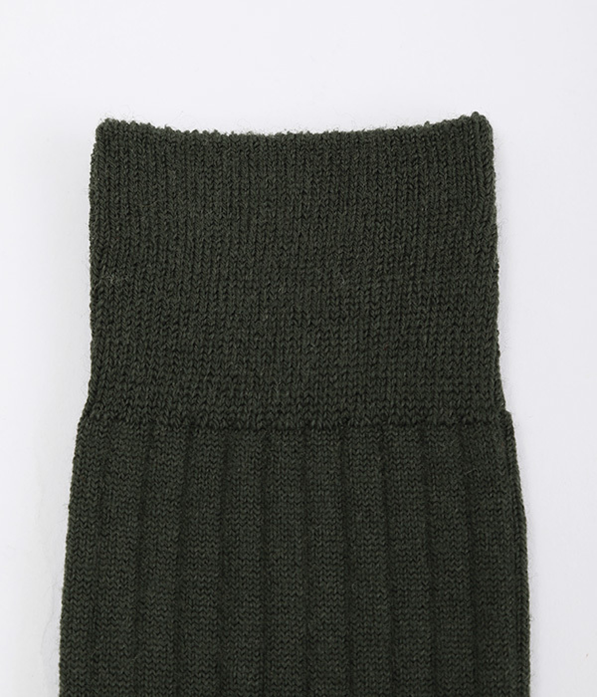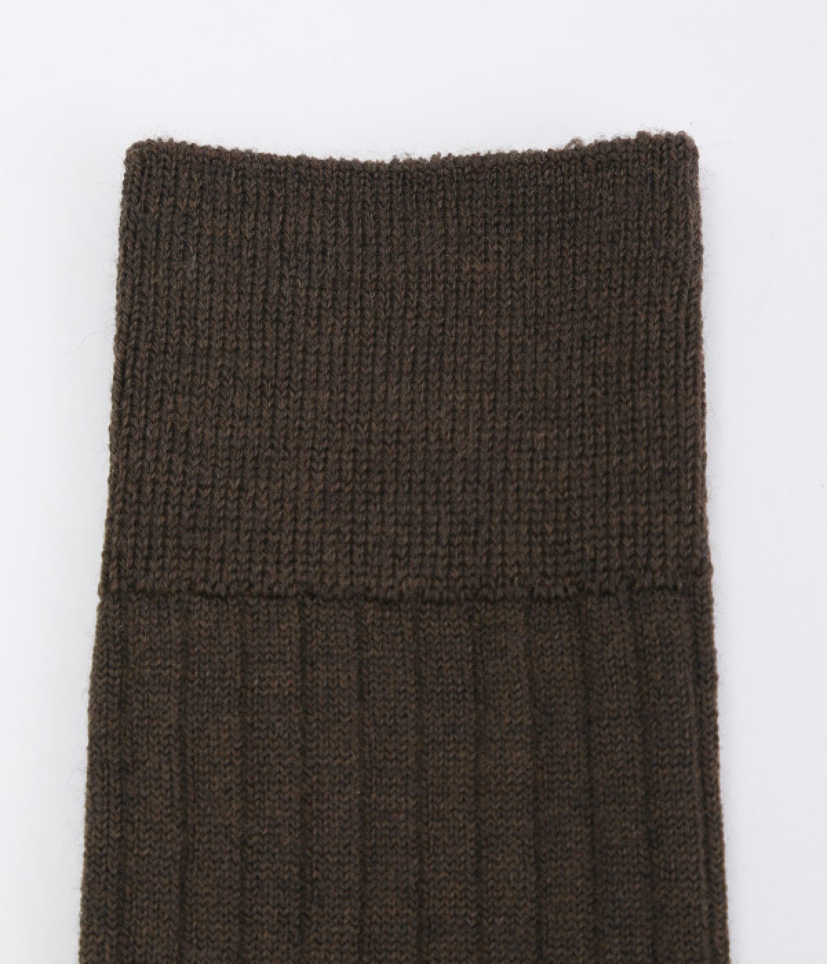程よい光沢感や暖かみがあるウール素材のハイソックスです。ゆったりと編むことでウールの柔らかさを最大限に引き出しています。保温性が高く、ウールらしい膨らみを感じられます。伸縮性に富んだ編み方をしているので、ひざ下までゆったりと履けます。あえてクシャっとたるませてボトムとの隙間に肌を出し、抜け感を演出するのもおすすめです。