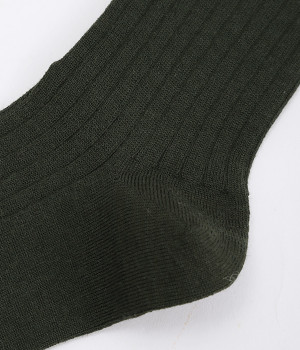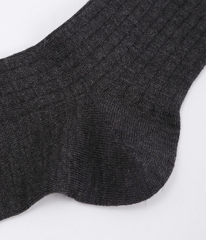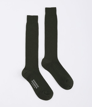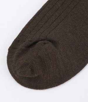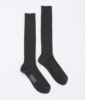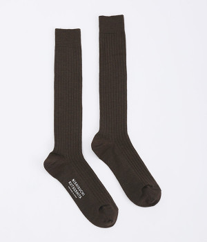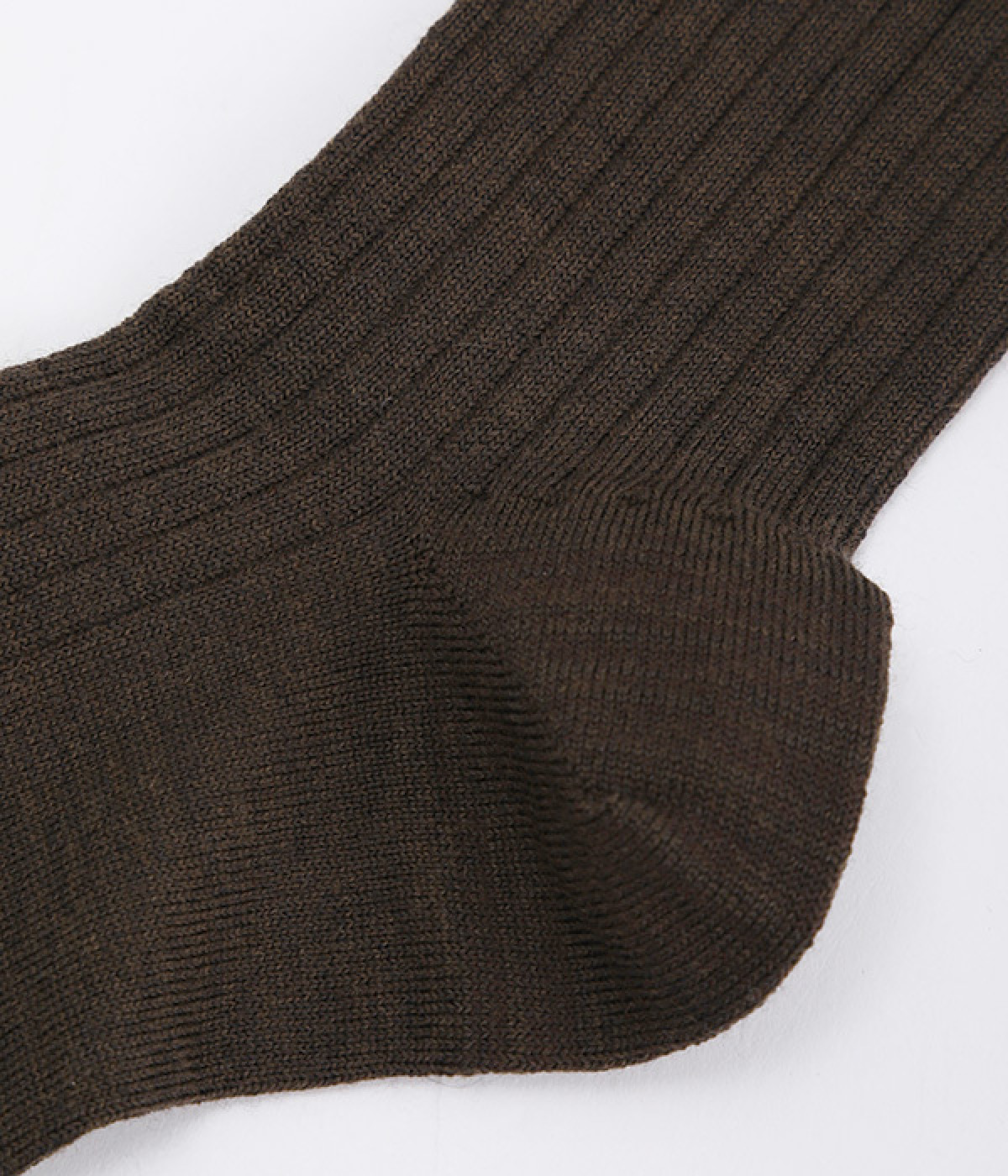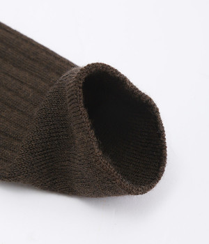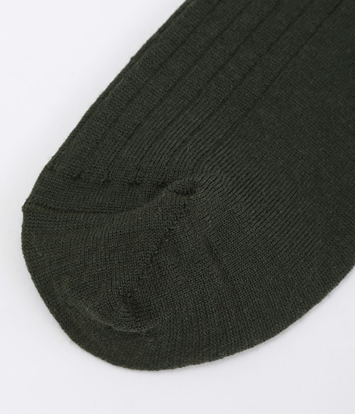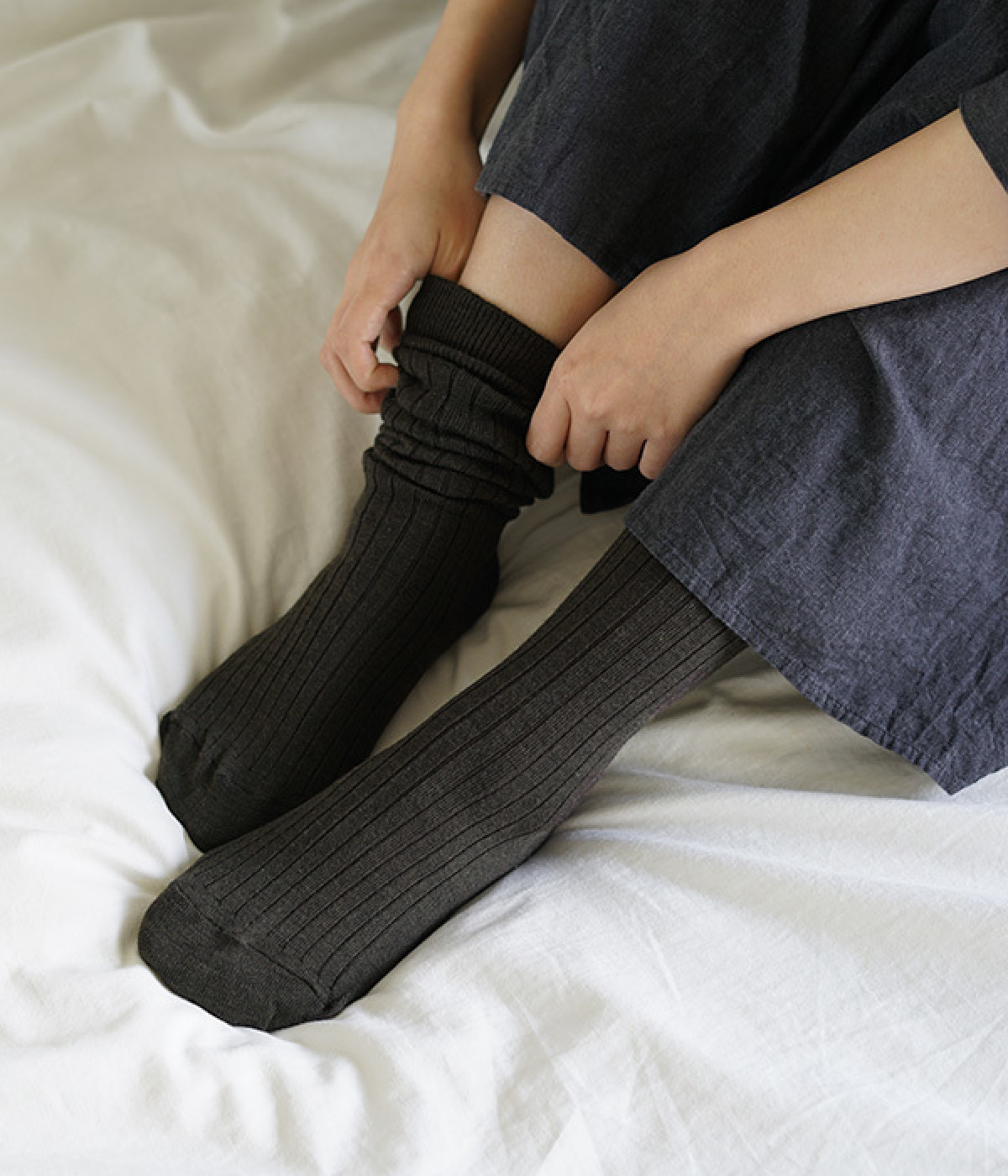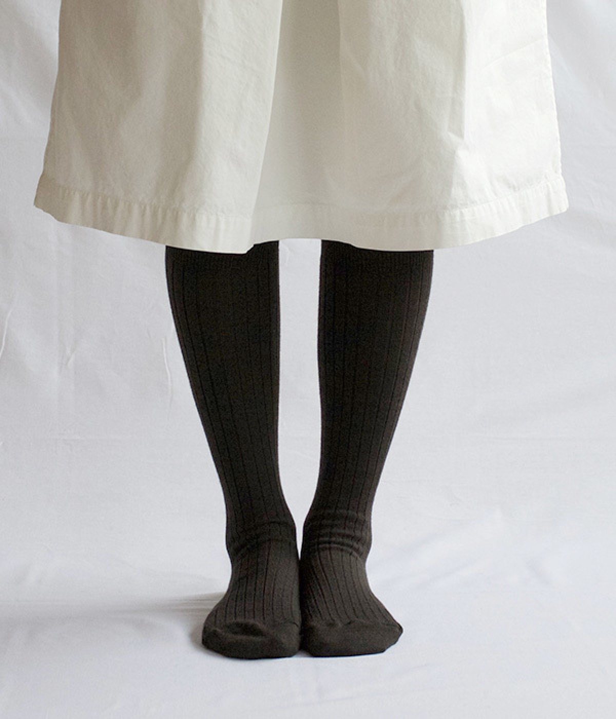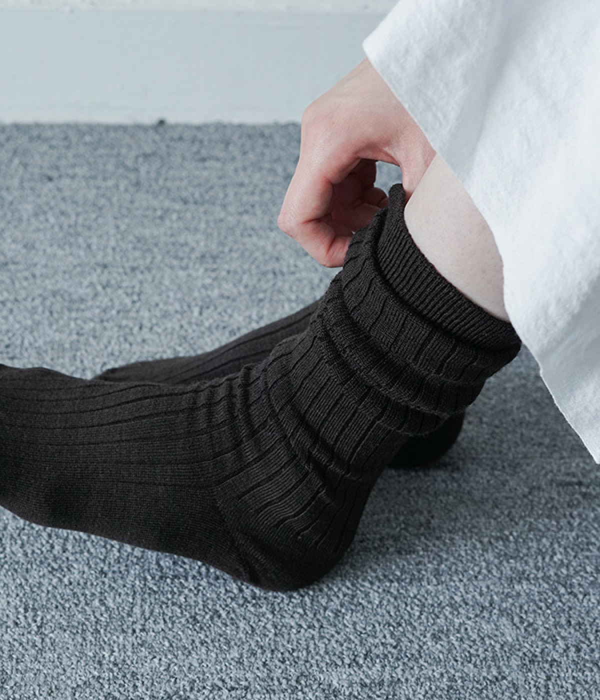 程よい光沢感や暖かみがあるウール素材のハイソックスです。ゆったりと編むことでウールの柔らかさを最大限に引き出しています。保温性が高く、ウールらしい膨らみを感じられます。伸縮性に富んだ編み方をしているので、ひざ下までゆったりと履けます。あえてクシャっとたるませてボトムとの隙間に肌を出し、抜け感を演出するのもおすすめです。