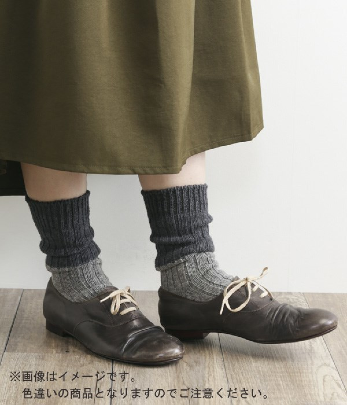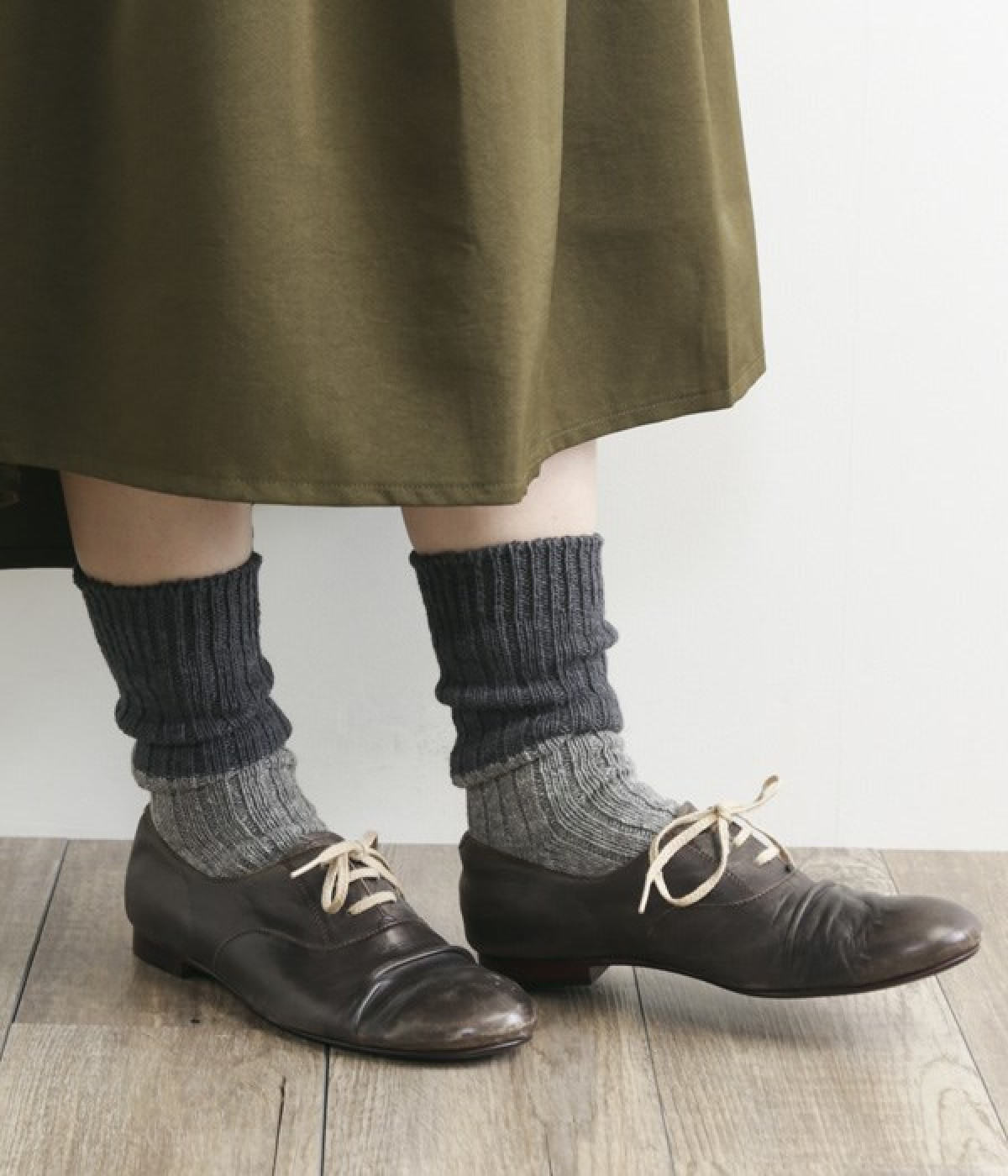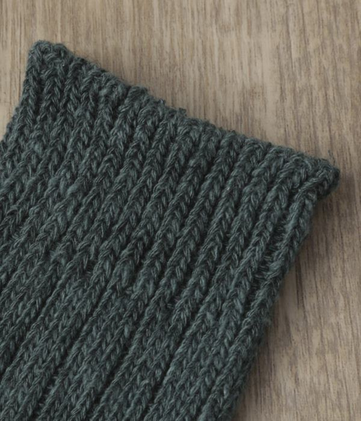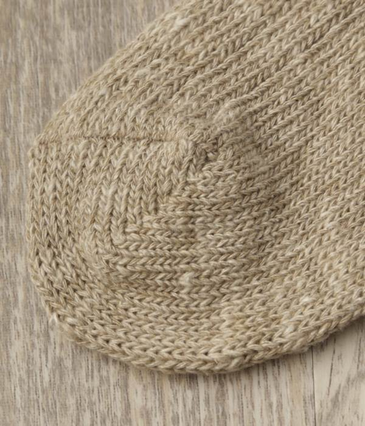 ウールとコットンをブレンドし、甘くポツポツとスラブ調に撚った糸で編み上げられたリブソックスです。スラブ調がカジュアル感を醸し出し、甘く撚った糸からは柔らかさと温かみが伝わってきます。履くほどにヴィンテージ感が増すので長くご愛用頂けます。コットンとウールで少し色差を出した染め方で味わい深い表情に。ぜひ甲の浅い靴と合わせてバイカラーデザインをお楽しみください。