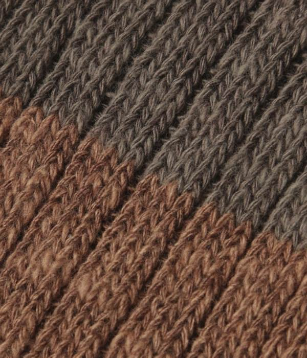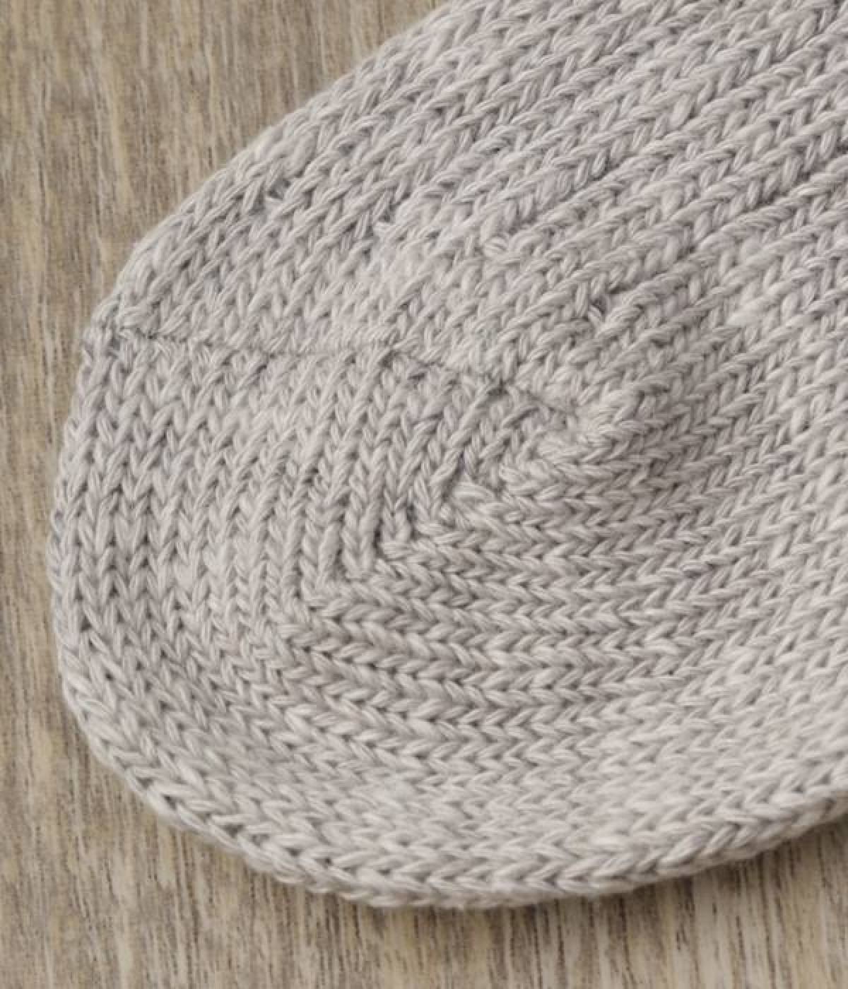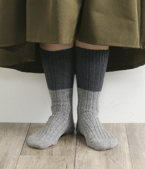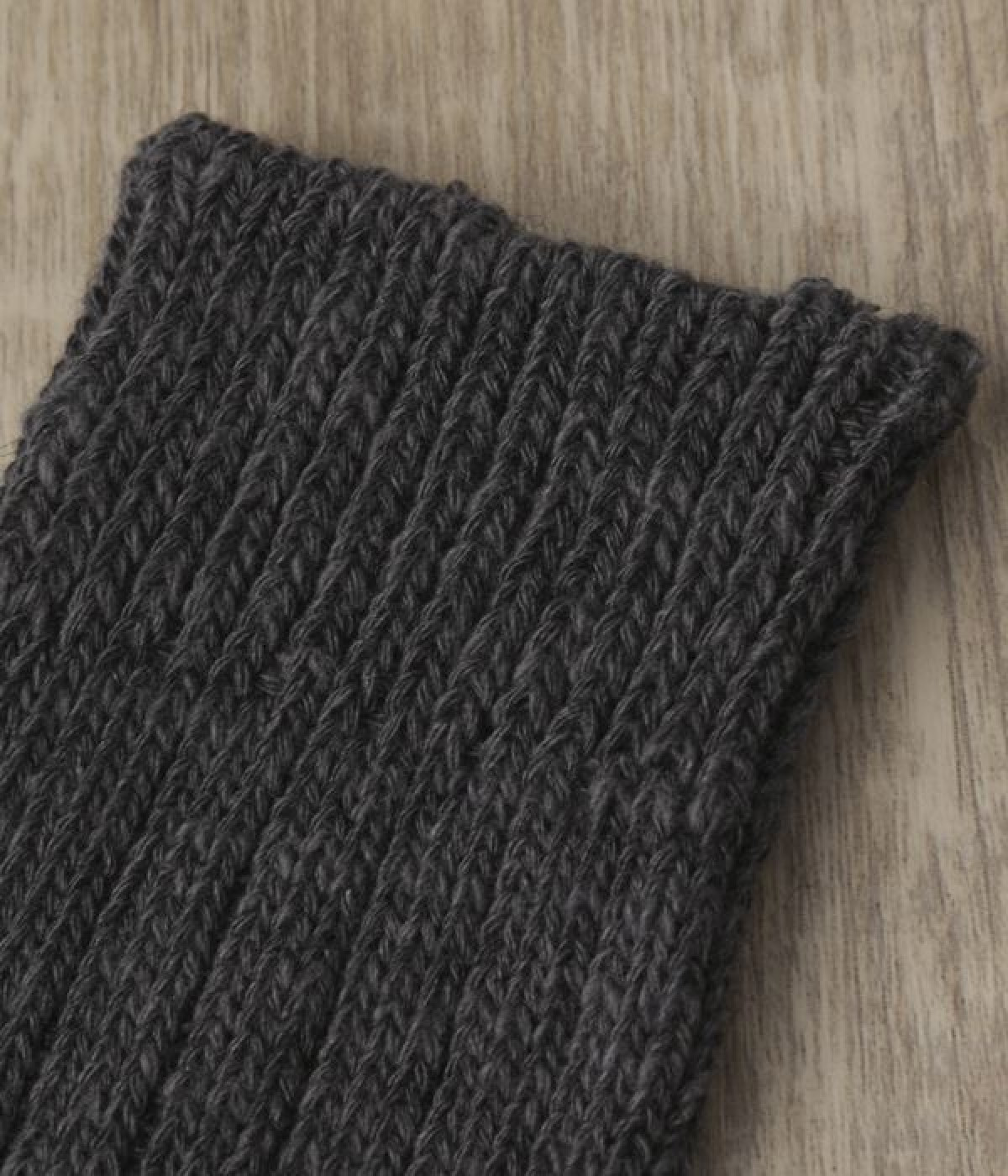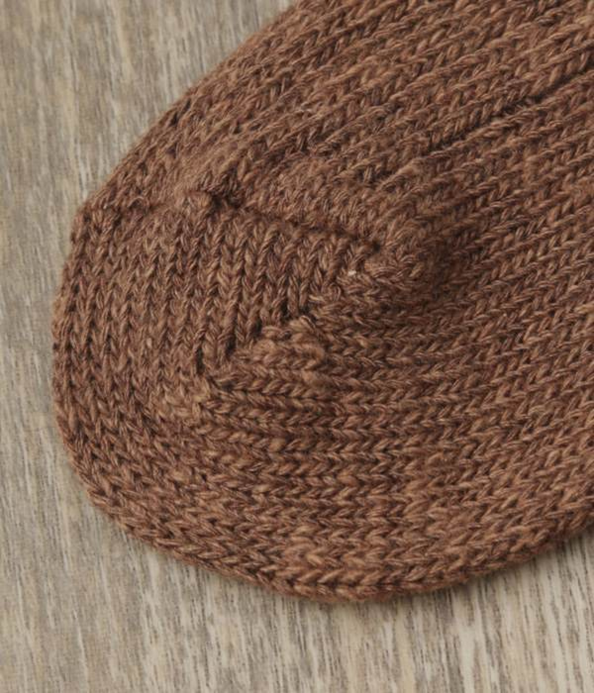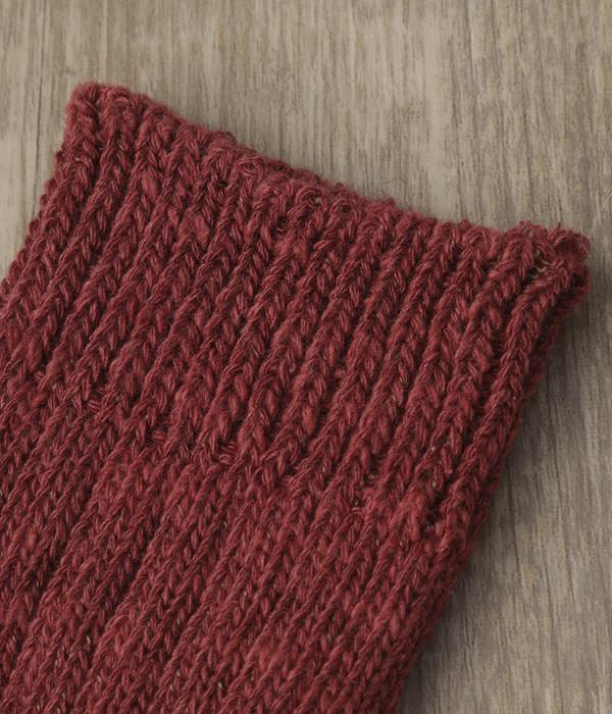 ウールとコットンをブレンドし、甘くポツポツとスラブ調に撚った糸で編み上げられたリブソックスです。スラブ調がカジュアル感を醸し出し、甘く撚った糸からは柔らかさと温かみが伝わってきます。履くほどにヴィンテージ感が増すので長くご愛用頂けます。コットンとウールで少し色差を出した染め方で味わい深い表情に。ぜひ甲の浅い靴と合わせてバイカラーデザインをお楽しみください。