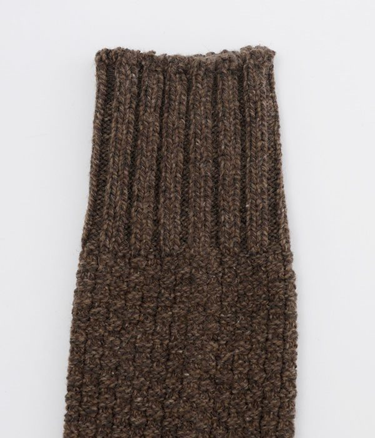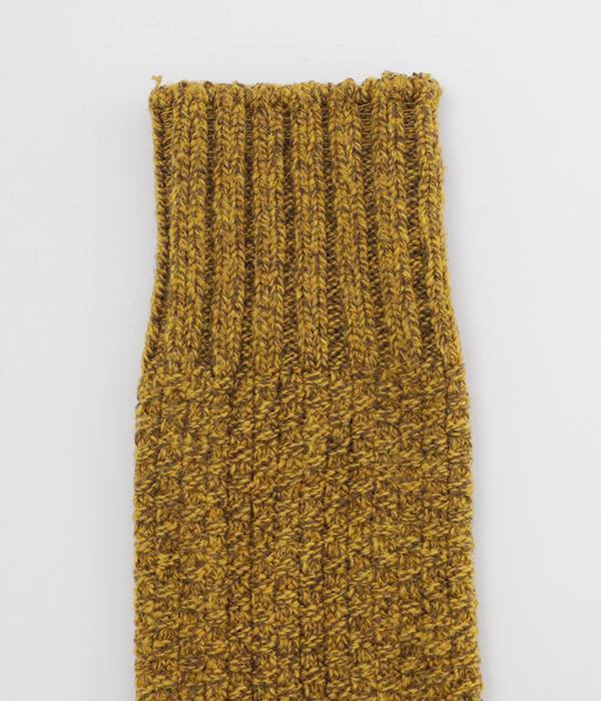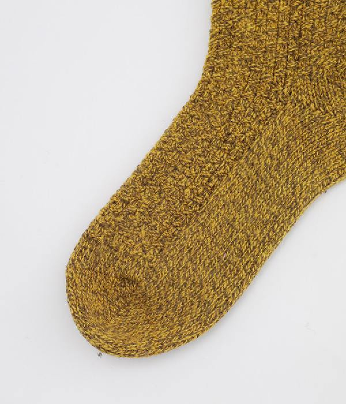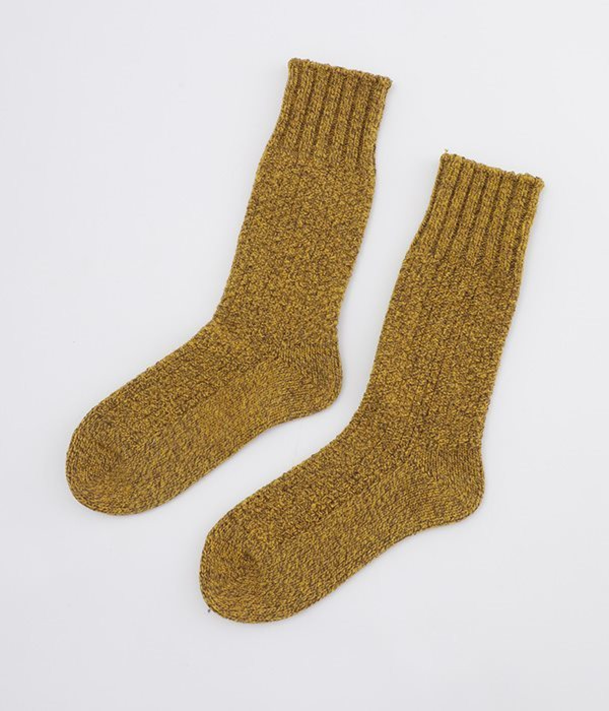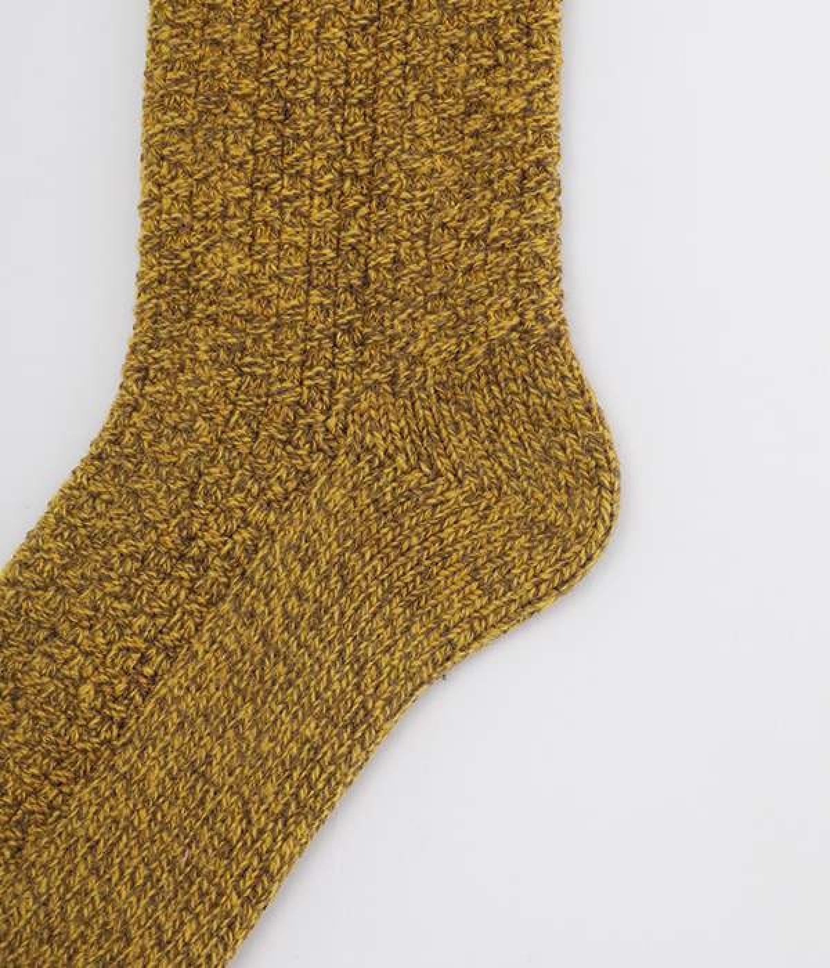 リサイクルウールとコットンをブレンドした、環境にやさしい厚手のソックス。通常のウールより丈夫なので、キャンプやトレッキングなどのアクティブな日にもおすすめです。履き口は長めのリブ編みで引き締めてすっきりと見せ、ずり落ちにくさもプラス。ナチュラルなアースカラーもアウトドアシーンになじみます。