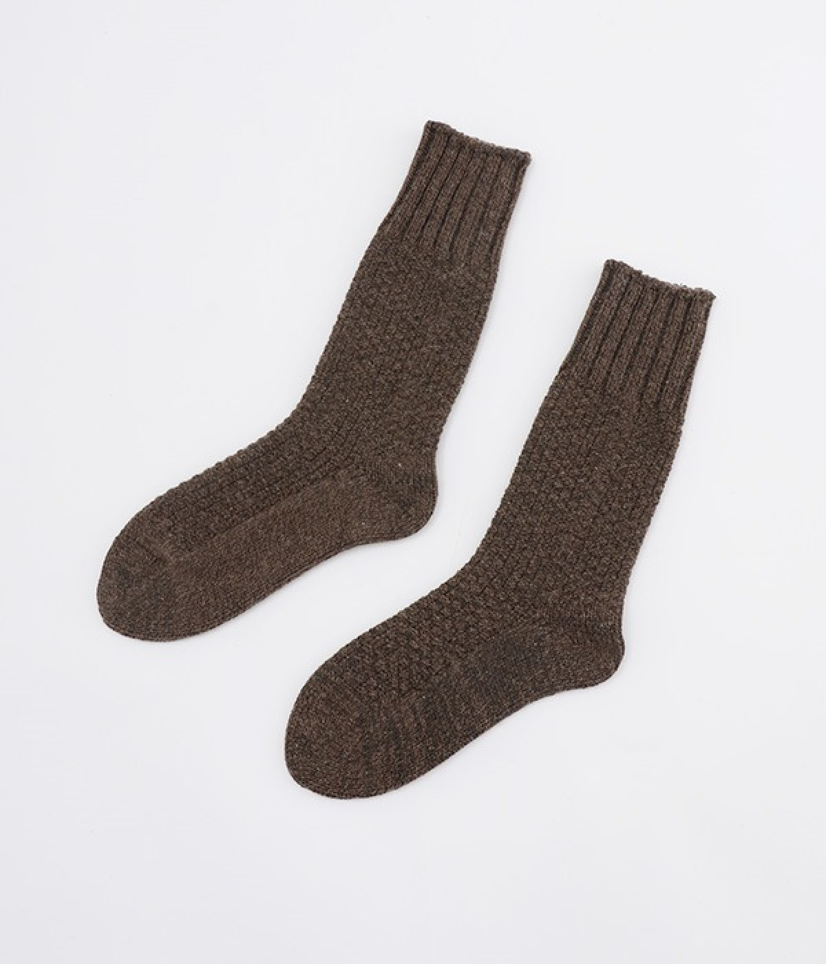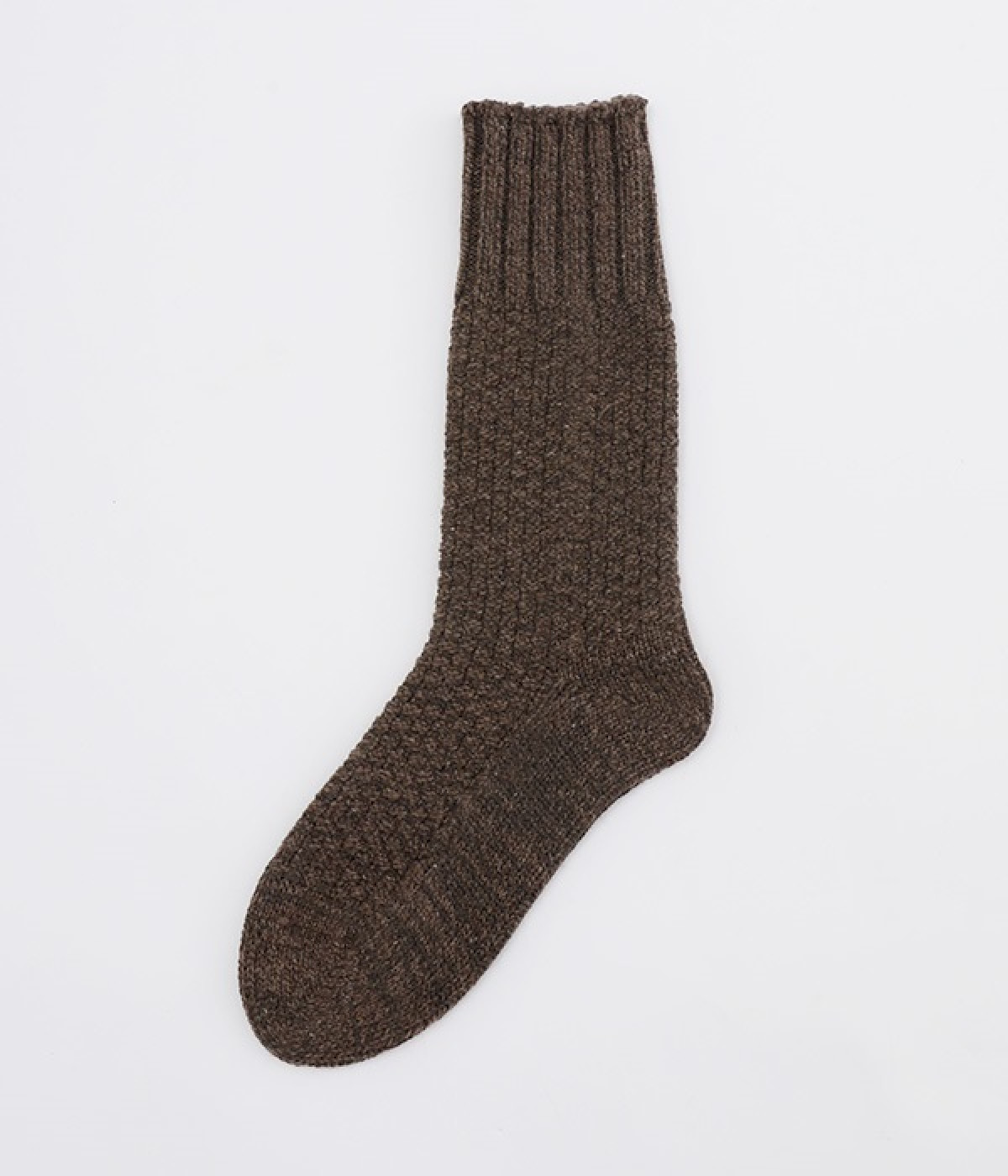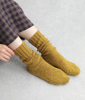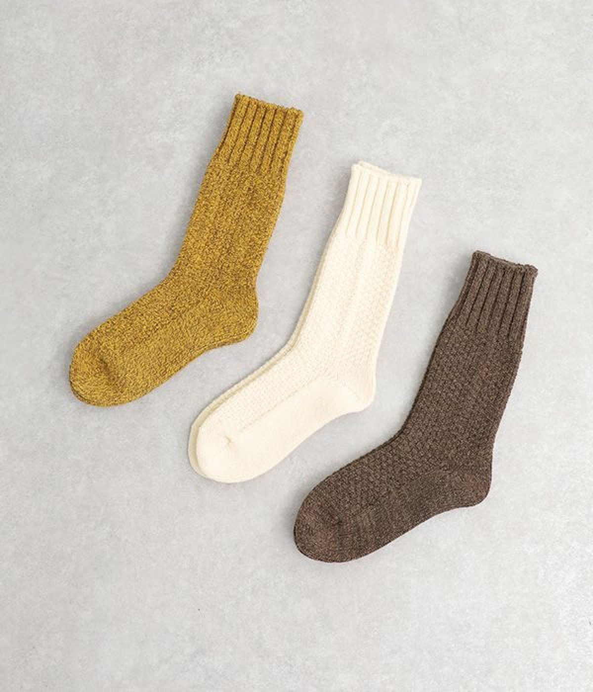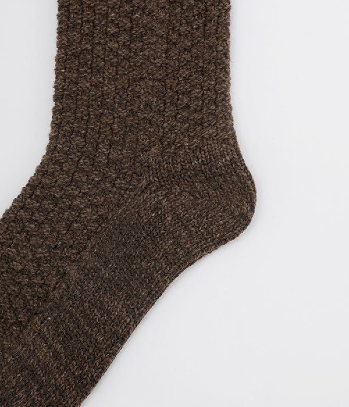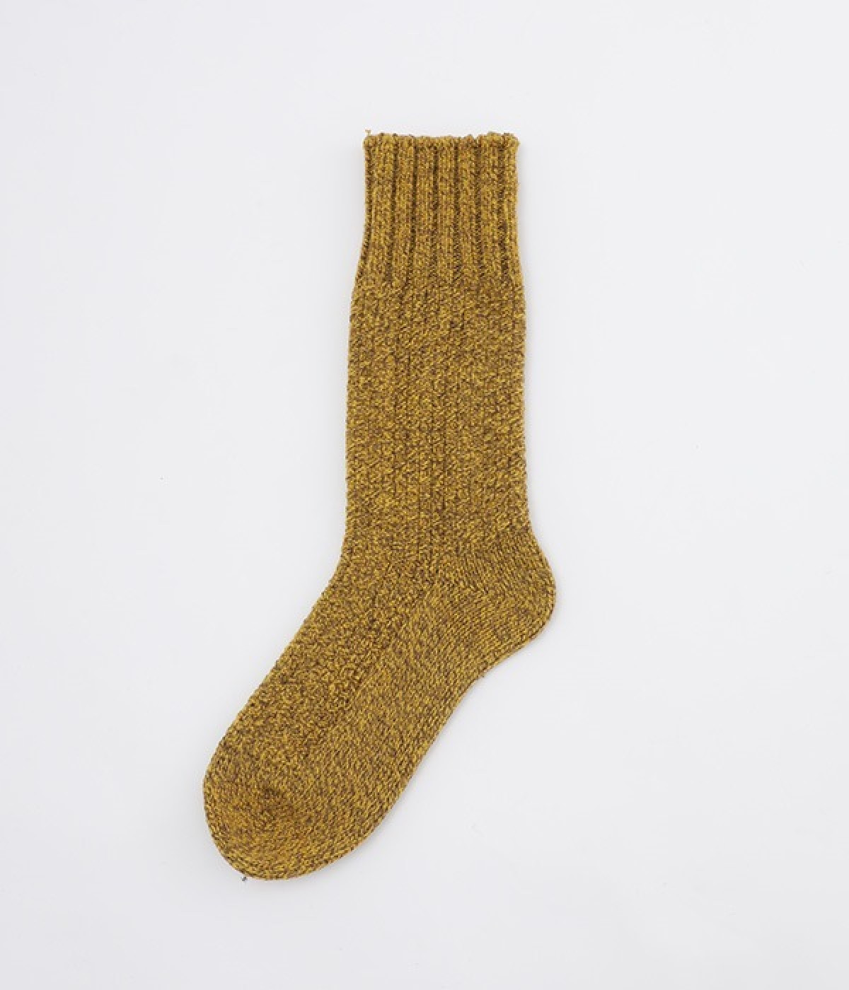 リサイクルウールとコットンをブレンドした、環境にやさしい厚手のソックス。通常のウールより丈夫なので、キャンプやトレッキングなどのアクティブな日にもおすすめです。履き口は長めのリブ編みで引き締めてすっきりと見せ、ずり落ちにくさもプラス。ナチュラルなアースカラーもアウトドアシーンになじみます。