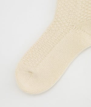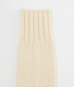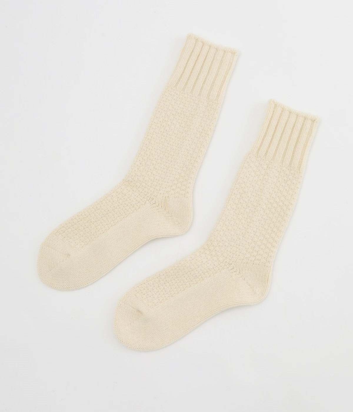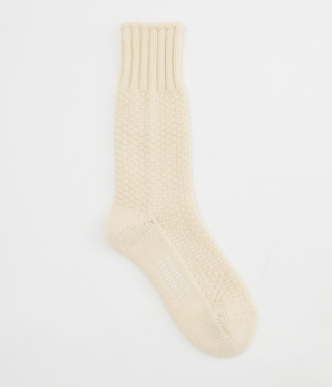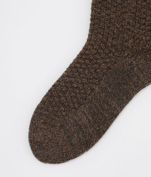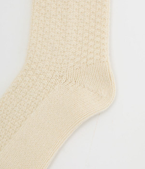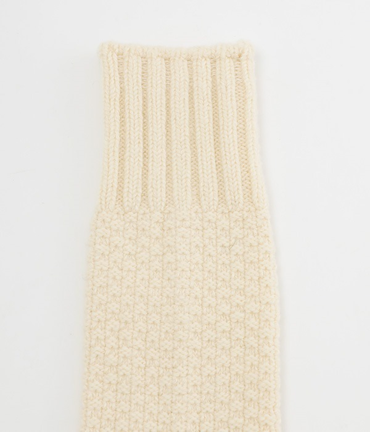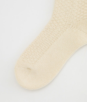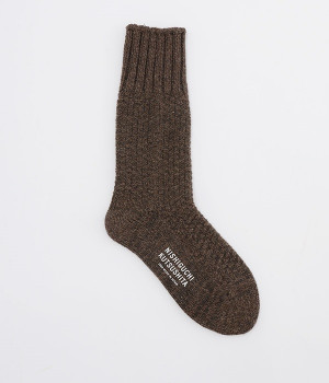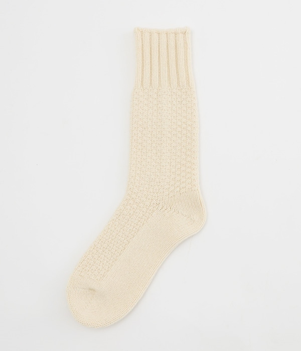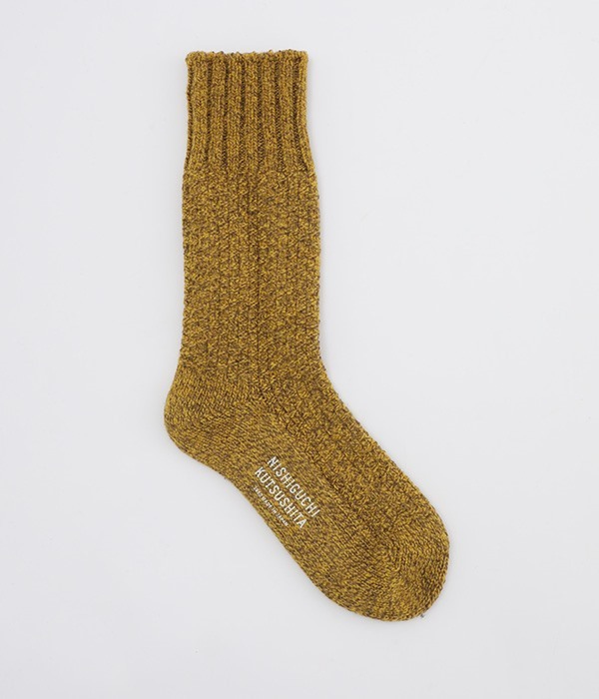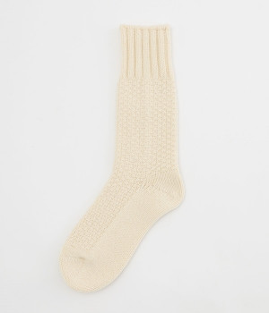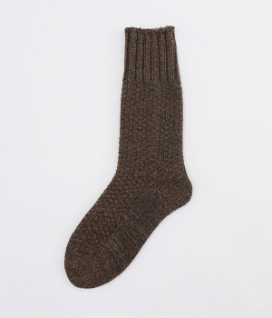 リサイクルウールとコットンをブレンドした、環境にやさしい厚手のソックス。通常のウールより丈夫なので、キャンプやトレッキングなどのアクティブな日にもおすすめです。履き口は長めのリブ編みで引き締めてすっきりと見せ、ずり落ちにくさもプラス。ナチュラルなアースカラーもアウトドアシーンになじみます。