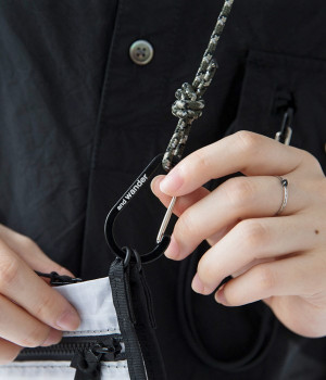 女優・麻生久美子さんと、機能性とデザイン性の高さで注目を集める「and wander(アンドワンダー)」のコラボアイテム。「もっとアウトドアが楽しくなる、おしゃれなウェアがほしい」という麻生さんの願いを叶えるべく、機能的でスタイリッシュなアーバンアウトドアアイテムが誕生しました。素材の異なるふたつのポーチをカラビナでつなげたサコッシュ。ひとつはメッシュ素材、もうひとつは特殊な樹脂でコーティングした、軽くて強度の高い「スピンネーカークロス」を使用。イラスト部分にリフレクターが使われていて、暗闇で光るのがポイントです。カラビナ付きなので、サコッシュとしてだけではなくバッグにぶら下げるなど、アイデア次第で使い方のアレンジも利くひと品です。