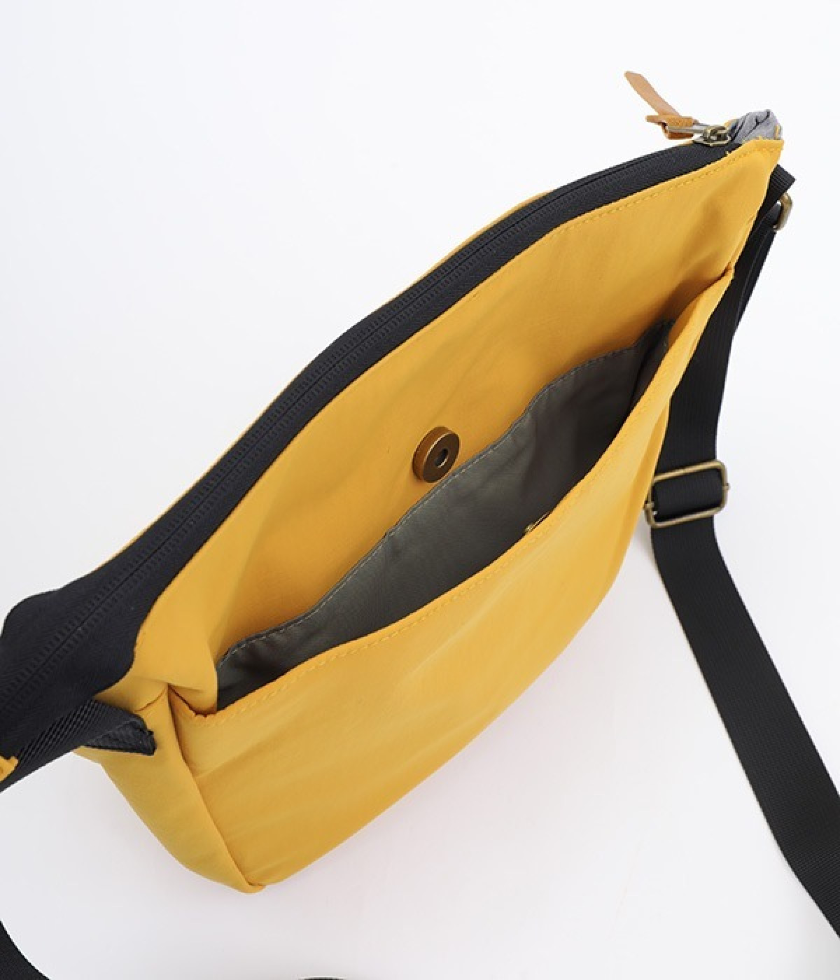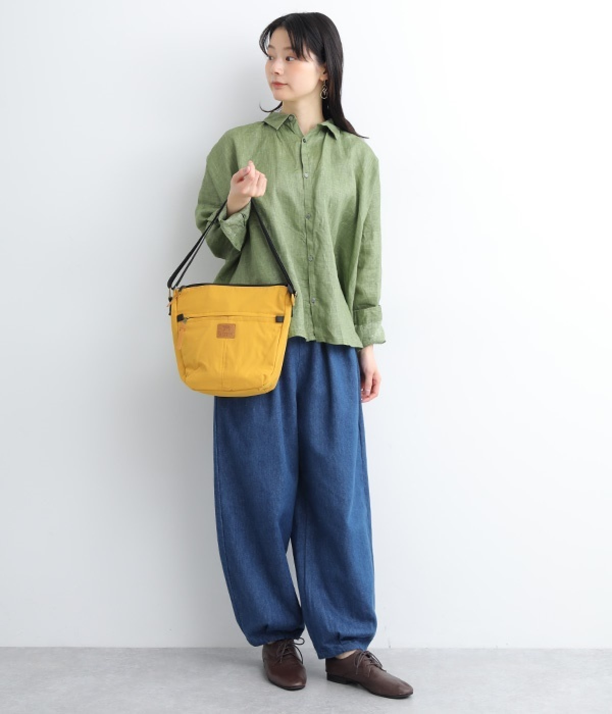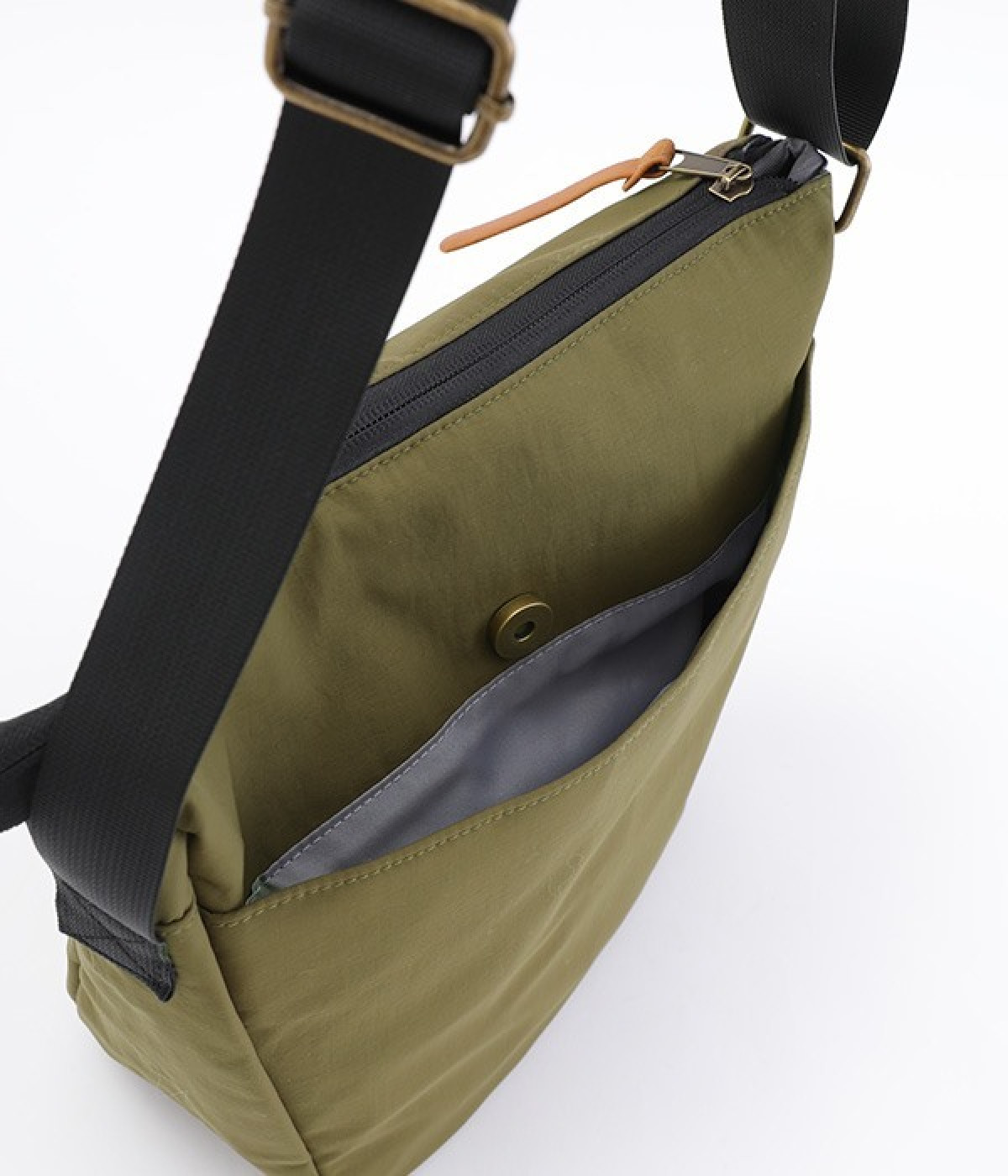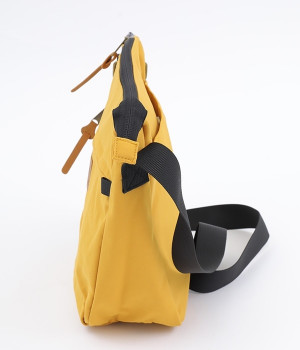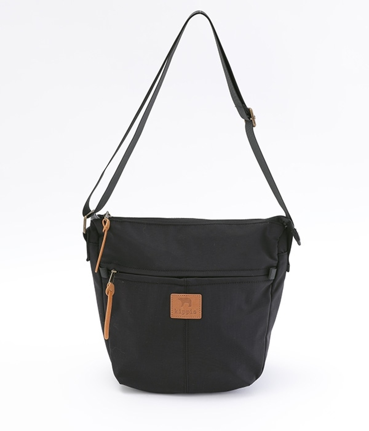 大きすぎず小さすぎず、長財布やペットボトル、ポーチなどお出かけの荷物が収まるショルダーバッグ。逆台形で開口部が広々としているため、荷物を取り出しやすいつくりです。本革風のラベルや引き手、ステッチワークでシンプルながらもクラフト調のぬくもりを感じさせるデザイン。ショルダーストラップを短くして肩掛けに、長くしてクロスボディにと持ち方のアレンジも自在です。
