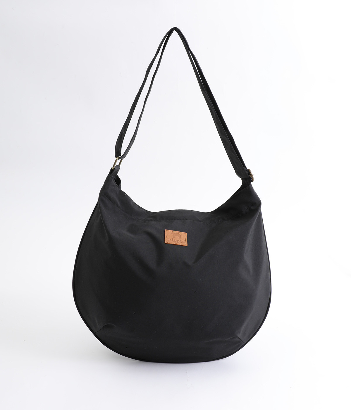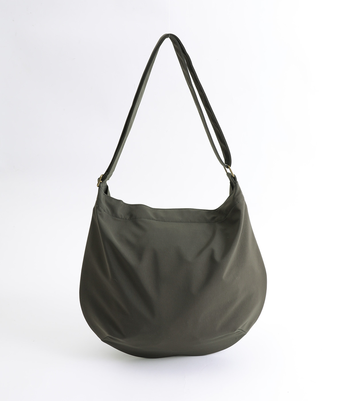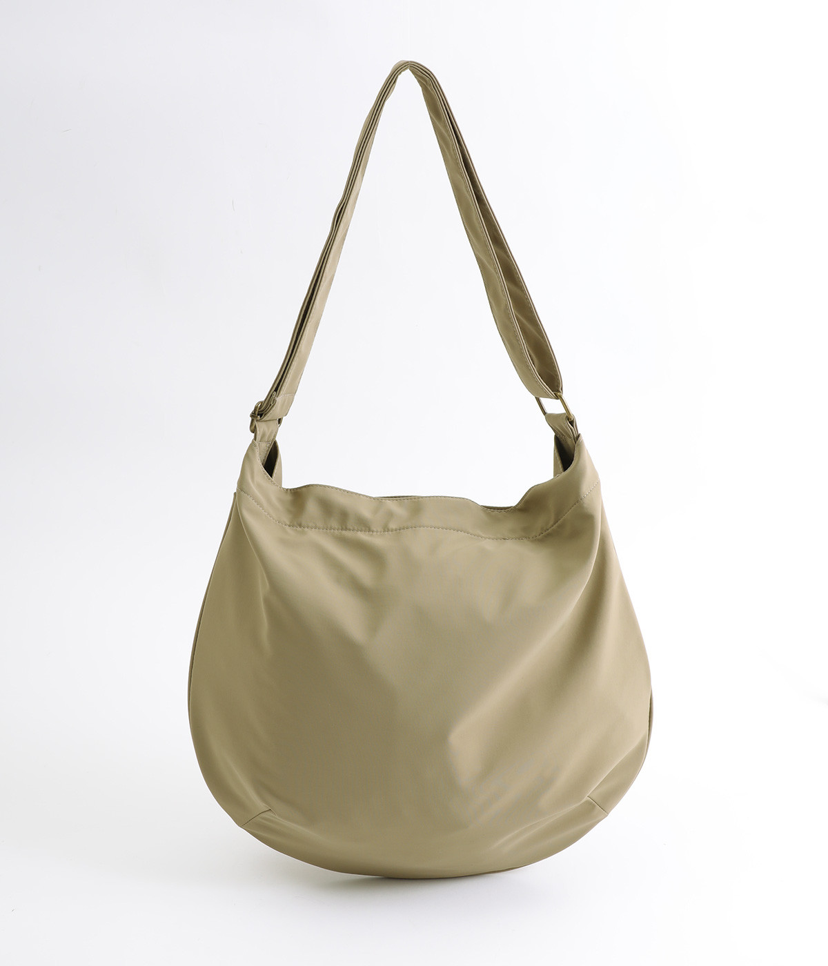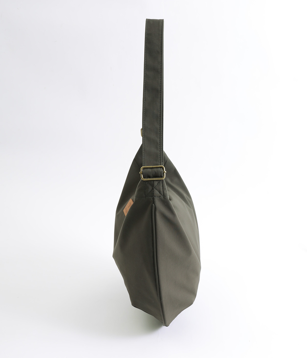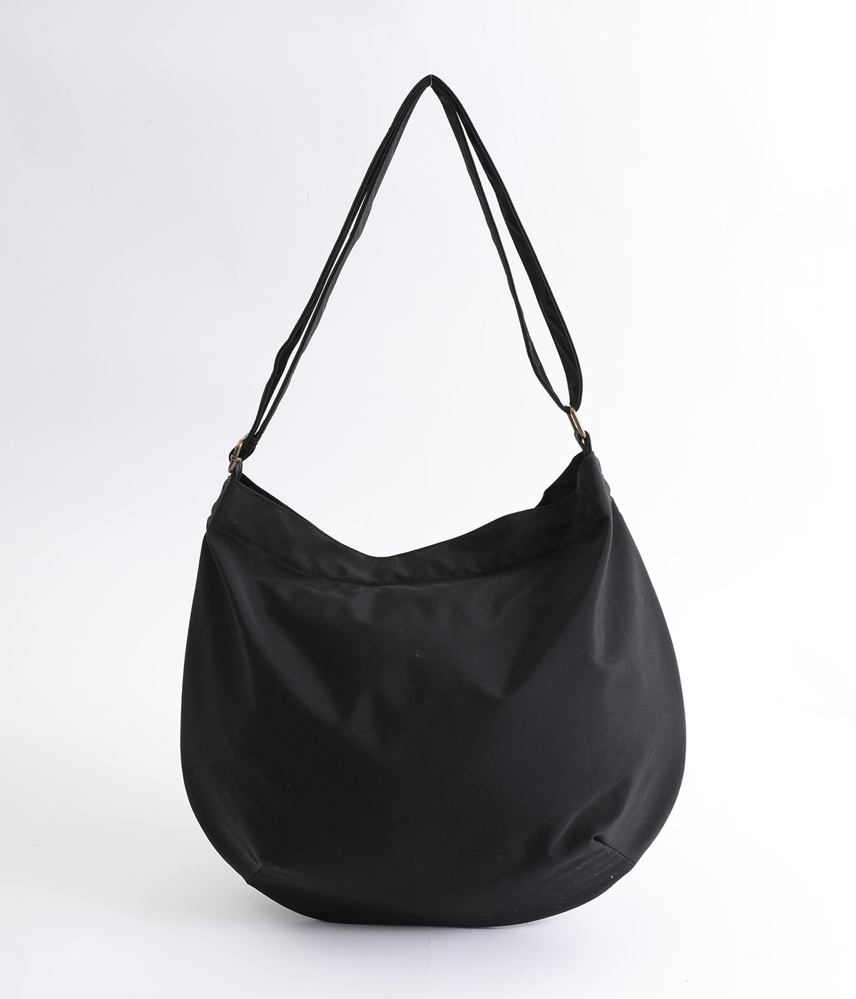 ナイロンの質感が大人っぽいバルーンショルダー。しっかりと縁取りをすることで、型崩れしにくい仕様に。バッグ底に荷物が溜まらないように、内ポケットを少し上側につけるなど、細部までこだわった作りです。開口部はスナップボタン式。肩ヒモの長さの調整で、肩掛けにも斜めがけにも対応します。