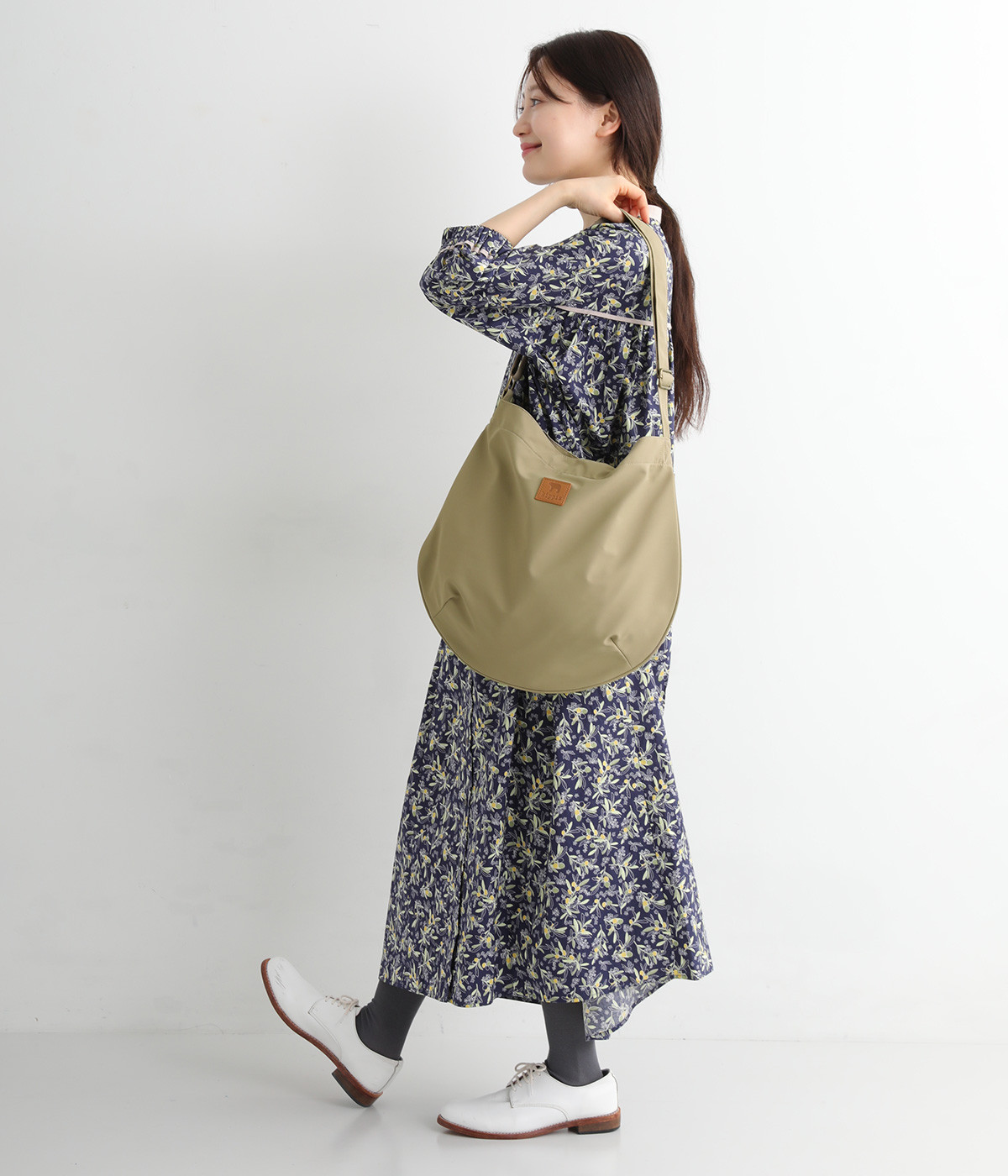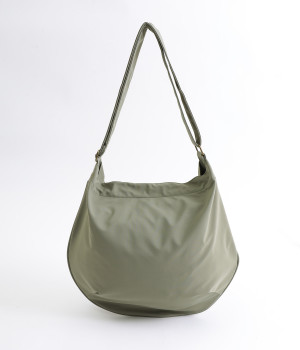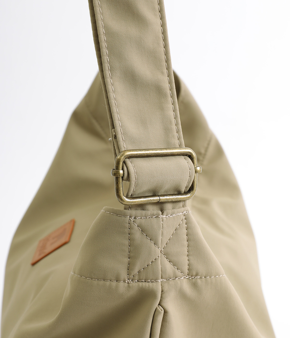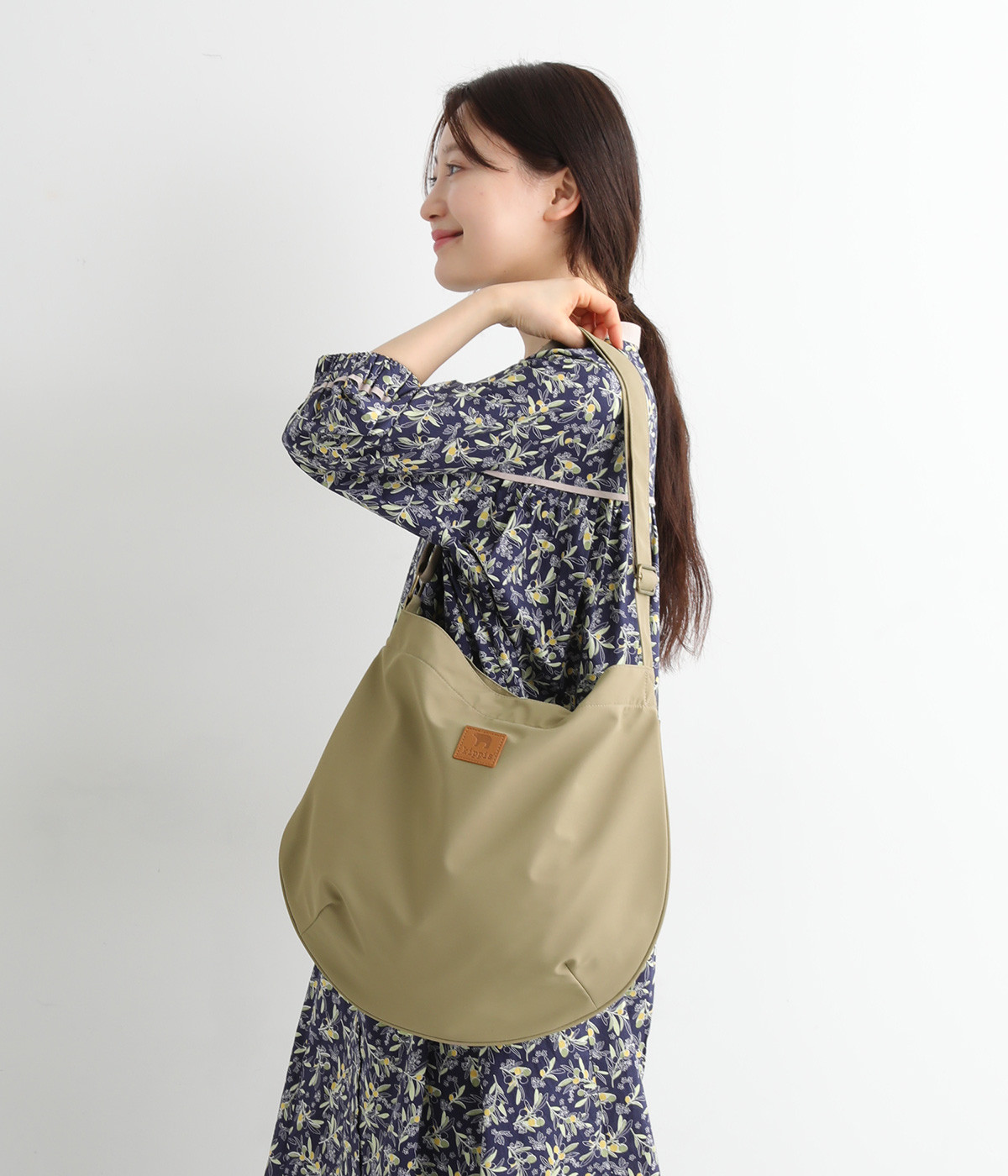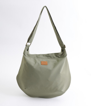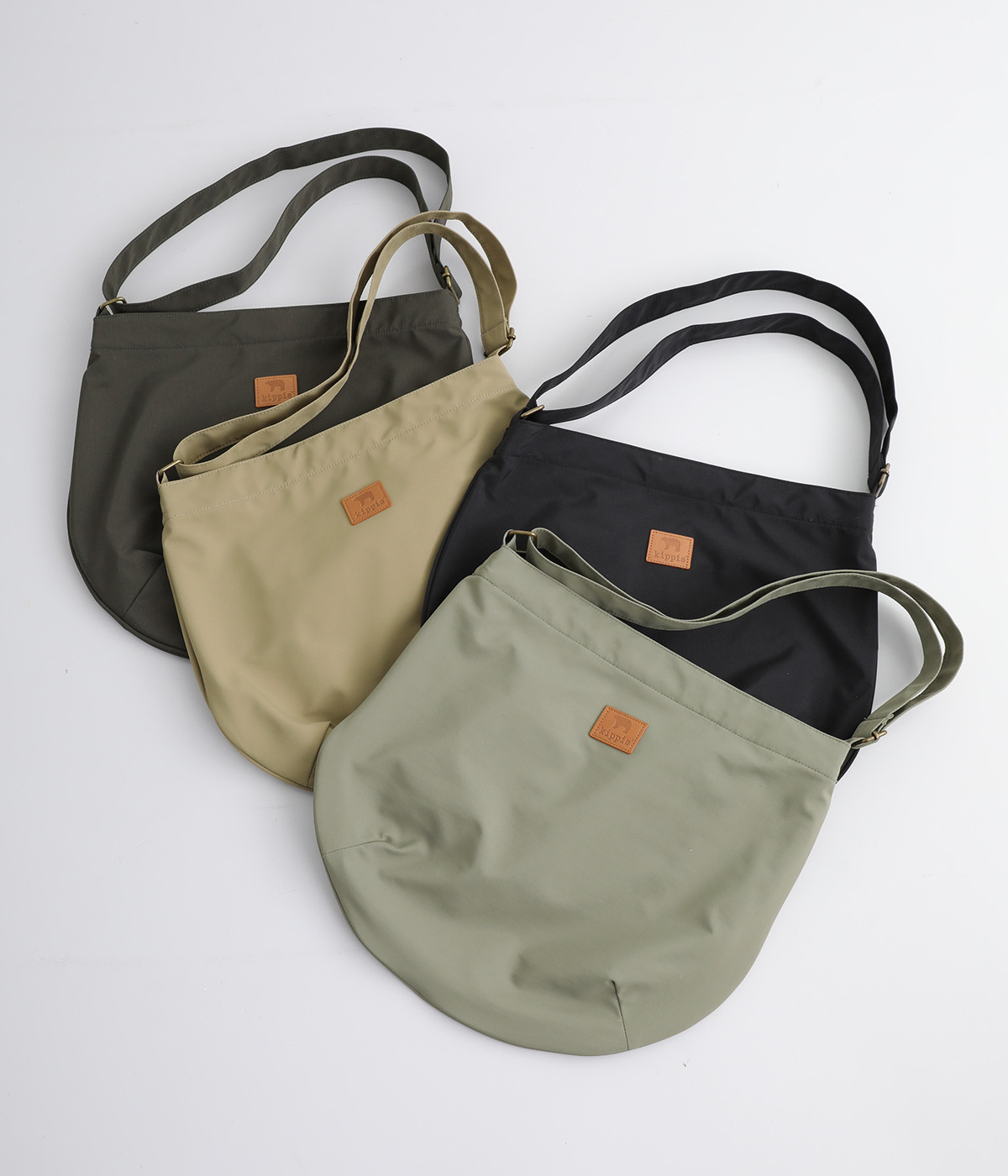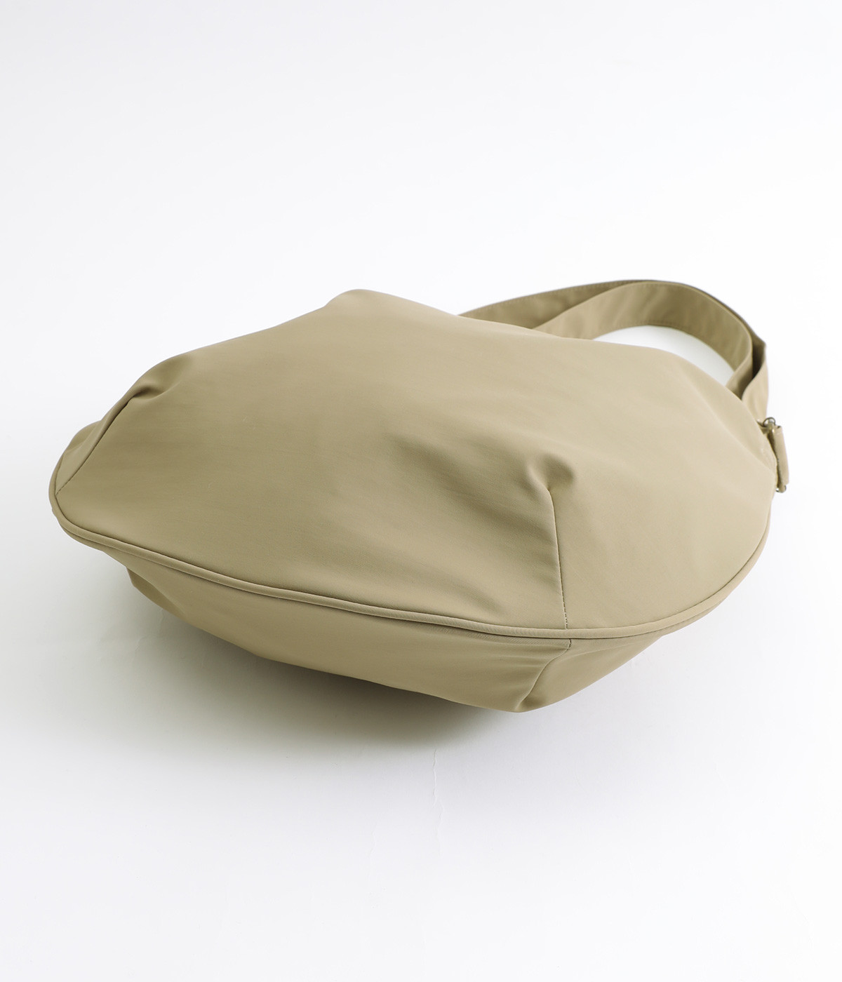 ナイロンの質感が大人っぽいバルーンショルダー。しっかりと縁取りをすることで、型崩れしにくい仕様に。バッグ底に荷物が溜まらないように、内ポケットを少し上側につけるなど、細部までこだわった作りです。開口部はスナップボタン式。肩ヒモの長さの調整で、肩掛けにも斜めがけにも対応します。