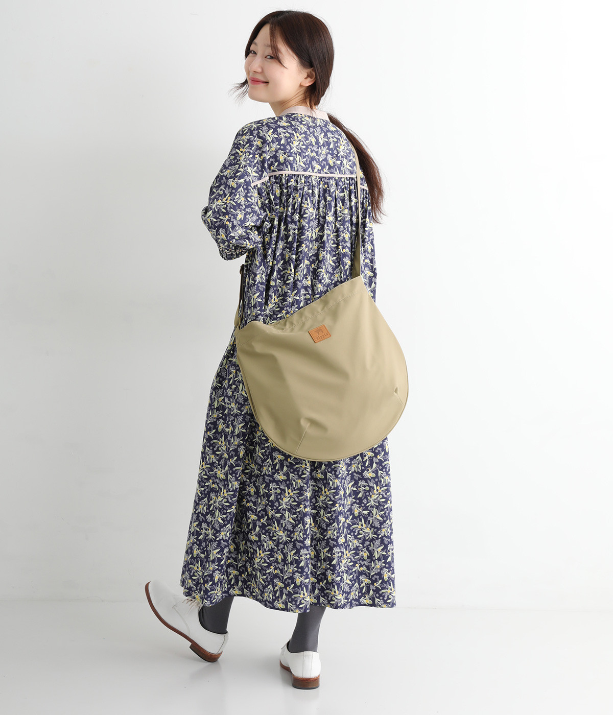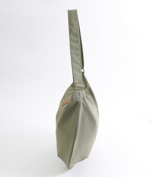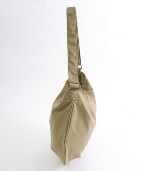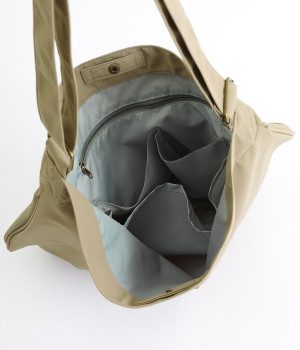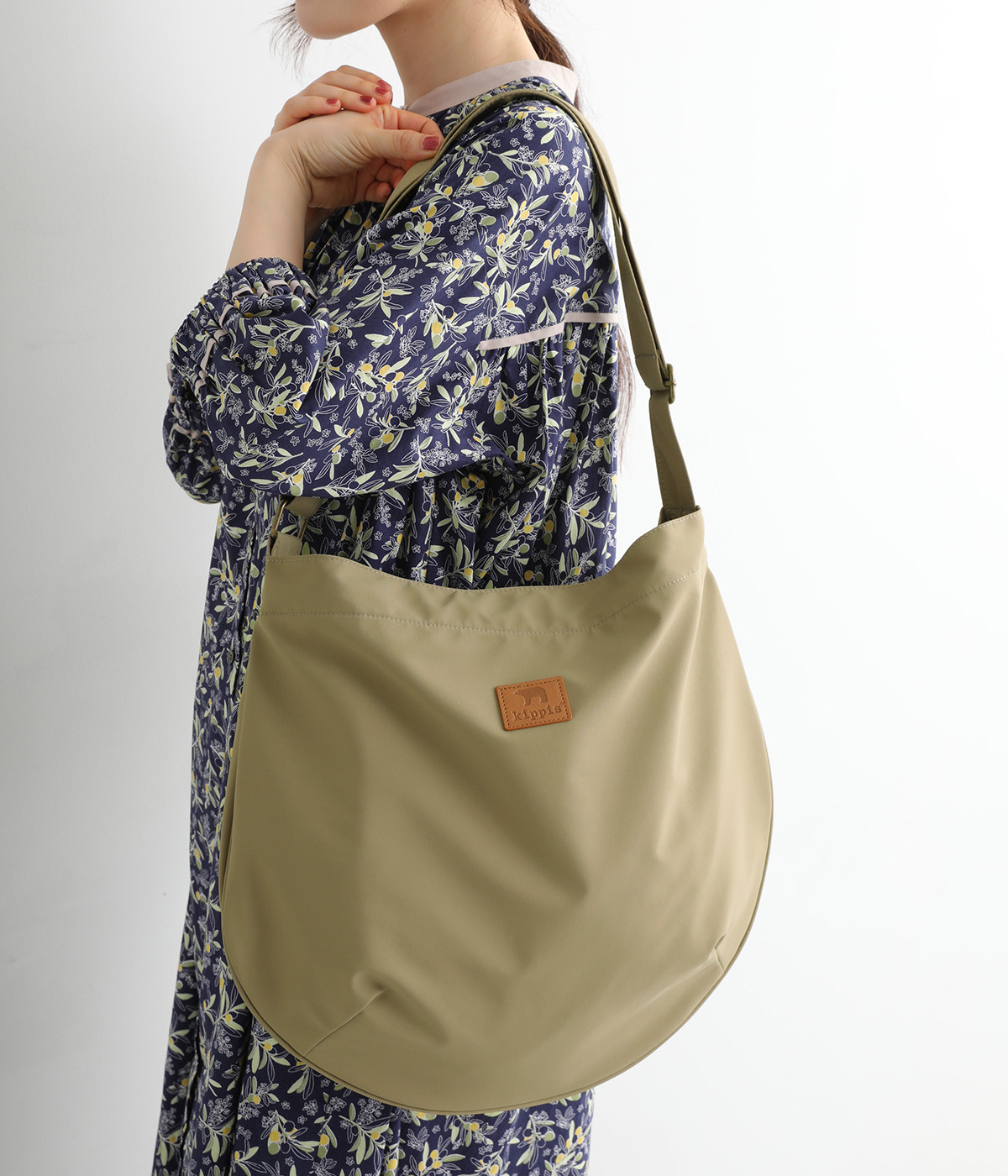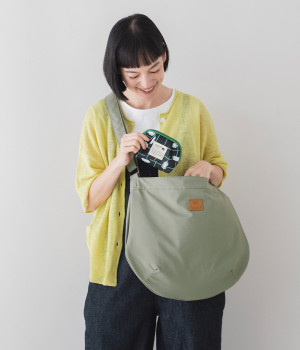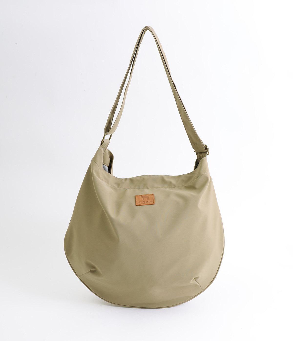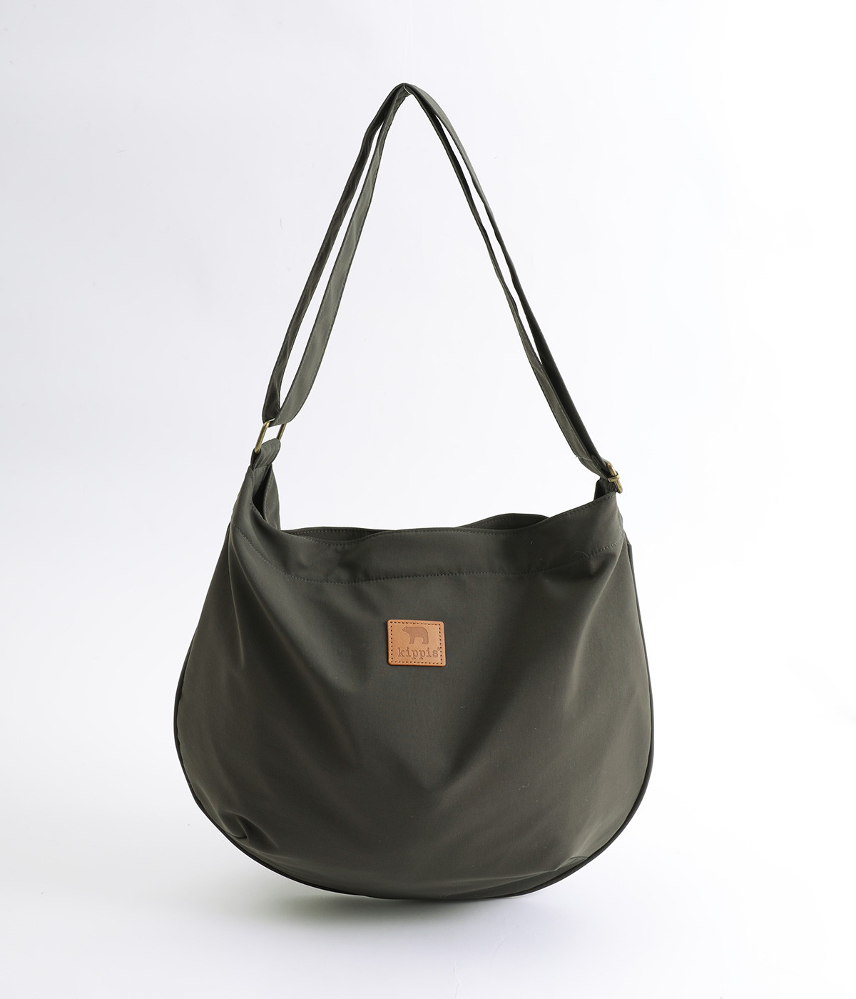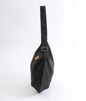 ナイロンの質感が大人っぽいバルーンショルダー。しっかりと縁取りをすることで、型崩れしにくい仕様に。バッグ底に荷物が溜まらないように、内ポケットを少し上側につけるなど、細部までこだわった作りです。開口部はスナップボタン式。肩ヒモの長さの調整で、肩掛けにも斜めがけにも対応します。