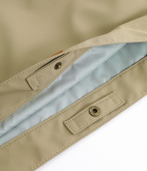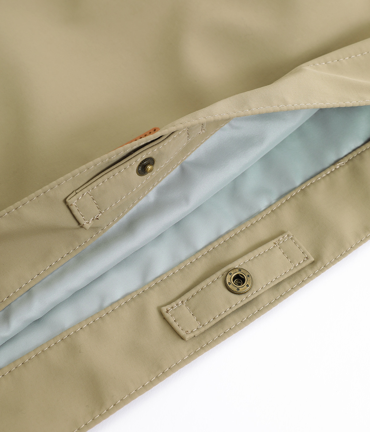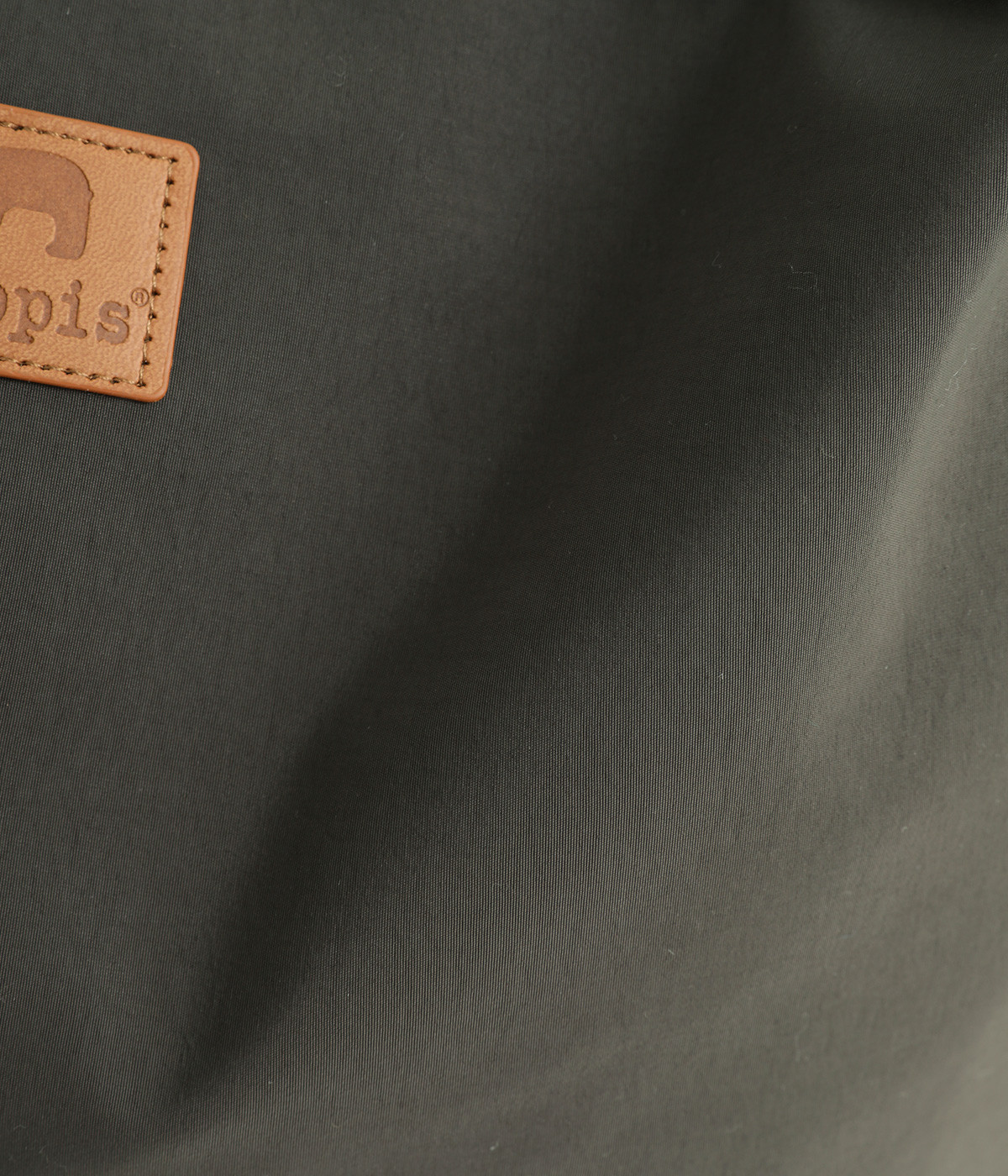 表地はほどよい厚みをもたせたナイロン。裏地にはポリエステルを使用した、丈夫で扱いやすい生地。撥水加工を施しているので、天候を気にせず使えます。