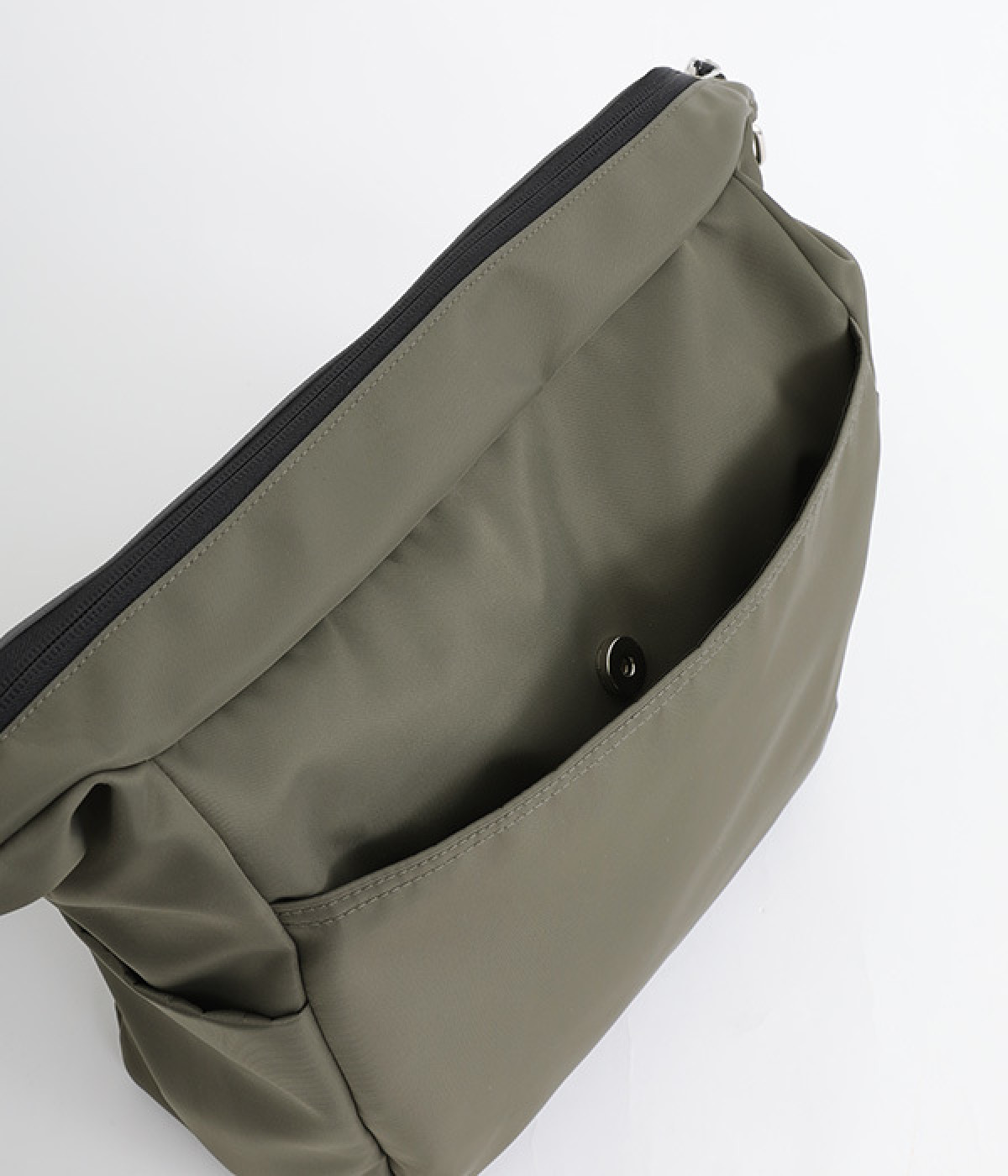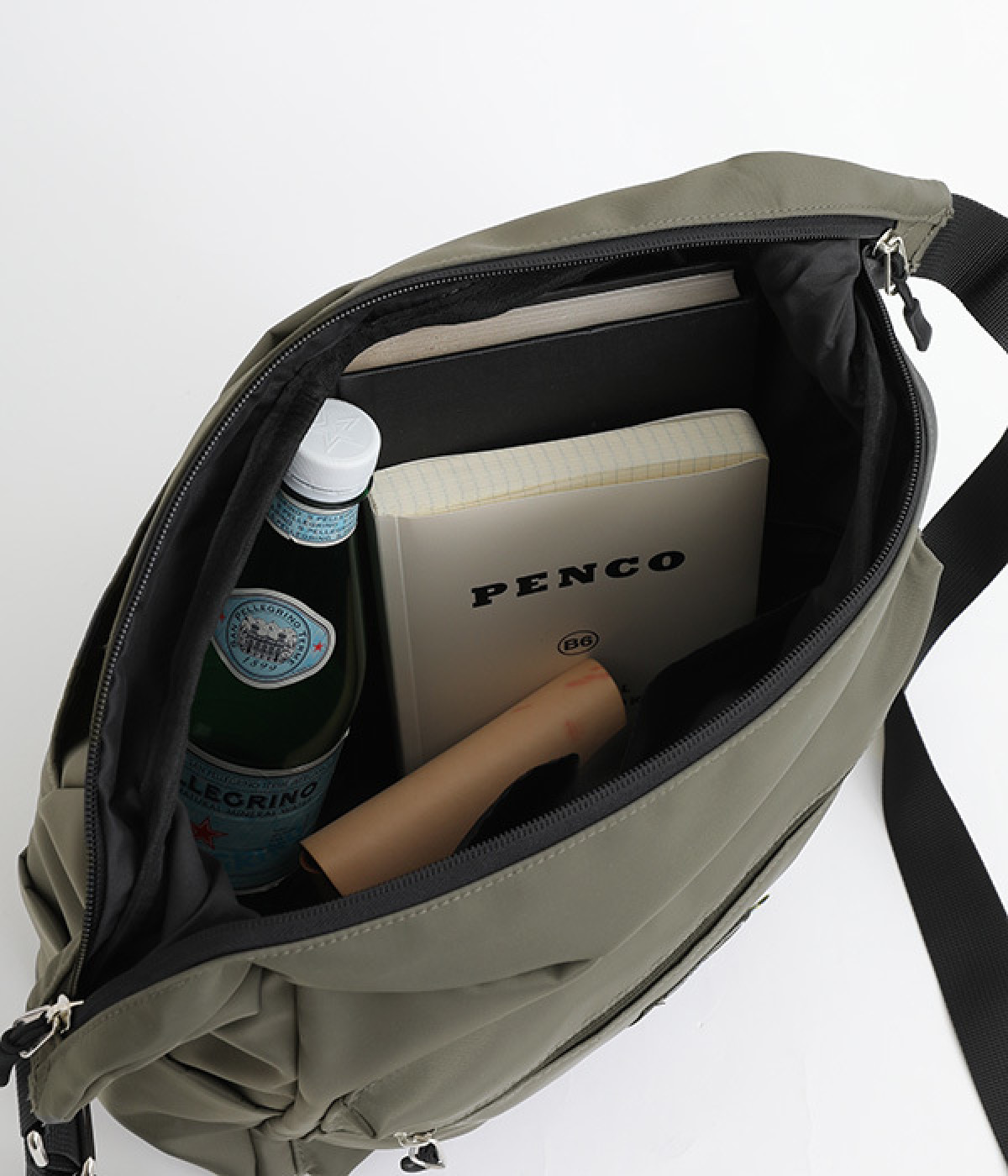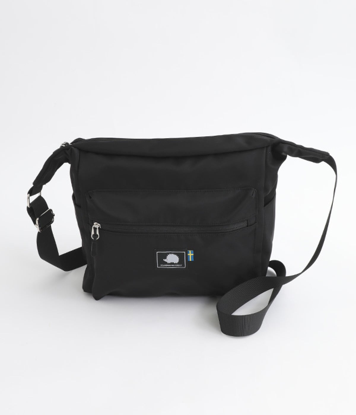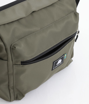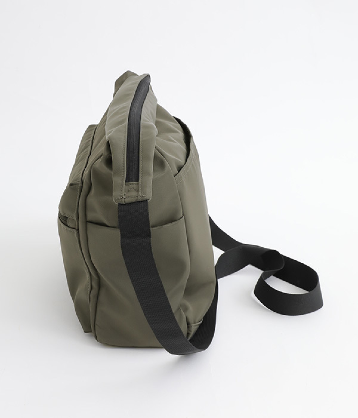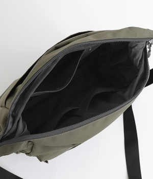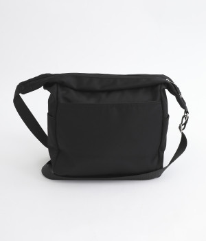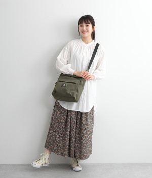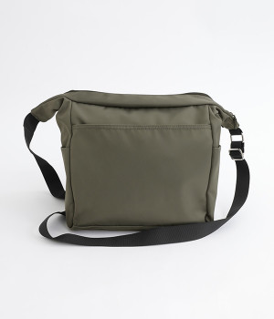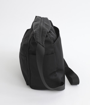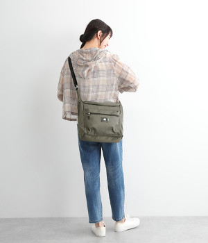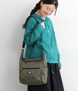 厚手の撥水ナイロン素材を使用したショルダーバッグ。しっかりとしたタフな生地感で、荷物が少ない日でも型くずれしにくく、きれいな形をキープします。薄型ながらマチつきで安定感があり、収納力も抜群。お出かけの必需品はもちろん、500mlのペットボトルやお弁当なども収まります。内外ともにポケットを多数備えた機能性の高さも自慢。ストラップはその日の気分や着こなしに合わせて長さの調整が可能です。